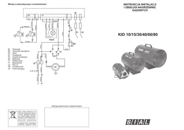 Wersja z automatycznym uruchamianiem INSTRUKCJA INSTALACJI I OBS£UGI NAGRZEWNIC GAZOWYCH KID 10/15/30/40/60/80 B1 B2 M1 Q1 S1 S2 Y1 F1 LC TR CF Termostat Termostat zewnêtrzny Silnik Prze³¹cznik Czujnik jonizacyjny Elektroda Elektrozawór Bezpiecznik Filtr LC Transformator Panel steruj¹cy Obs³uga gwarancyjna i pogwarancyjna: Zu¿yty sprzêt elektryczny nie mo¿e byæ umieszczany ³¹cznie z innymi odpadami komunalnymi. Sprzêt podlega selektywnej zbiórce i recyklingowi w wyznaczonych punktach. Obecnoœæ sk³adników n i e b e z p i e c z n y c h w sprzêcie mo¿e potencjalnie powodowaæ negatywne skutki 7. Schemat elektryczny Spis treœci 1. Instrukcja ogólna 2. Instalacja 3. Instrukcja u¿ytkowania 3.1 Uruchomienie 3.2 Wy³¹czenie 3.3 Wentylacja 4. Konserwacja 5. Ewentualne usterki 6. Dane techniczne 7. Schemat elektryczny 2 3 3 4 4 5 5 6 7 Wersja z rêcznym uruchamianiem 10kW, 15kW, 31kW, 43kW B1 G1 M1 Q1 Q2 S1 S2 Y1 Termostat Elektrozawór Silnik Prze³¹cznik Zapalarka Elektroda Termoelement Elektrozawór 1. Instrukcja ogólna Nagrzewnice, o których mowa w tej instrukcji mog¹ byæ u¿ytkowane wy³¹cznie na zewn¹trz lub w wentylowanych pomieszczeniach (takich jak: magazyny, fermy hodowlane, tunele, szklarnie). < Na ka¿dy kilowat mocy wyjœciowej niezbêdna jest równa liczba otworów wentylacyjnych o powierzchni co najmniej 25 cm2 rozmieszczonych równomiernie u góry i u do³u pomieszczenia. Minimalna ³¹czna powierzchnia otworów wentylacyjnych powinna wynosiæ 250 cm2. < Butle z gazem musz¹ byæ przechowywane i u¿ywane zgodnie z obowi¹zuj¹cymi dla nich normami. < Nigdy nie kieruj gor¹cego powietrza w kierunku butli z gazem < U¿ywaj wy³¹cznie regulatorów dostarczonych z nagrzewnic¹. < Nie u¿ywaj nagrzewnicy przy zdjêtej obudowie. 3 < Nie u¿ywaj nagrzewnicy do ogrzewania pomieszczeñ o kubaturze poni¿ej 100 m . < Nie wolno zas³aniaæ wlotu i wylotu nagrzewnicy. < Nagrzewnice, o których mowa w tej instrukcji mog¹ byæ u¿ytkowane wy³¹cznie na zewn¹trz lub w wentylowanych pomieszczeniach (takich jak: magazyny, fermy hodowlane, tunele, szklarnie). < Jeœli nagrzewnica musi pracowaæ d³u¿szy czas z pe³n¹ moc¹ mo¿liwe jest oszranianie siê butli. Jest to zwi¹zane ze zbyt szybkim odparowywaniem gazu. Niedozwolone jest wówczas ogrze-wanie butli przez skierowanie strumienia gor¹cego p o w i e t r z a z nagrzewnicy. Zaleca siê natomiast stosowanie wiêkszej butli lub dwóch butli po³¹czonych razem (rys. 1). < 2 Wersja z rêcznym uruchamianiem 58kW-82kW B1 G1 M1 Q1 Q2 S1 S2 Y1 C1 Termostat Elektrozawór Silnik Prze³¹cznik Zapalarka Elektroda Termoelement Elektrozawór Kondensator 7 Modele uruchamiane automatycznie PROBLEM Silnik nie pracuje Silnik pracuje, ale palnik nie zapala siê i po kilku sekundach nagrzewnica wy³¹cza siê Palnik zapala siê, ale po kilku sekundach gaœnie Nagrzewnica zatrzymuje siê podczas pracy PRZYCZYNA Brak pr¹du Termostat jest ustawiony na zbyt nisk¹ temperaturê Termostat zabezpieczaj¹cy jest w³¹czony Zakrêcony dop³yw gazu Butla z gazem jest pusta Dysza jest zatkana Elektrozawór gazowy nie jest otwarty Brak iskry Brak uziemienia Z³e po³¹czenie pomiêdzy termoelementem a termostatem Uszkodzone zabezpieczenie Nadmierny dop³yw gazu Niewystarczaj¹cy dop³yw powietrza Niewystarczaj¹ce odparowanie gazu spowodowane szronieniem siê butli < ROZWI¥ZANIE SprawdŸ próbnikiem zasilanie Wyreguluj termostat < Poczekaj minutê i naciœnij guzik RESET < Odkrêæ regulator Wymieñ butlê Wyjmij dyszê i wyczyœæ SprawdŸ czy elektrozawór pracuje SprawdŸ ustawienie elektrody SprawdŸ i po³¹cz poprawnie SprawdŸ i po³¹cz poprawnie < Wymieñ na nieuszkodzony SprawdŸ reduktor ciœnienia i ewentualnie wymieñ go SprawdŸ czy silnik wentylatora dzia³a poprawnie SprawdŸ i ewentualnie u¿yj wiêkszej butli lub dwóch po³¹czonych równolegle. < < < < < < < < < 6. Dane techniczne KID10 KID15 Maksymalna moc grzania (kW) 10 17.5 Minimalna moc grzania (kW) Zu¿ycie gazu (kg/h) 0.8 1.4 Ciœnienie gazu (bar) 0.3 Wydajnoœæ wentylatora (m3/h) 300 Dysza ( mm) Rodzaj gazu Napiêcie (V) Moc pobierana (W) Ciê¿ar (kg) KID30 KID40 KID60 KID80 2. Instalacja 31.2 43.5 58.5 82.1 12.4 26.6 26.9 35.8 < 2.82 - 6.48 < 0.7 0.98 - 2.46 2.10 - 3.43 2.12 4.61 1.5 2.0 2.0 2.0 300 750 850 1800 2450 0.90 1.00 1.15 PROPAN PROPAN- BUTAN 230V/50Hz 1.30 1.50 1.85 50 5 90 13 110 20 130 23 50 6 90 12 Nie wolno u¿ywaæ nagrzewnicy w piwnicach lub w jakimkolwiek pomieszczeniu poni¿ej poziomu gruntu. W przypadku nieprawid³owego dzia³ania nale¿y skontaktowaæ siê z autoryzowanym serwisem. Pomiêdzy nagrzewnic¹ a butl¹ musi byæ zainstalowany odpowiedni zawór. Wymiana butli musi byæ zawsze zgodna z zasadami bezpieczeñstwa i przy ca³kowicie wygaszonym p³omieniu. Przewód gazowy nie mo¿e byæ zwiniêty lub zagiêty. Nagrzewnica nie mo¿e byæ u¿ywana w pobli¿u materia³ów ³atwopalnych. Aby unikn¹æ kontaktu z materia³ami ³atwopalnymi w odleg³oœci 3m od wylotu nagrzewnicy powinien byæ ustawiony specjalny ekran ochronny. Nale¿y u¿ywaæ wy³¹cznie oryginalnego przewodu gazowego i oryginalnych czêœci zamiennych. Nagrzewnice nie nadaj¹ siê do u¿ytku w pomieszczeniach mieszkalnych. W razie stwierdzenia wycieku gazu nale¿y natychmiast odci¹æ odp³yw gazu do urz¹dzenia. Projekt systemu ogrzewania powinien byæ uzgodniony ze Stra¿¹ Po¿arn¹ oraz w przypadku ferm hodowlanych ze s³u¿b¹ weterynaryjn¹. Przewód gazowy (jeœli zostanie wymieniony) musi posiadaæ deklaracjê zgodnoœci producenta "CE". Nagrzewnice musz¹ byæ wykorzystywane zgodnie z polskimi przepisami dotycz¹cymi stosowania gazu p³ynnego. Zaleca siê, aby pierwsze uruchomienie dokonane zosta³o przez osobê przeszkolon¹ w zakresie urz¹dzeñ oraz instalacji gazowych. < < < W³ó¿ wtyczkê do gniazda 230V/50Hz. Upewnij siê, ¿e urz¹dzenie jest uziemione. Po³¹cz przewód gazowy z regulatorem gazowym i regulator z butl¹. Otwórz zawór butli gazow