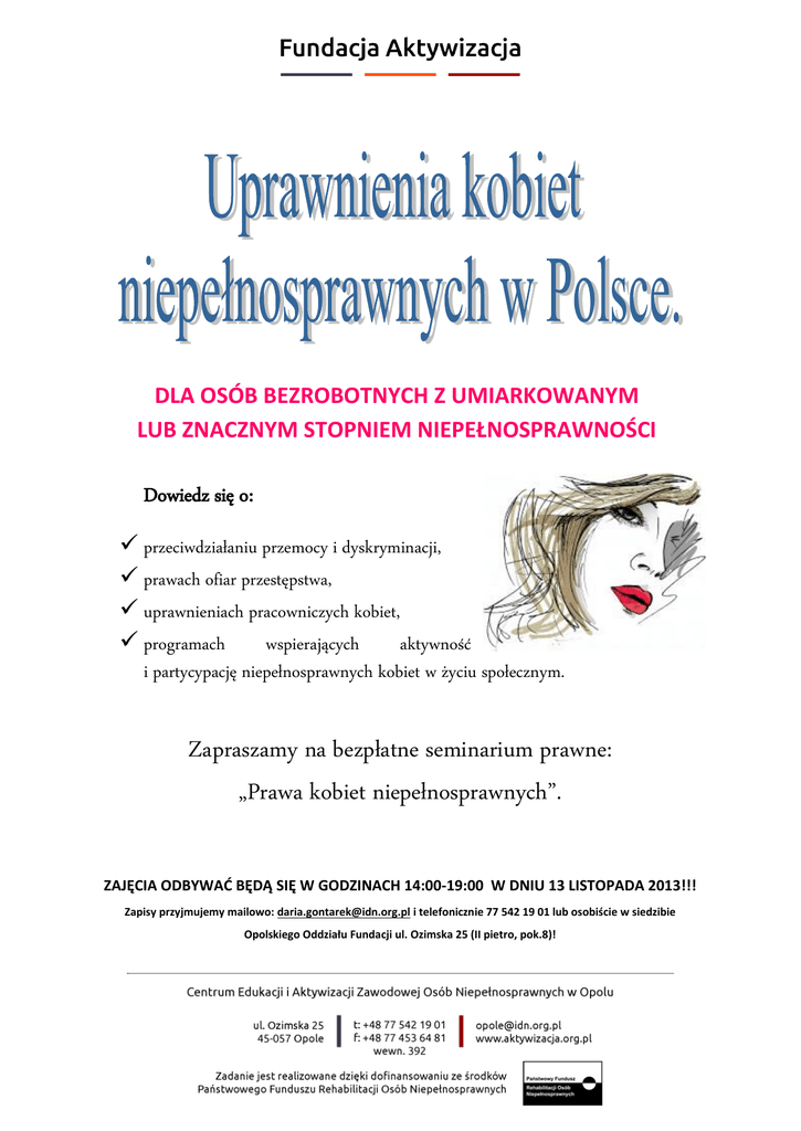 DLA OSÓB BEZROBOTNYCH Z UMIARKOWANYM LUB ZNACZNYM STOPNIEM NIEPEŁNOSPRAWNOŚCI Dowiedz się o: przeciwdziałaniu przemocy i dyskryminacji, prawach ofiar przestępstwa, uprawnieniach pracowniczych kobiet, programach wspierających aktywność i partycypację niepełnosprawnych kobiet w życiu społecznym. Zapraszamy na bezpłatne seminarium prawne: „Prawa kobiet niepełnosprawnych”. ZAJĘCIA ODBYWAĆ BĘDĄ SIĘ W GODZINACH 14:00-19:00 W DNIU 13 LISTOPADA 2013!!! Zapisy przyjmujemy mailowo: [email protected] i telefonicznie 77 542 19 01 lub osobiście w siedzibie Opolskiego Oddziału Fundacji ul. Ozimska 25 (II pietro, pok.8)! Siedziba Główna; ul. Wiśniowa 40b lok.8; 02-520 Warszawa; telefon: 22 697 87 84; fax: 22 697; e-mail: [email protected]; www.aktywizacja.org.pl; KRS: 0000049694; NIP: 527-13-11-973; REGON: 006229672