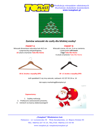Produkcja wieszaków odzieżowych Hurtownie dodatków krawieckich www.tomplast.pl Zamów wieszaki do szafy dla bliskiej osoby! PAKIET A PAKIET B Wieszaki drewniane naturalne buk 44,5 cm z poprzeczką antypoślizgową 10 sztuk w kartonie Take Me Home Wieszaki czarne, 42 cm, 3 cm w ramieniu z pokryciem soft touch i logo Take Me Home 6 sztuk w kartonie Take Me Home 69 zł. brutto z wysyłką DPD 39 zł. brutto z wysyłką DPD Jeśli spodobał Ci się inny wieszak, zadzwoń: 42 227 45 24 w. 14 lub napisz [email protected] Zapewniamy: 1. Szybką realizację 2. Praktyczne zastosowanie prezentu 3. Uśmiech na twarzy obdarowanego☺ „Tomplast” Włodzimierz Łoś: Pabianice – ul. Lutomierska 48 Wola Zaradzyńska, ul. Majora Hubala 90 TEL: 48(042) 227 45 24, TEL/FAX: 48(042) 215 50 98 www.tomplast.pl; [email protected]