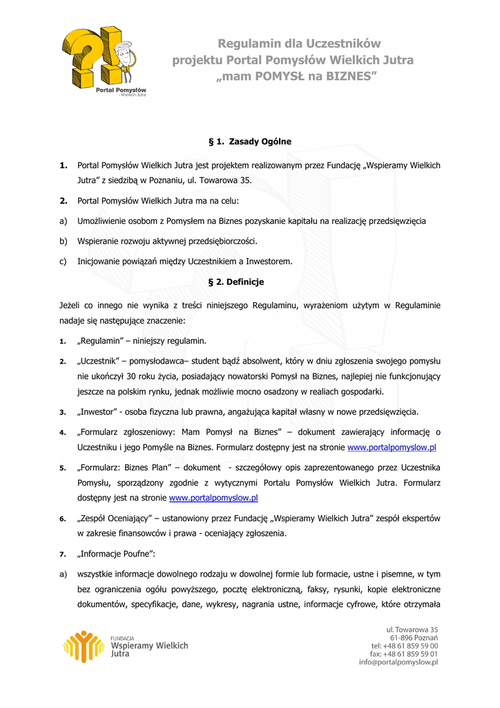 Regulamin dla Uczestników projektu Portal Pomysłów Wielkich Jutra „mam POMYSŁ na BIZNES” § 1. Zasady Ogólne 1. Portal Pomysłów Wielkich Jutra jest projektem realizowanym przez Fundację „Wspieramy Wielkich Jutra” z siedzibą w Poznaniu, ul. Towarowa 35. 2. Portal Pomysłów Wielkich Jutra ma na celu: a) Umożliwienie osobom z Pomysłem na Biznes pozyskanie kapitału na realizację przedsięwzięcia b) Wspieranie rozwoju aktywnej przedsiębiorczości. c) Inicjowanie powiązań między Uczestnikiem a Inwestorem. § 2. Definicje Jeżeli co innego nie wynika z treści niniejszego Regulaminu, wyrażeniom użytym w Regulaminie nadaje się następujące znaczenie: 1. „Regulamin” – niniejszy regulamin. 2. „Uczestnik” – pomysłodawca– student bądź absolwent, który w dniu zgłoszenia swojego pomysłu nie ukończył 30 roku życia, posiadający nowatorski Pomysł na Biznes, najlepiej nie funkcjonujący jeszcze na polskim rynku, jednak możliwie mocno osadzony w realiach gospodarki. 3. „Inwestor” - osoba fizyczna lub prawna, angażująca kapitał własny w nowe przedsięwzięcia. 4. „Formularz zgłoszeniowy: Mam Pomysł na Biznes” – dokument zawierający informację o Uczestniku i jego Pomyśle na Biznes. Formularz dostępny jest na stronie www.portalpomyslow.pl 5. „Formularz: Biznes Plan” – dokument - szczegółowy opis zaprezentowanego przez Uczestnika Pomysłu, sporządzony zgodnie z wytycznymi Portalu Pomysłów Wielkich Jutra. Formularz dostępny jest na stronie www.portalpomyslow.pl 6. „Zespół Oceniający” – ustanowiony przez Fundację „Wspieramy Wielkich Jutra” zespół ekspertów w zakresie finansowców i prawa - oceniający zgłoszenia. 7. „Informacje Poufne”: a) wszystkie informacje dowolnego rodzaju w dowolnej formie lub formacie, ustne i pisemne, w tym bez ograniczenia ogółu powyższego, pocztę elektroniczną, faksy, rysunki, kopie elektroniczne dokumentów, specyfikacje, dane, wykresy, nagrania ustne, informacje cyfrowe, które otrzymała Regulamin dla Uczestników projektu Portal Pomysłów Wielkich Jutra „mam POMYSŁ na BIZNES” Fundacja Wspieramy Wielkich Jutra od Uczestnika, a które dotyczą Uczestnika lub dowolnej ze spółek zależnych lub stowarzyszonych Uczestnika, lub bardziej ogólnie jego organizacji lub polityki strategicznej, finansowej, prawnej, handlowej lub innej, b) tożsamość osób zaangażowanych w przedsięwzięcie będących doradcami, personelem (w tym personelem spółek zależnych i stowarzyszonych strony ujawniającej lub dowolnej strony, z którą strona ujawniająca zamierza się połączyć w kontekście przedsięwzięcia), c) istnienie, treść, charakter, postępy i ewolucja przedsięwzięcia, d) treści, dane oraz koncepcje Inwestora dotyczące inwestycji. § 3. Status Uczestnika 1. Warunkiem uczestnictwa w Portalu Pomysłów Wielkich Jutra jest zgłoszenie Pomysłu na Biznes. Pomysły mogą zgłaszać studenci bądź absolwenci, którzy w dniu zgłoszenia Pomysłu nie ukończyli 30 roku życia. 2. Z chwila wysłania do Portalu Pomysłów Wielkich Jutra prawidłowo wypełnionego Formularza zgłoszeniowego „Mam Pomysł na Biznes”, Pomysłodawca staje się Uczestnikiem i tym samym akceptuje wszelkie warunki wynikające z niniejszego Regulaminu. 3. Uczestnik zobowiązany jest do przedstawiania danych i informacji zgodnych z prawdą, które to dane i informacje będą weryfikowane – pod względem zgodności ze stanem faktycznym – przez Zespół Oceniający. W przypadku wystąpienia niezgodności po uprzednim uzyskaniu wyjaśnień ze strony Uczestnika - na skutek rekomendacji Zespołu Oceniającego - Fundacja „Wspieramy Wielkich Jutra” może wykluczyć Uczestnika z Portalu Pomysłów Wielkich Jutra. 4. Uczestnik po prawidłowym wypełnieniu i wysłaniu Formularza zgłoszeniowego „Mam Pomysł na Biznes” otrzyma na podany w formularzu zgłoszeniowym adres e-mail kod aktywacyjny, pozwalający na zalogowanie się w systemie Portalu Pomysłów Wielkich Jutra oraz samodzielne śledzenie ścieżki oceny Pomysłu na Biznes. 5. Uczestnikowi przysługuje możliwość wycofania zgłoszenia „Mam Pomysł na Biznes”, po uprzednim, pisemnym powiadomieniu o tym fakcie Fundacji „ Wspieramy Wielkich Jutra.” 6. Formularz zgłoszeniowy „Mam Pomysł na Biznes” może być udostępniony osobom trzecim w celu dokonania weryfikacji eksperckiej na płaszczyznach nie mieszczących się w kompetencjach osób wchodzących w skład Zespołu Oceniającego. Regulamin dla Uczestników projektu Portal Pomysłów Wielkich Jutra „mam POMYSŁ na BIZNES” § 4. Procedura postępowania. Ustala się następującą procedurę postępowania: 1. Etap I 1) Uczestnik zgłasza się do Portalu Pomysłów Wielkich Jutra wypełniając Formularz zgłoszeniowy „Mam Pomysł na Biznes” (akceptując jednocześnie regulamin oraz Umowę o Zachowaniu Poufności) .Zgłoszenia przygotowane przy użyciu innego, niż na stronie Portalu Pomysłów Wielkich Jutra formularza nie będą rozpatrywane. W przypadku nieprawidłowości lub niekompletności zgłoszenia, Uczestnik zostanie wezwany do poprawienia lub/i uzupełnienia Formularza zgłoszeniowego „Mam Pomysł na Biznes”. Uczestnik otrzyma informację w tym zakresie, w tym również potwierdzenie prawidłowości zgłoszenia na podany w Formularzu zgłoszeniowym „Mam Pomysł na Biznes” adres e-mail. 2. Etap II: 1) W ciągu miesiąca od złożenia przez Uczestnika prawidłowego Formularza zgłoszeniowego „Mam Pomysł na Biznes”, na podstawie danych zawartych w Formularzu zgłoszeniowym „Mam Pomysł na Biznes”, Zespół Oceniający dokona analizy zgłoszonego Pomysłu w oparciu o własną wiedzę, doświadczenie oraz obowiązujące w Fundacji „Wspieramy Wielkich Jutra” procedury wewnętrzne. 2) Uczestnik otrzyma informację o decyzji Zespołu Oceniającego na podany przez siebie adres email. W przypadku pozytywnej oceny, Uczestnik zakwalifikowany 