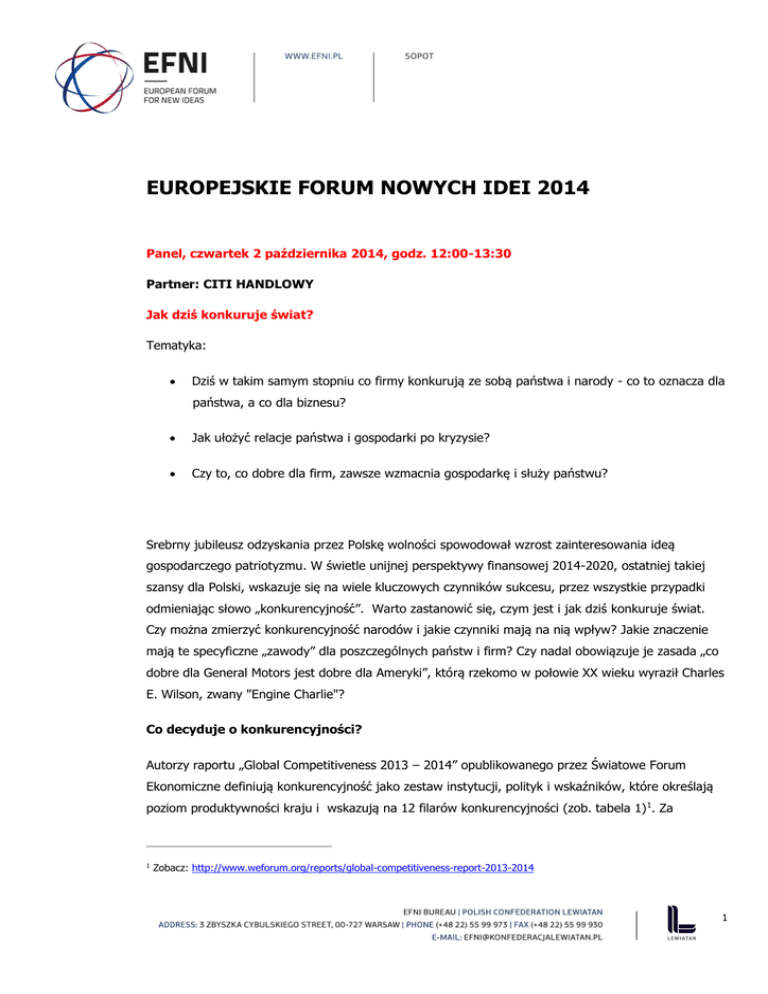 EUROPEJSKIE FORUM NOWYCH IDEI 2014 Panel, czwartek 2 października 2014, godz. 12:00-13:30 Partner: CITI HANDLOWY Jak dziś konkuruje świat? Tematyka: Dziś w takim samym stopniu co firmy konkurują ze sobą państwa i narody - co to oznacza dla państwa, a co dla biznesu? Jak ułożyć relacje państwa i gospodarki po kryzysie? Czy to, co dobre dla firm, zawsze wzmacnia gospodarkę i służy państwu? Srebrny jubileusz odzyskania przez Polskę wolności spowodował wzrost zainteresowania ideą gospodarczego patriotyzmu. W świetle unijnej perspektywy finansowej 2014-2020, ostatniej takiej szansy dla Polski, wskazuje się na wiele kluczowych czynników sukcesu, przez wszystkie przypadki odmieniając słowo „konkurencyjność”. Warto zastanowić się, czym jest i jak dziś konkuruje świat. Czy można zmierzyć konkurencyjność narodów i jakie czynniki mają na nią wpływ? Jakie znaczenie mają te specyficzne „zawody” dla poszczególnych państw i firm? Czy nadal obowiązuje je zasada „co dobre dla General Motors jest dobre dla Ameryki”, którą rzekomo w połowie XX wieku wyraził Charles E. Wilson, zwany "Engine Charlie"? Co decyduje o konkurencyjności? Autorzy raportu „Global Competitiveness 2013 – 2014” opublikowanego przez Światowe Forum Ekonomiczne definiują konkurencyjność jako zestaw instytucji, polityk i wskaźników, które określają poziom produktywności kraju i wskazują na 12 filarów konkurencyjności (zob. tabela 1) 1. Za 1 Zobacz: http://www.weforum.org/reports/global-competitiveness-report-2013-2014 1 fundamentalne uznano: instytucje, infrastrukturę, środowisko makroekonomiczne oraz zdrowie i edukację podstawową. Czynnikami zwiększającymi efektywność są: szkolnictwo wyższe i szkolenia, efektywność rynku towarów, efektywność rynku pracy, rozwój rynku finansowego, gotowość technologiczna oraz rozmiar rynku. Dwa ostatnie to innowacyjność i złożoność biznesowa. Pierwsza dziesiątka najbardziej konkurencyjnych gospodarek świata od roku 2012 pozostaje niezmieniona. Podium zajmują: Szwajcaria, Singapur i Finlandia, dalej są Niemcy, Stany Zjednoczone, Szwecja, Hong Kong, Holandia, Japonia i Wielka Brytania. Na 148 krajów w rankingu Polska zajmuje 42 miejsce. Dobrze wypadamy pod względem rozmiaru rynku, szkolnictwa wyższego i stosunkowo dobrze rozwiniętego sektora finansowego. Dużo do życzenia nadal pozostawia infrastruktura transportowa oraz nieefektywność administracyjna, w tym obciążenia regulacyjne. Autorzy wskazują, że jeśli Polska chce podążać w kierunku krajów innowacyjnych musi skoncentrować się na kwestiach badań i rozwoju, współpracy nauki i biznesu oraz łatwiejszego dostępu do środków venture capital. W roku 2010 i 2013 Indeks Konkurencyjności Regionalnej przedstawiła również Komisja Europejska 2, wskazując na silne i słabe strony unijnych regionów. W tym zestawieniu Polska zamyka dziesiątkę najsłabszych krajów, i znajduje się za Rumunią, Bułgarią, Grecją, Łotwą, Litwą, Chorwacją, Słowacją, Maltą i Węgrami (zob. tabela 2). Oba rankingi dobrze obrazują kluczowe czynniki sukcesu w globalnej konkurencyjności. Polska – jak zauważyła w jednym z wywiadów Beata Stelmach, prezes GE – już nie konkuruje ceną ani tanią siłą roboczą. To dobrze wykształcona kadra inżynierska zapewnia doskonałą jakość produkcji 3. Podobne wnioski można znaleźć w badaniu, jakie na zlecenie Fundacji Kronenberga przy Citi Handlowy zrealizowała PBS Sp. z o.o. Polskie towary i usługi poza granicami nie są wybierane tylko ze względu na cenę. Ponad 70% przedsiębiorców deklaruje, że konkuruje jakością. Wśród największych barier w prowadzeniu działalności gospodarczej za granicą, podobnie jak na rodzimym rynku, ponad 40% przedsiębiorców wskazuje na przepisy i biurokrację. Niewątpliwie jednak, największym hamulcem rozwoju polskich firm pozostają koszty pracy – ten czynnik dostrzega ponad 45% przedsiębiorców. Jakie zatem są kluczowe czynniki odpowiedzialne za sukces na rynku międzynarodowym? Priorytetem jest informacja o nowych rynkach zbytu, zdobywana bezpośrednio lub przez partnerów biznesowych. 2 3 Tamże, s. 25 http://energetyka.wnp.pl/prezes-ge-w-polsce-polska-nie-konkuruje-tania-sila-robocza,228546_1_0_0.html 2 Do tego innowacyjny i unikalny produkt lub usługa – choć tu niestety, jak mówił wielokrotnie Dariusz Żuk, prezes Polski Przedsiębiorczej – ciągle czekamy na polskiego Skype’a i nie mamy globalnych start-up’ów na skalę Evernote czy Instagramu4. Braki te niwelują nieco wykwalifikowany personel oraz działania marketingowe podejmowane na zagranicznych rynkach. Takie firmy jak PKN Orlen, PGNiG, Grupa Lotos, KGHM Polska Miedź, Canpack, LPP, Polpharma, Maspex, Toruńskie Zakłady Materiałów Opatrunkowych, CCC, Amica Wronki, Boryszew, Grupa Nowy Styl, Comarch, Inter Groclin Auto, Inglot czy Fakro wiodą prym w ekspansji zagranicznej. Wszystkie znalazły się wśród kandydatur do nagrody „Emerging Market Champions” Fundacji Kronenberga przy CitiHandlowym. Dobre praktyki Warto zwrócić uwagę na przykład Niemiec, które od czasu globalnego kryzysu w 2008 roku podjęły szereg działań zwiększających swoją konkurencyjność i obniżyły koszty pracy. Szybciej niż Francja i kraje południa skoncentrowały swoje działania na krajach Dalekiego Wschodu. Przed kilku laty jako kraj priorytetowy wybrały Indonezję i – jak zauważa Kazimierz Pazgan, właściciel Konspolu – niemieckie firmy, które tam inwestują otrzymują 50% dotacji, 100% zabezpieczenia inwestycji oraz ulgi podatkowe. Jonathan Story, emerytowany profesor INSEAD zauważa, że wieloma działaniami Niemcy ochroniły dodatkowo własny rynek i nie przeniosły produkcji do Chin, zwiększając jednocześnie obecność swoich firm na tamtym rynku. Analitycy oczekują, że w 2015 r. Chiny przyjmą ponad 15% dóbr i usług eksportowanych z Niemiec. W odniesieni