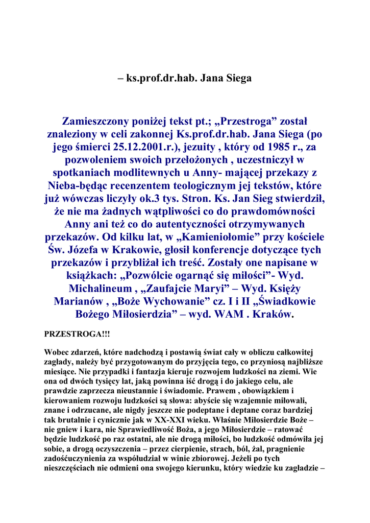– ks.prof.dr.hab. Jana Siega Zamieszczony poniżej tekst pt.; „Przestroga” został znaleziony w celi zakonnej Ks.prof.dr.hab. Jana Siega (po jego śmierci 25.12.2001.r.), jezuity , który od 1985 r., za pozwoleniem swoich przełożonych , uczestniczył w spotkaniach modlitewnych u Anny- mającej przekazy z Nieba-będąc recenzentem teologicznym jej tekstów, które już wówczas liczyły ok.3 tys. Stron. Ks. Jan Sieg stwierdził, że nie ma żadnych wątpliwości co do prawdomówności Anny ani też co do autentyczności otrzymywanych przekazów. Od kilku lat, w „Kamieniołomie” przy kościele Św. Józefa w Krakowie, głosił konferencje dotyczące tych przekazów i przybliżał ich treść. Zostały one napisane w książkach: „Pozwólcie ogarnąć się miłości”- Wyd. Michalineum , „Zaufajcie Maryi” – Wyd. Księży Marianów , „Boże Wychowanie” cz. I i II „Świadkowie Bożego Miłosierdzia” – wyd. WAM . Kraków. PRZESTROGA!!! Wobec zdarzeń, które nadchodzą i postawią świat cały w obliczu całkowitej zagłady, należy być przygotowanym do przyjęcia tego, co przyniosą najbliższe miesiące. Nie przypadki i fantazja kieruje rozwojem ludzkości na ziemi. Wie ona od dwóch tysięcy lat, jaką powinna iść drogą i do jakiego celu, ale prawdzie zaprzecza nieustannie i świadomie. Prawem , obowiązkiem i kierowaniem rozwoju ludzkości są słowa: abyście się wzajemnie miłowali, znane i odrzucane, ale nigdy jeszcze nie podeptane i deptane coraz bardziej tak brutalnie i cynicznie jak w XX-XXI wieku. Właśnie Miłosierdzie Boże – nie gniew i kara, nie Sprawiedliwość Boża, a jego Miłosierdzie – ratować będzie ludzkość po raz ostatni, ale nie drogą miłości, bo ludzkość odmówiła jej sobie, a drogą oczyszczenia – przez cierpienie, strach, ból, żal, pragnienie zadośćuczynienia za współudział w winie zbiorowej. Jeżeli po tych nieszczęściach nie odmieni ona swojego kierunku, który wiedzie ku zagładzie – zginie! Teraz widocznym się staje działanie sprawiedliwych Praw Bożych, według których zawsze, niezawodnie i nieomylnie wraca zło rzucone światu do narodów, które nim świat obdarzyły. Nie Bóg karze świat – to wróci doń zło, które ludzie sami wytworzyli. Jego siła, rozpiętość, potęga, straszliwość działania, da wyobrażenie o nikczemności ludzkości. Ale wyładowanie się zła na jego twórcach oczyści ziemię, bo Miłosierdzie Boże chce, aby jeszcze mogły rozwijać się na niej następne pokolenia w spokoju i radości. O ratunek dla ludzkości błagają: Maryja-Królowa Ziemi i cały Święty Kościół Powszechny Tryumfujący; wszyscy, którzy służyli Bogu na ziemi, służą mu nadal- są braćmi ludzkości. Dla ich miłości bliźniego, dla ich próśb i orędownictwa, Sprawiedliwość Boża okaże się jeszcze raz miłosierna. Nie zniszczy, nie zmiecie z powierzchni globu tych, co go kalają, ale oczyści ziemię z nagromadzonego zła, aby raz jeszcze mogli naprawić krzywdy i niesprawiedliwości zadane sobie wzajemnie. Wobec nadchodzących zbrodni wojny, które nieustannie potęgować się będą, aby doprowadzić do całkowitego zniszczenia życia na ziemi- katastrofy żywiołowe, wreszcie jeden potworny kataklizm będzie jedynym środkiem ugaszenia pożaru; i modlić się trzeba, aby zdążył nastąpić dostatecznie wcześnie. Będzie on wstrząsem na tyle silnym, aby stłumić wojnę. Pomoc i współpraca z tymi, którzy pragną uratować ziemię, będzie każdy czyn realizujący miłość bliźniego, a nie istnieje człowiek niezdolny do niego. Ratunkiem, usprawiedliwieniem swojego własnego istnienia, będzie świadome działanie tak jednostek, jak i zespołów ludzkich zjednoczonych w celu dopomożenia innym. Ocaleją ludzie i środowiska zdolne do miłości społecznej. Ale wobec ogólnego nieszczęścia, lęku i nędzy zagrażającej ludzkości, przeciwstawianie się złu, pomaganie, służba społeczna, spieszenie z pomocą i organizowanie pomocy jest obowiązkiem każdego człowieka chcącego uratować swój Naród przed zagładą. Sprawiedliwość Boża wobec miłości braterskiej zmienia swoje oblicze- staje się Miłosierdziem, pomocą i opieką. Naród Polski może ocaleć, o ile zrozumie to i zapragnie z całej mocy szybko naprawić zło czynione sobie nawzajem. Naprawą jest silne i z całej mocy Narodu dobyte działanie w kierunku niesienia pomocy. Potrzeby same nadadzą kierunek pomocy, jednak należy wiedzieć, że miejsce Polaków jest wśród swego Narodu, i musza się znaleźć wsie, osady, ośrodki, małe miasteczka, którym nic nie zagraża, zdolne do przyjęcia i otoczenia opieką ludzkości wielkich miast, która będzie musiała opuścić swoje domy, aby ocaleć. Jeżeli dość będzie miłości bliźniego- nie zagrozi głód, mróz i choroby, ale należy chcieć się dzielić, nic nie chować, nic nie oszczędzać, gdyż oszczędzeni będą hojni i wielkoduszni. Katastrofy żywiołowe nie będą trwały długo; wojna wyprzedzająca je- również. Groza obu może ominąć Polskę, o ile przeciw nim wystąpi cały Naród pomagający sobie, miłosierny, gościnny, dzielący się wszystkim, co posiada, pragnący ulżyć w cierpieniu tym, które one dotykać będą. Nie potrzeba, więc obawiać się wojny i kataklizmów, a własnego egoizmu, chciwości, nieczułości i braku miłosierdzia. Sam Bóg cofa swoje prawa karzące wobec miłosierdzia czynionego sobie nawzajem przez ludzi. Pomoc, opieka i siły, dane będą wszystkim w miarę czynionego przez ich miłosierdzia. U Królowej Korony Polskiej, u Świętych i Błogosławionych, Męczenników i Bohaterów swojego Narodu, mają Polacy, wsparcie, pomoc i ratunek, i nikt, kto wzywa ich pomocy, zawiedziony nie będzie. W spokoju i z głęboką powagą przyjąć należy nadchodzące wypadki; tam, gdzie światowa nienawiść zmierzy się ze sobą- musza być i będą straszliwe. Ale nie poddanie się losowi, lęk 