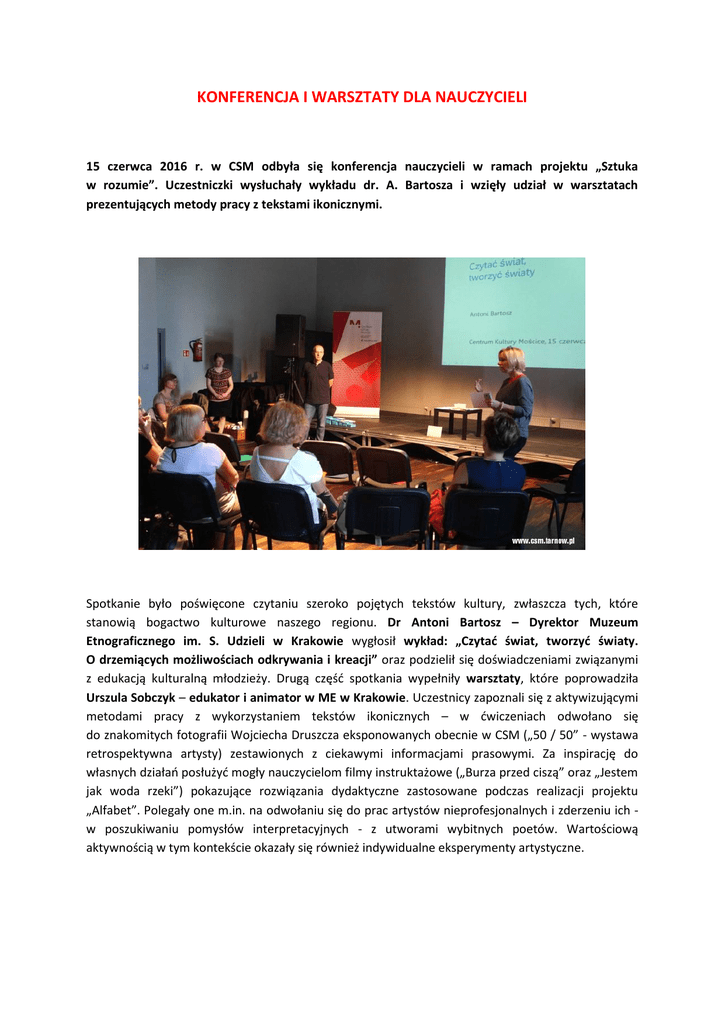 KONFERENCJA I WARSZTATY DLA NAUCZYCIELI 15 czerwca 2016 r. w CSM odbyła się konferencja nauczycieli w ramach projektu „Sztuka w rozumie”. Uczestniczki wysłuchały wykładu dr. A. Bartosza i wzięły udział w warsztatach prezentujących metody pracy z tekstami ikonicznymi. Spotkanie było poświęcone czytaniu szeroko pojętych tekstów kultury, zwłaszcza tych, które stanowią bogactwo kulturowe naszego regionu. Dr Antoni Bartosz – Dyrektor Muzeum Etnograficznego im. S. Udzieli w Krakowie wygłosił wykład: „Czytać świat, tworzyć światy. O drzemiących możliwościach odkrywania i kreacji” oraz podzielił się doświadczeniami związanymi z edukacją kulturalną młodzieży. Drugą część spotkania wypełniły warsztaty, które poprowadziła Urszula Sobczyk – edukator i animator w ME w Krakowie. Uczestnicy zapoznali się z aktywizującymi metodami pracy z wykorzystaniem tekstów ikonicznych – w ćwiczeniach odwołano się do znakomitych fotografii Wojciecha Druszcza eksponowanych obecnie w CSM („50 / 50” - wystawa retrospektywna artysty) zestawionych z ciekawymi informacjami prasowymi. Za inspirację do własnych działań posłużyć mogły nauczycielom filmy instruktażowe („Burza przed ciszą” oraz „Jestem jak woda rzeki”) pokazujące rozwiązania dydaktyczne zastosowane podczas realizacji projektu „Alfabet”. Polegały one m.in. na odwołaniu się do prac artystów nieprofesjonalnych i zderzeniu ich w poszukiwaniu pomysłów interpretacyjnych - z utworami wybitnych poetów. Wartościową aktywnością w tym kontekście okazały się również indywidualne eksperymenty artystyczne.