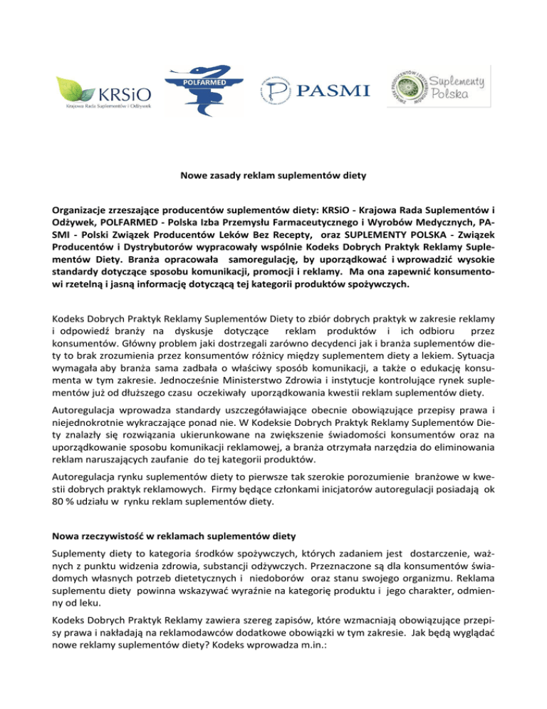 Nowe zasady reklam suplementów diety Organizacje zrzeszające producentów suplementów diety: KRSiO - Krajowa Rada Suplementów i Odżywek, POLFARMED - Polska Izba Przemysłu Farmaceutycznego i Wyrobów Medycznych, PASMI - Polski Związek Producentów Leków Bez Recepty, oraz SUPLEMENTY POLSKA - Związek Producentów i Dystrybutorów wypracowały wspólnie Kodeks Dobrych Praktyk Reklamy Suplementów Diety. Branża opracowała samoregulację, by uporządkować i wprowadzić wysokie standardy dotyczące sposobu komunikacji, promocji i reklamy. Ma ona zapewnić konsumentowi rzetelną i jasną informację dotyczącą tej kategorii produktów spożywczych. Kodeks Dobrych Praktyk Reklamy Suplementów Diety to zbiór dobrych praktyk w zakresie reklamy i odpowiedź branży na dyskusje dotyczące reklam produktów i ich odbioru przez konsumentów. Główny problem jaki dostrzegali zarówno decydenci jak i branża suplementów diety to brak zrozumienia przez konsumentów różnicy między suplementem diety a lekiem. Sytuacja wymagała aby branża sama zadbała o właściwy sposób komunikacji, a także o edukację konsumenta w tym zakresie. Jednocześnie Ministerstwo Zdrowia i instytucje kontrolujące rynek suplementów już od dłuższego czasu oczekiwały uporządkowania kwestii reklam suplementów diety. Autoregulacja wprowadza standardy uszczegóławiające obecnie obowiązujące przepisy prawa i niejednokrotnie wykraczające ponad nie. W Kodeksie Dobrych Praktyk Reklamy Suplementów Diety znalazły się rozwiązania ukierunkowane na zwiększenie świadomości konsumentów oraz na uporządkowanie sposobu komunikacji reklamowej, a branża otrzymała narzędzia do eliminowania reklam naruszających zaufanie do tej kategorii produktów. Autoregulacja rynku suplementów diety to pierwsze tak szerokie porozumienie branżowe w kwestii dobrych praktyk reklamowych. Firmy będące członkami inicjatorów autoregulacji posiadają ok 80 % udziału w rynku reklam suplementów diety. Nowa rzeczywistość w reklamach suplementów diety Suplementy diety to kategoria środków spożywczych, których zadaniem jest dostarczenie, ważnych z punktu widzenia zdrowia, substancji odżywczych. Przeznaczone są dla konsumentów świadomych własnych potrzeb dietetycznych i niedoborów oraz stanu swojego organizmu. Reklama suplementu diety powinna wskazywać wyraźnie na kategorię produktu i jego charakter, odmienny od leku. Kodeks Dobrych Praktyk Reklamy zawiera szereg zapisów, które wzmacniają obowiązujące przepisy prawa i nakładają na reklamodawców dodatkowe obowiązki w tym zakresie. Jak będą wyglądać nowe reklamy suplementów diety? Kodeks wprowadza m.in.: • Ustanowienie obowiązku umieszczania nazwy kategorii „suplement diety” w reklamie w prawym dolnym rogu. Ułatwi to identyfikację produktu konsumentowi. A w reklamach radiowych obowiązek dwukrotnego zaznaczenia nazwy kategorii. • Zakaz wykorzystywania wizerunku lub rekomendacji lekarza czy farmaceuty. • Zakaz odnoszenia się w reklamie do chorób sugerując właściwości lecznicze produktu. (Należy jednak podkreślić, że zgodnie z obowiązującym prawem, a co najważniejsze, zgodnie z istotą produktu jakim jest suplement diety, dozwolone jest odnoszenie się ̨ do profilaktyki, w ramach zatwierdzonych oświadczeń zdrowotnych o zmniejszaniu ryzyka choroby, art. 14 Rozporządzenia 1924/2006. Autoregulacja versus regulacja Wypracowanie Kodeksu Dobrych Praktyk Reklamy Suplementów Diety było wynikiem kilkumiesięcznych negocjacji w środowisku branżowym. Kodeks może stać się elementem edukacji konsumentów w zakresie suplementacji, o ile jego zapisy będą respektowane przez reklamodawców i wpłyną na jakość reklam suplementów diety. Według regulatora, pozytywne sygnały z rynku, świadczące o skuteczności autoregulacji, mogą być podstawą do ograniczania zamiaru wprowadzania dodatkowych regulacji w tym zakresie.