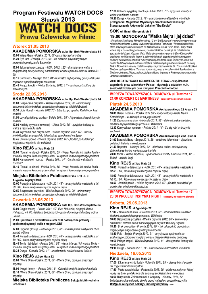 Program Festiwalu WATCH DOCS Słupsk 2013 17:00 Kobiety syryjskiej rewolucji - Liban 2012, 75’ - syryjskie kobiety w walce z reżimem Assada 18:20 Durga - Kanada 2012, 11’ - aranżowanie małżeństwa w Indiach prelegentka: Magdalena Młynarczyk członkini Koszalińskiego Stowarzyszenia Aktywności Lokalnej "Era Kobiet" SOK ul. Braci Gierymskich 1 19.00 MONODRAM "Matka Mejra i jej dzieci" Wtorek 21.05.2013 AKADEMIA POMORSKA aula IIIp. Boh.Westerplatte 64 10.00 Wiera Gran - Polska, 2011, 67'- jak zniszczyć artystkę 11.20 Być tam - Francja, 2012, 94' - na oddziale psychiatrycznym marsylskiego więzienia Baumette 17.00 Jak przetrwać zarazę - USA, 2012, 120' - dramatyczna walka z obojętnością amerykańskiej administracji wobec epidemii AIDS w latach 80. i 90. 19.15 Burmistrz - Meksyk, 2012, 81’- burmistrz najbogatszej gminy Meksyku zapewnia spokój mafijnymi metodami 20.45 Połącz kropki - Wielka Brytania, 2012, 11’ - dostępność kultury dla niewidomych Monodram Stanisława Miedziewskiego i Caryl Swift powstał w oparciu o reporterskie relacje dziennikarza Gazety Wyborczej Wojciecha Tochmana i Ryszarda Bilskiego, które dotyczą masakr etnicznych na Bałkanach w latach 1992 -1995. Caryl Swift wciela się w postać Mejry Dautović, Bośniaczki która oczekuje na odnalezienie szczątków jej dzieci. Oczami Matki Mejry obserwujemy pracę dr Ewy Klonowskiej urodzonej we Wrocławiu, jednej z najwybitniejszych przedstawicielek medycyny sądowej na świecie i członkini Amerykańskiej Akademii Nauk Sądowych, która od ponad 15 lat wydobywa ludzkie szczątki z niezliczonych grobów rozsianych po całej Bośni. Monodram uznany został za najlepsze przedstawienie 27. Toruńskich Spotkań Teatrów Jednego Aktora. Toruński konkurs to, wraz z Wrocławskimi Spotkaniami z Teatrem Jednego Aktora, najbardziej prestiżowa impreza w Polsce przeznaczona dla „aktorów samotników”. 20.00 DEBATA PRAWA CZŁOWIEKA TU I TERAZ – współczesne zagrożenia praw człowieka w Polsce – dyskusja z udziałem m.in. środowisk kobiecych oraz Kampanii Przeciw Homofonii Środa 22.05.2013 AKADEMIA POMORSKA aula IIIp. Boh.Westerplatte 64 IMPREZA TOWARZYSZĄCA DOMÓWKA ul. Tuwima 17 21.00 KONCERT DJ MARTINESS – szczegóły na osobnym plakacie 10.00 Bezpieczna przystań - Wielka Brytania 2012, 20’ - animowany dokument: historie dzieci poszukujących azylu w Wielkiej Brytanii. 10.30 Libia Hurra! - Austria 2012 70’ - Libia tuż po upadku Kadafiego: kraj nadziei 11.50 Łzy afgańskiego wodza - Belgia 2011, 58’ - Afganistan niespełnionych nadziei 17.00 Kobiety syryjskiej rewolucji - Liban 2012, 75’ - syryjskie kobiety w walce z reżimem Assada 18.30 Wyznania pod przymusem - Wielka Brytania 2012, 59’ - irańscy intelektualiści zmuszani do telewizyjnej samokrytyki na żywo 19.45 Uwolnić poród - Wielka Brytania 2012, 60’ -„Rodzić po ludzku” po węgiersku: więzienie dla położnej Piątek 24.5.2013 AKADEMIA POMORSKA Arciszewskiego 22 A sala 53 Kino REJS al.3go Maja 22 10.00 Tonia i jej dzieci - Polska 2011, 55' -Wera, Marcel i ich matka Tonia – w cieniu wiary w komunistyczny ideał i w trybach komunistycznego państwa 18.00 Kamyczkowi rycerze - Polska 2011, 14' - Co się robi w drużynie zuchów? 18.15 Tonia i jej dzieci - Polska 2011, 55' -Wera, Marcel i ich matka Tonia – w cieniu wiary w komunistyczny ideał i w trybach komunistycznego państwa Miejska Biblioteka Publiczna Filia nr 3 ul. Z. Augusta 14 przy EMCE 12:00 Porządna dziewczyna - USA 201, 48’ - amerykańskie nastolatki z lat 50. i 60., które miały nieszczęście zajść w ciążę 12:50 Bezpieczna przystań - Wielka Brytania 2012, 20’ - animowany dokument: historie dzieci poszukujących azylu w Wielkiej Brytanii. Czwartek 23.05.2013 AKADEMIA POMORSKA aula IIIp. Boh.Westerplatte 64 10.00 Ciągle wierzę - Polska 2011, 40’ -Ewa Hołuszko, niegdyś Marek Hałuszko, w l. 80. działacz Solidarności – jakim domem jest dla Ewy wolna Polska 11.00 Spotkanie z przedstawicielami KPH poświęcone prawnej i społecznej sytuacji osób z kręgów LGBT 17.00 Cyganie głosują -- Słowacja 2012, 85’ - romski pisarz i aktywista chce zostać wójtem 18.40 Porządna dziewczyna - USA 201, 48’ - amerykańskie nastolatki z lat 50. i 60., które miały nieszczęście zajść w ciążę 19.40 Tonia i jej dzieci - Polska 2011, 55' -Wera, Marcel i ich matka Tonia – w cieniu wiary w komunistyczny ideał i w trybach komunistycznego państwa 20.35 Durga - Kanada 2012, 11’ - aranżowanie małżeństwa w Indiach Kino REJS al.3go Maja 22 10.00 Wiera Gran -Polska, 2011, 67' - Wiera Gran, czyli jak zniszczyć artystkę 18.00 Hegel i motyl - Polska 2011, 5' - Człowiek-motyl i heglowska triada 18.10 Wiera Gran -Polska, 2011, 67' - Wiera Gran, czyli jak zniszczyć artystkę Miejska Biblioteka Publiczna Sekcja Multimedialna Grodzka 3 10.00 Dzieci Kotana - Polska 2012 66’ - kontynuatorzy dzieła Marka Kotańskiego – w dziesięć lat od jego śmierci 11.20 Zezwalam na atak - Holandia 2011, 58’ - dziennikarskie śledztwo śladami najsłynniejszego przecieku Wikileaks 12.30 Kamyczkowi rycerze - Polska 2011, 14' - Co się robi w drużynie zuchów? AKADEMIA POMORSKA Arciszewskiego 22A -plener 21.00 Baranek Boży - Belgia 2011, 28’ - rodzinna tajemnica – ujawniona po latach historia molestowania 21.40 Reporter - Meksyk 2012, 72’ - nierówna walka: meksykańscy dziennikarze kontra narkotykowe kartele 23.00 Miraż - Wielka Brytania, Zjednoczone Emiraty Arabskie 2011, 42’ Dubaj – miasto iluzji Kino REJS al.3go Maja 22 10.00 Porządna dziewczyna - USA 201, 48’ - amerykańskie nastolatki z lat 50. i 60., które miały nieszczęście zajść w ciążę 18.00 Porządna dziewczyna - USA 201, 48’ - amerykańskie nastolatki z lat 50. i 60., które miały nieszczęście zajść w ciążę 18.50 Uwolnić poród - Wielka Brytania 2012, 60’ -„Rodzić po ludzku” po węgiersku: więzienie dla położnej IMPREZA TOWARZYSZĄCA DOMÓWKA ul.