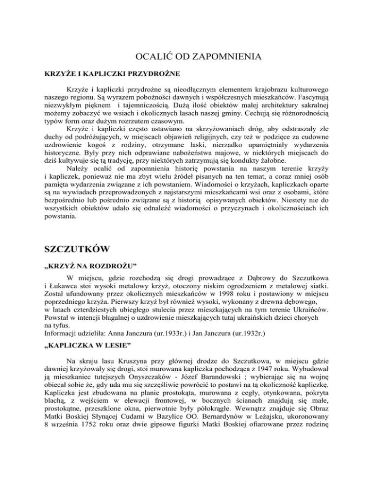 OCALIĆ OD ZAPOMNIENIA KRZYśE I KAPLICZKI PRZYDROśNE KrzyŜe i kapliczki przydroŜne są nieodłącznym elementem krajobrazu kulturowego naszego regionu. Są wyrazem poboŜności dawnych i współczesnych mieszkańców. Fascynują niezwykłym pięknem i tajemniczością. DuŜą ilość obiektów małej architektury sakralnej moŜemy zobaczyć we wsiach i okolicznych lasach naszej gminy. Cechują się róŜnorodnością typów form oraz duŜym rozrzutem czasowym. KrzyŜe i kapliczki często ustawiano na skrzyŜowaniach dróg, aby odstraszały złe duchy od podróŜujących, w miejscach objawień religijnych, czy teŜ w podzięce za cudowne uzdrowienie kogoś z rodziny, otrzymane łaski, nierzadko upamiętniały wydarzenia historyczne. Były przy nich odprawiane naboŜeństwa majowe, w niektórych miejscach do dziś kultywuje się tą tradycję, przy niektórych zatrzymują się kondukty Ŝałobne. NaleŜy ocalić od zapomnienia historię powstania na naszym terenie krzyŜy i kapliczek, poniewaŜ nie ma zbyt wielu źródeł pisanych na ten temat, a coraz mniej osób pamięta wydarzenia związane z ich powstaniem. Wiadomości o krzyŜach, kapliczkach oparte są na wywiadach przeprowadzonych z najstarszymi mieszkańcami wsi oraz z osobami, które bezpośrednio lub pośrednio związane są z historią opisywanych obiektów. Niestety nie do wszystkich obiektów udało się odnaleźć wiadomości o przyczynach i okolicznościach ich powstania. SZCZUTKÓW „KRZYś NA ROZDROśU” W miejscu, gdzie rozchodzą się drogi prowadzące z Dąbrowy do Szczutkowa i Łukawca stoi wysoki metalowy krzyŜ, otoczony niskim ogrodzeniem z metalowej siatki. Został ufundowany przez okolicznych mieszkańców w 1998 roku i postawiony w miejscu poprzedniego krzyŜa. Pierwszy krzyŜ był równieŜ wysoki, wykonany z drewna dębowego, w latach czterdziestych ubiegłego stulecia przez mieszkających na tym terenie Ukraińców. Powstał w intencji błagalnej o uzdrowienie mieszkających tutaj ukraińskich dzieci chorych na tyfus. Informacji udzieliła: Anna Janczura (ur.1933r.) i Jan Janczura (ur.1932r.) „KAPLICZKA W LESIE” Na skraju lasu Kruszyna przy głównej drodze do Szczutkowa, w miejscu gdzie dawniej krzyŜowały się drogi, stoi murowana kapliczka pochodząca z 1947 roku. Wybudował ją mieszkaniec tutejszych Onyszczaków - Józef Barandowski ; wybierając się na wojnę obiecał sobie Ŝe, gdy uda mu się szczęśliwie powrócić to postawi na tą okoliczność kapliczkę. Kapliczka jest zbudowana na planie prostokąta, murowana z cegły, otynkowana, pokryta blachą, z wejściem w elewacji frontowej, w bocznych ścianach znajdują się małe, prostokątne, przeszklone okna, pierwotnie były półokrągłe. Wewnątrz znajduje się Obraz Matki Boskiej Słynącej Cudami w Bazylice OO. Bernardynów w LeŜajsku, ukoronowany 8 września 1752 roku oraz dwie gipsowe figurki Matki Boskiej ofiarowane przez rodzinę Barandowskich. Do roku 1960 odbywały się tu naboŜeństwa majowe, licznie gromadząc okolicznych mieszkańców. Informacji udzielił: Józef Barandowki (ur.1950r.) „KRZYś PRZY DRODZE” Przy głównej drodze przez Szczutków, w sąsiedztwie starych dębów stoi wysoki dębowy krzyŜ z 1956 roku. W zwieńczeniu umieszczony jest mały krzyŜyk wykonany z gipsu. KrzyŜ jest ogrodzony niskim sztachetowym płotkiem. Postawił go ojciec pana Andrzeja Konopki zastępując pierwotny krzyŜ, wykonany z kamienia bruśnieńskiego, najprawdopodobniej przez wcześniejszego właściciela posesji Wasyla Kuzyka, który po wojnie w 1946 roku wraz z rodziną został deportowany na Wschód. Niestety nie znana jest intencja postawienia krzyŜa. Pierwszy krzyŜ kiedy uległ zniszczeniu, został zakopany w miejscu obecnego. Do niedawna jeszcze, pod krzyŜem odprawiane były naboŜeństwa majowe. Co roku w Wielką Sobotę odbywa się tu święcenie pokarmów wielkanocnych. Informacji o krzyŜu udzielili: Katarzyna Antosz (ur. 1928r.), Andrzej Konopka (ur.1939r.) „KAPLICZKA U JUNIKÓW ” W centrum wsi, w ogrodzie Państwa Juników, w otoczeniu pięknych ogrodowych kwiatów zwraca uwagę swoim osobliwym urokiem, prześliczna figurka Matki BoŜej Fatimskiej. Historia powstania tej kapliczki jest dokładnie znana, gdyŜ nie są to czasy odległe. Pierwszą figurę postawił tutaj Pan Junik w 1984 roku w podzięce za udaną operację swojej Ŝony. Trzy lata temu zamienił figurkę na większą. Pierwszą postawił na tutejszym cmentarzu na grobie swojej babci. Obydwie figurki wykonane zostały z gipsu. Przyjęło się, Ŝe w maju licznie spotykają się tu sąsiedzi, szczególnie starsi i dzieci , aby wspólnie modlić się do Matki BoŜej, prosząc o potrzebne dla siebie łaski. Swoimi bardzo osobistymi zwierzeniami podzielili się z nami Pani Anna Junik (ur.1934r.) i Pan Jan Junik (ur. 1923r). „KRZYś U MARYJKA” KrzyŜ stoi, w ogrodzie Państwa Maryjków, przy głównej drodze prowadzącej przez Szczutków, wykonany jest z kamienia bruśnieńskiego, pobielony na biały kolor. Z przekazów ustnych dowiadujemy się, Ŝe pochodzi z początku ubiegłego stulecia . Pierwotnie krzyŜ stał w innym miejscu, w zagrodzie Kurpity, przy drodze między domostwami, która prowadziła do mostu na rzece. W ukraińskie święto „Jordan”, kiedy szła procesja z cerkwi do rzeki Ŝeby poświęć wodę, zatrzymywała się przy krzyŜu aby odprawić naboŜeństwo. Był to waŜny krzyŜ dla ówczesnej społeczności wiejskiej, zarówno Polaków i Ukraińców. Niestety nikt nie zna intencji wystawienia krzyŜa. W roku 1974 Pan Maryjko przeniósł krzyŜ w obecne miejsce. Do roku 1990 śpiewano tu majówki . Informacji udzieliła: Maria Oleszycka (ur. 1927r.), Bronisław Maryjko. KAPLICZKA ŚW. ANTONIEGO Jest to murowana kapliczka zbudowana z cegły, otynkowana, pokryta blachą, utrzymana w bardzo dobrym stanie, w środku znajduje się figura św. Antoniego, a takŜe obraz Matki BoŜej z Dzieciątkiem. Wybudowana została 1955 roku, z 