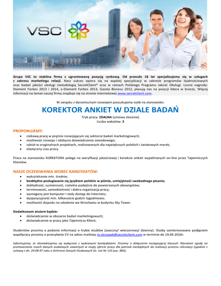 Grupa VSC to stabilna firma z ugruntowaną pozycją rynkową. Od przeszło 18 lat specjalizujemy się w usługach z zakresu marketingu relacji. Nasz sukces opiera się na wąskiej specjalizacji w zakresie programów lojalnościowych oraz badań jakości obsługi metodologią SecretClient® oraz w ramach Polskiego Programu Jakość Obsługi. Liczne nagrody: Diament Forbes 2013 i 2014, e-Diament Forbes 2013, Gazela Biznesu 2012, plasują nas na pozycji lidera w branży. Więcej informacji na temat naszej firmy znajduje się na stronie internetowej www.secretclient.com. W związku z dynamicznym rozwojem poszukujemy osób na stanowisko: KOREKTOR ANKIET W DZIALE BADAŃ Tryb pracy: ZDALNA (umowa zlecenie) Liczba wakatów: 3 PROPONUJEMY: ciekawą pracę w prężnie rozwijającym się sektorze badań marketingowych; możliwość rozwoju i zdobycia doświadczenia zawodowego; udział w oryginalnych projektach, realizowanych dla największych polskich i światowych marek; elastyczny czas pracy. Praca na stanowisku KOREKTORA polega na weryfikacji jakościowej i korekcie ankiet wypełnianych on-line przez Tajemniczych Klientów. NASZE OCZEKIWANIA WOBEC KANDYDATÓW: wykształcenie min. średnie; bezbłędne posługiwanie się językiem polskim w piśmie, umiejętność swobodnego pisania; dokładność, sumienność, rzetelne podejście do powierzonych obowiązków; terminowość, samodzielność i dobra organizacja pracy; wymagany jest komputer i stały dostęp do Internetu; dyspozycyjność min. kilkanaście godzin tygodniowo; możliwość dojazdu na szkolenia we Wrocławiu w budynku Sky Tower. Dodatkowym atutem będzie: doświadczenie w obszarze badań marketingowych; doświadczenie w pracy jako Tajemniczy Klient; Studentów prosimy o podanie informacji o trybie studiów (zaoczny/ wieczorowy/ dzienny). Osoby zainteresowane podjęciem współpracy prosimy o przesyłanie CV na adres mailowy [email protected] w terminie do 19.04.2016r. Informujemy, że skontaktujemy się wyłącznie z wybranymi kandydatami. Prosimy o dołączenie następującej klauzuli: Wyrażam zgodę na przetwarzanie moich danych osobowych zawartych w mojej ofercie pracy dla potrzeb niezbędnych do realizacji procesu rekrutacji (zgodnie z ustawą z dn. 29.08.97 roku o Ochronie Danych Osobowych Dz. Ust Nr 133 poz. 883).