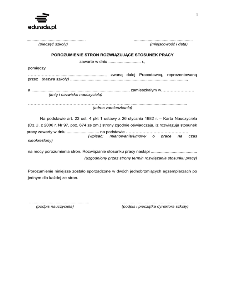 1 ................................................... (pieczęć szkoły) ................................................... (miejscowość i data) POROZUMIENIE STRON ROZWIĄZUJĄCE STOSUNEK PRACY zawarte w dniu ............................ r., pomiędzy ………………….........................................., zwaną dalej Pracodawcą, reprezentowaną przez (nazwa szkoły) ....................................................................................................., a ...................................................................................., zamieszkałym w…………………… (imię i nazwisko nauczyciela) ……………………………………………………………....................................................... (adres zamieszkania) Na podstawie art. 23 ust. 4 pkt 1 ustawy z 26 stycznia 1982 r. – Karta Nauczyciela (Dz.U. z 2006 r. Nr 97, poz. 674 ze zm.) strony zgodnie oświadczają, iż rozwiązują stosunek pracy zawarty w dniu ............................ na podstawie ……………………………………… (wpisać: mianowania/umowy o pracę na czas nieokreślony) na mocy porozumienia stron. Rozwiązanie stosunku pracy nastąpi ........................................ (uzgodniony przez strony termin rozwiązania stosunku pracy) Porozumienie niniejsze zostało sporządzone w dwóch jednobrzmiących egzemplarzach po jednym dla każdej ze stron. .................................................... (podpis nauczyciela) ............................................................ (podpis i pieczątka dyrektora szkoły)