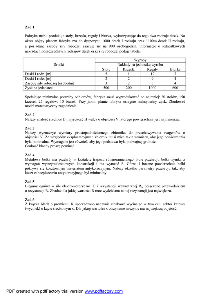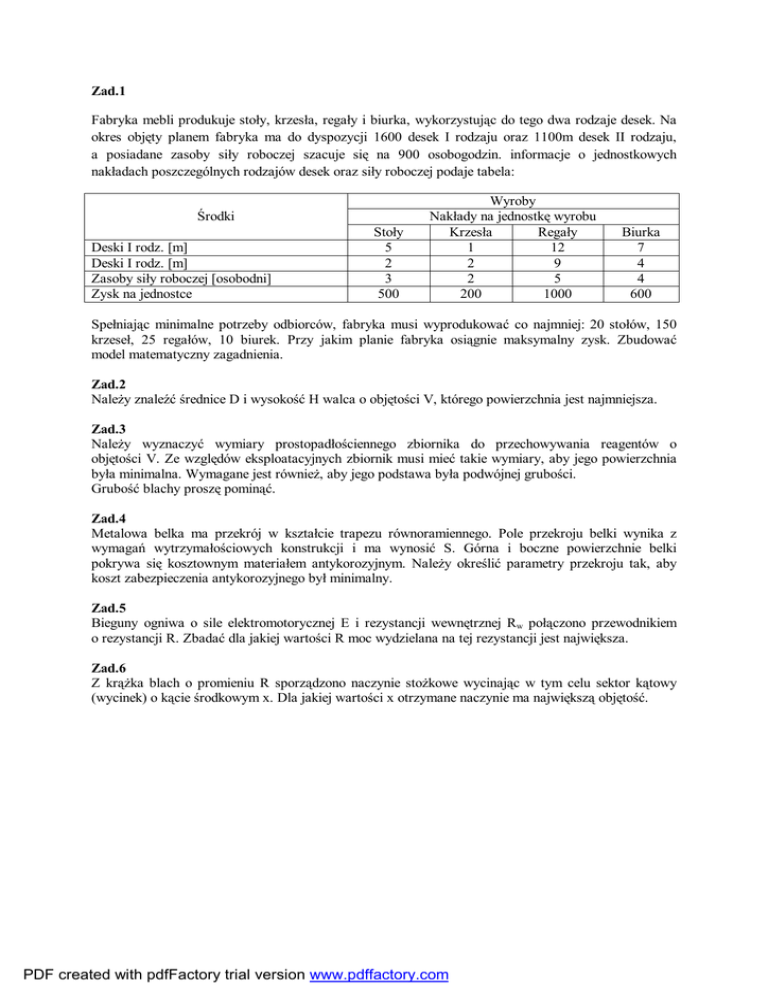 Zad.1 Fabryka mebli produkuje stoły, krzesła, regały i biurka, wykorzystując do tego dwa rodzaje desek. Na okres objęty planem fabryka ma do dyspozycji 1600 desek I rodzaju oraz 1100m desek II rodzaju, a posiadane zasoby siły roboczej szacuje się na 900 osobogodzin. informacje o jednostkowych nakładach poszczególnych rodzajów desek oraz siły roboczej podaje tabela: Środki Deski I rodz. [m] Deski I rodz. [m] Zasoby siły roboczej [osobodni] Zysk na jednostce Stoły 5 2 3 500 Wyroby Nakłady na jednostkę wyrobu Krzesła Regały 1 12 2 9 2 5 200 1000 Biurka 7 4 4 600 Spełniając minimalne potrzeby odbiorców, fabryka musi wyprodukować co najmniej: 20 stołów, 150 krzeseł, 25 regałów, 10 biurek. Przy jakim planie fabryka osiągnie maksymalny zysk. Zbudować model matematyczny zagadnienia. Zad.2 Należy znaleźć średnice D i wysokość H walca o objętości V, którego powierzchnia jest najmniejsza. Zad.3 Należy wyznaczyć wymiary prostopadłościennego zbiornika do przechowywania reagentów o objętości V. Ze względów eksploatacyjnych zbiornik musi mieć takie wymiary, aby jego powierzchnia była minimalna. Wymagane jest również, aby jego podstawa była podwójnej grubości. Grubość blachy proszę pominąć. Zad.4 Metalowa belka ma przekrój w kształcie trapezu równoramiennego. Pole przekroju belki wynika z wymagań wytrzymałościowych konstrukcji i ma wynosić S. Górna i boczne powierzchnie belki pokrywa się kosztownym materiałem antykorozyjnym. Należy określić parametry przekroju tak, aby koszt zabezpieczenia antykorozyjnego był minimalny. Zad.5 Bieguny ogniwa o sile elektromotorycznej E i rezystancji wewnętrznej Rw połączono przewodnikiem o rezystancji R. Zbadać dla jakiej wartości R moc wydzielana na tej rezystancji jest największa. Zad.6 Z krążka blach o promieniu R sporządzono naczynie stożkowe wycinając w tym celu sektor kątowy (wycinek) o kącie środkowym x. Dla jakiej wartości x otrzymane naczynie ma największą objętość. PDF created with pdfFactory trial version www.pdffactory.com