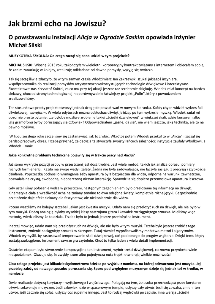 Jak brzmi echo na Jowiszu? O powstawaniu instalacji Alicja w Ogrodzie Saskim opowiada inżynier Michał Silski MUZYKOTEKA SZKOLNA: Od czego zaczął się pana udział w tym projekcie? MICHAŁ SILSKI: Wiosną 2013 roku zakończyłem wieloletni korporacyjny kontrakt związany z internetem i obiecałem sobie, że zanim zanurkuję w kolejny, zrealizuję odkładane od dawna pomysły, wyżyję się twórczo. Tak się szczęśliwie zdarzyło, że w tym samym czasie Włodzimierz Jan Zakrzewski szukał jakiegoś inżyniera, współpracownika do realizacji pomysłów artystycznych wykorzystujących technologie dźwiękowe i interaktywne. Skontaktował nas Krzysztof Knittel, za co mu przy tej okazji jeszcze raz serdecznie dziękuję. Włodek miał koncept na bardzo ciekawy, choć od strony technologicznej nieporównywalnie łatwiejszy projekt „Polin”, który z powodzeniem zrealizowaliśmy. Ten stosunkowo prosty projekt otworzył jednak drogę do poszukiwań w nowym kierunku. Każdy chyba widział wykres fali dźwiekowej, waveform. W wielu edytorach można odsłuchać dźwięk jeżdżąc po tym wykresie myszką. Włodek zadał mi pozornie proste pytanie: czy byłoby możliwe zrobienie takiej „ścieżki dźwiękowej” w większej skali, gdzie kursorem albo igłą gramofonu byłby poruszający się człowiek? Odpowiedziałem „jasne, da się”, nie wiem jeszcze, jaką techniką, ale to na pewno możliwe. W lipcu zeszłego roku zaczęliśmy się zastanawiać, jak to zrobić. Wkrótce potem Włodek przekuł to w „Alicję” i zaczął się bardzo pracowity okres. Trzeba przyznać, że decyzja ta stworzyła swoisty łańcuch zależności: instytucje zaufały Włodkowi, a Włodek – mnie. Jakie konkretne problemy techniczne pojawiły się w trakcie pracy nad Alicją? Już samo wykrycie pozycji osoby w przestrzeni jest dość trudne. Jest wiele metod, takich jak analiza obrazu, pomiary różnych form energii. Każda ma swoje wady i zalety. Żadna nie była zadowalająca, nie łączyła zasięgu z precyzją i szybkością działania. Poprzeczkę podnosiło wymaganie żeby aparatura była bezpieczna dla widza, odporna na warunki zewnętrzne, pozwalała na czystą, swobodną, nieobarczoną niczym interakcję. Sprawdziła się dopiero przemysłowa aparatura laserowa. Gdy ustaliliśmy położenie widza w przestrzeni, następnym zagadnieniem było przełożenie tej informacji na dźwięk. Kinematyka ciała a wrażliwość ucha na zmiany tonalne to dwa odrębne światy, kompletnie różne języki. Bezpośrednie przełożenie daje efekt ciekawy dla fascynatów, ale niekoniecznie dla widza. Potem weszliśmy na kolejny szczebel, jakim jest kwestia muzyki. Udało nam się przełożyć ruch na dźwięk, ale nie było w tym muzyki. Dobrą analogią byłaby wysokiej klasy nastrojona gitara i kawałek rozciągniętego sznurka. Mieliśmy więc metodę, wiedzieliśmy że to działa. Trzeba było to jednak jeszcze przełożyć na instrument. Inaczej mówiąc, udało nam się przełożyć ruch na dźwięk, ale nie było w tym muzyki. Trzeba było jeszcze zrobić z tego instrument, zmienić naciągnięty sznurek w skrzypce. Tutaj również wypróbowaliśmy mnóstwo metod i algorytmów. Włodek wymyślił, by zastosować temperowanie skali dźwiękowej, coś podobnego do progów w gitarze. Dzięki temu błędy zostają zaokrąglone, instrument zawsze gra czytelnie. Choć to tylko jeden z wielu detali implementacji. Ostatnim etapem było stworzenie kompozycji na ten instrument, wybór treści dźwiękowej, co znowu przyniosło wiele niespodzianek. Okazuje się, że zwykły szum albo pojedyncza nuta trąbki otwierają wielkie możliwości. Clou całego projektu jest kilkudziesięciometrowa ścieżka po wyjściu z namiotu, na której odtwarzana jest muzyka. Jej przebieg zależy od naszego sposobu poruszania się. Sporo pod względem muzycznym dzieje się jednak też w środku, w namiocie. Dwie realizacje dotyczą korytarzy – wyjściowego i wejściowego. Polegają na tym, że osoba przechodząca przez korytarze ożywia sekwencje muzyczne. Jeśli człowiek idzie w spacerowym tempie, usłyszy cały utwór. Jeśli się zawaha, zmieni ten utwór, jeśli zacznie się cofać, usłyszy coś zupełnie innego. Jest to rodzaj wędrówki po zapisie, inna wersja „ścieżki dźwiękowej”. Paradoksalnie, duża liczba osób zwiedzających „Alicję” jest tu utrudnieniem. Instalacja daje najlepsze wrażenia, jeśli pojedynczy widz ma możliwość spokojnego przejścia tej ścieżki w swoim tempie, bez ponaglania i tłumu za plecami. Wymyśliliśmy modyfikacje, które mają pomóc, buduję właśnie nowe procesory dźwięku, za moment zastąpią obecne. Wiadomo już, że Alicja będzie podróżować – przeniesie się do innych miast. Czy możliwe są jakieś zmiany w kształcie instalacji? Jasne, w moim przekonaniu to dopiero początek drogi. Już pierwsze dni konfrontacji z rzeczywistością przyniosły lawinę nowych pomysłów. Nie licząc tych, których zwyczajnie nie mogliśmy wprowadzić do projektu ze względu na limit czasu i środków. Poza tym nie będzie nigdy dwóch identycznych realizacji, bo instalację trzeba wpasować w warunki danego miejsca. Mam nadzieję, że będziemy mogli doskonalić zarówno „Alicję” jak i komunikację wokół niej, znajdziemy zainteresowanie i szanse na rozwój. Czy są analogie między Alicją a innymi projektami, w których brał pan udział? Wiele moich projektów miało charakter interaktywny. Chyba w 1993 roku Krzysztof Knittel zaprosił mnie do projektu, w którym eksperymentował z zamianą rysunków na dźwięk. Miał oprogramowanie, w którym to co narysował, pełniło rolę partytury nutowej. Robiłem wtedy rzecz odwrotną – pisałem oprogramowanie, które wczytywało dźwięk i zmieniało go w grafikę. Krzysztof wymyślił instalację, w której mieliśmy dwa stanowiska. On zamieniał rysunek na dźwięk, emitowany na salę. Ja ten dźwięk zamieniałem z powrotem 