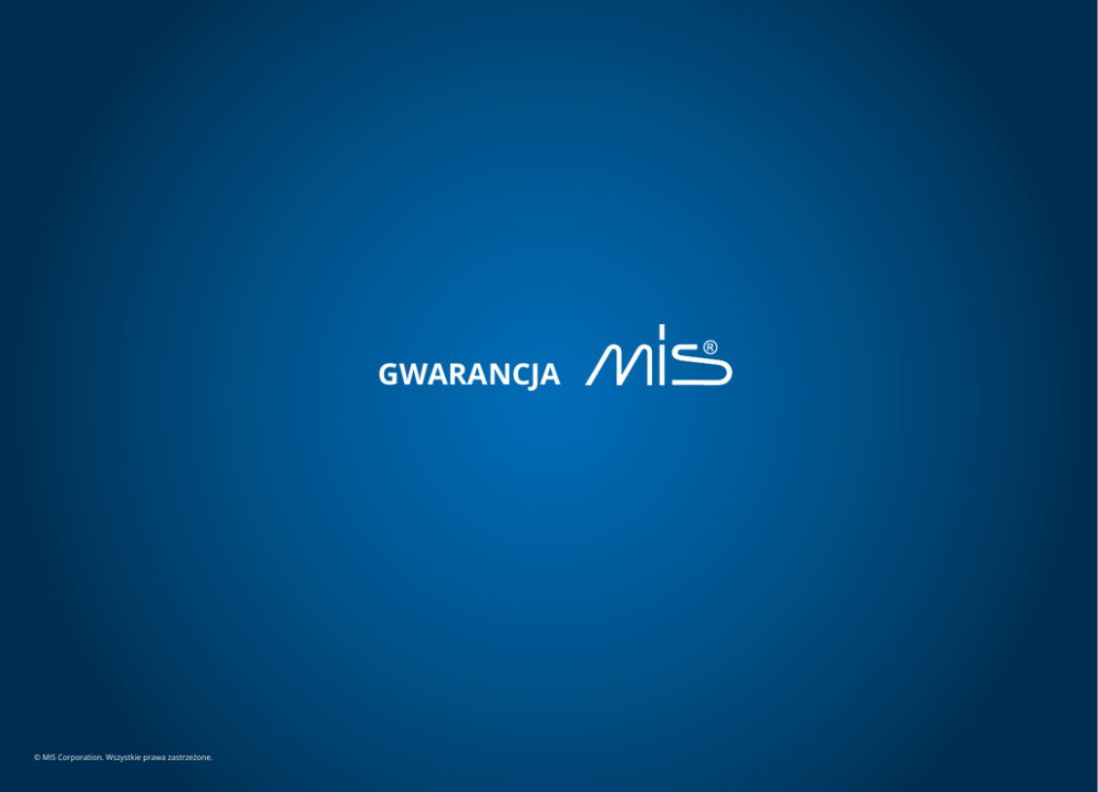 GWARANCJA © MIS Corporation. Wszystkie prawa zastrzeżone. 5-LETNIA GWARANCJA DOŻYWOTNIA GWARANCJA WARRANTY MIS IMPLANT SYSTEMS GWARANCJA MIS WS ZYSTK IE IMPLAN TY Wszystkie Systemy implantów MIS są wykonane z najwyższej jakości materiałów, zgodnie z najbardziej restrykcyjnymi praktykami w branży. Fakt,and że problemy z naszymi All MIS Implant Systemsprodukcyjnymi are made of obowiązującymi the highest quality materials in compliance withproduktami the most zdarzają się sporadycznie sprawia, że z dumą mówimy o naszej niezawodności. Jeśli jednak napotkają Państwo stringent production practices in the industry. We are extremely proud of our reliability, and problems are jakiekolwiek trudności związane z naszymi produktami, nasza polityka gwarancji udzielana pierwszemu very rare. However, should you experience any difficulties with our products, our warranty policy, to the nabywcy pełne zabezpieczenie. originalgwarantuje purchaser, Państwu assures you are completely protected. WARRANTY MIS IMPLANT SYSTEMS 3-LETNIA GWARANCJA WI ERTŁ A I NARZĘDZ IA ŁĄ CZ NIK I I AK CESORIA PROT C ETY ZN E Systemy implantów zostały przebadane klinicznie, udokumentowane zaplecze MISMIS implant systems have been clinically posiadają tested, scientifically documented, and are currently in use byprzez dental professionals w in klinikach clinics andi gabinetach practices throughout world. naukowe i są obecnie użytkowane stomatologów na całymthe świecie. Niniejsze Warunki Gwarancji obejmują wiertła i narzędzia, łączniki i akcesoria These warranty Terms & Conditions protetyczne do wszystkich modeli cover drills and tools, abutments and implantów („Produkty”) wytwarzanych prosthetic accessories for all MIS implant przez MIS Implants. Gwarancja określona models, (‘Products’) , manufactured by wMIS niniejszych Implants. Warunkach The warrantyograniczona as outlined jest wyłącznie kwalifikujących się do in the Terms do & Conditions is restricted objęcia lekarzytreating i nie działa na rzecz solely nią to eligible clinicians and WARRANTY TERMS & WARUNKI GWARANCJI CONDITIONS żadnych osóbof lub is not forinnych the benefit any podmiotów, other person włączając w to pacjentów, or entity; including patients, laboratoria laboratories or innych other intermediate suppliers. lub pośredników. 1. Okresy gwarancji Gwarancji na „Produkty” udziela się na następujące okresy, z zastrzeżeniem ograniczeń i wyjątków zawartych w niniejszych Warunkach: • dożywotnia gwarancja na wszystkie implanty, • pięcioletnia (5) gwarancja na łączniki i akcesoria protetyczne (liczona od daty dostarczenia użytkownikowi końcowemu), • trzyletnia (3) gwarancja na wiertła i narzędzia, z wyjątkiem wszelkich instrumentów jednorazowego użytku (liczona od daty dostarczenia użytkownikowi końcowemu). 2. Zakres gwarancji Z zastrzeżeniem ograniczeń i wyjątków opisanych w niniejszych Warunkach, MIS Implants zobowiązuje się do zapewnienia następujących świadczeń: Świadczenia jakościowe Jeżeli „Produkt” zostanie uznany za wadliwy pod względem materiałowym lub wykonawczym, tzn. jeżeli produkt nie spełnia standardów jakości MIS Implants, wówczas MIS Implants wymieni „Produkt” bezpłatnie. Świadczenia chirurgiczne MIS Implants zobowiązuje się do bezpłatnej wymiany implantu w przypadku, gdy implant został utracony (nie doszło do osteointegracji lub gdy osteointegracja się nie powiodła). Powyższe świadczenia stanowią jedyne zobowiązanie ze strony MIS Implants, a także jedyne środki zaradcze, z których może skorzystać Lekarz w odniesieniu do „Produktów” i przedmiotu niniejszych Warunków. 3. Procedura rozpatrywania reklamacji W celu skorzystania ze świadczeń udzielanych na mocy niniejszych Warunków Lekarz musi spełnić wszystkie poniższe Warunki: • Warunkiem zakwalifikowania reklamacji gwarancyjnej do rozpatrzenia jest zgłoszenie jej w ciągu trzydziestu (30) dni od daty wykrycia reklamowanej wady. Zgłoszenie musi być w pełni zgodne z procedurą określoną w niniejszych Warunkach. Lekarz zobowiązany jest do skontaktowania się z lokalnym dystrybutorem MIS w celu uzyskania formularza reklamacyjnego wraz z instrukcjami dotyczącymi zwrotu Produktu; oraz • Wypełniony formularz reklamacyjny dokumentujący przyczynę reklamowanego uszkodzenia należy odesłać do MIS Implants wraz z reklamowanym Produktem we wskazanym powyżej terminie. Każdy Produkt przed zwrotem do MIS Implants należy wysterylizować; oraz • Lekarze, którzy złożą formularz reklamacyjny w celu otrzymania świadczeń chirurgicznych, zobowiązani są do złożenia dokumentacji przypadku i wykazania, że wskazane było zastosowanie implantów oraz że nie istniały w przypadku tego konkretnego pacjenta żadne przeciwwskazania; oraz • Lekarz składający reklamację na podstawie niniejszych Warunków musi mieć uregulowane wszystkie wymagalne należności na rzecz MIS Implants lub jego lokalnego dystrybutora w chwili składania formularza reklamacyjnego; oraz • Wszelkie zabiegi z wykorzystaniem Produktów – przed wszczepieniem, w jego trakcie i potem – muszą zostać wykonanie zgodnie z protokołami, wytycznymi i instrukcjami MIS Implants, a także z ogólnie przyjętą praktyką stomatologiczną. • Koszty transportu i ryzyko transportowe dostarczenia „Produktu” do siedziby MIS Poland (lokalnego dystrybutora) ponosi Lekarz. Koszty wysyłki zwrotnej ponosi MIS Implants w przypadkach objętych gwarancją na mocy niniejszych Warunków. Niezależnie od roszczeń gwarancyjnych wszelkie reklamacje należy zgłaszać jak najszybciej dla zachowania wymogów regulacyjnych. 4. Ogólne warunki gwarancji Z wyjątkiem gwarancji określonej w niniejszych Warunkach ani MIS Implants, ani żadni przedstawiciele lub inne strony trzecie zajmujące się dystrybucją Produktów nie udzielają żadnych zapewnień, gwarancji ani innych zobowiązań wyraźny