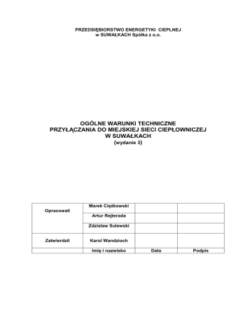 PRZEDSIĘBIORSTWO ENERGETYKI CIEPLNEJ w SUWAŁKACH Spółka z o.o. OGÓLNE WARUNKI TECHNICZNE PRZYŁĄCZANIA DO MIEJSKIEJ SIECI CIEPŁOWNICZEJ W SUWAŁKACH (wydanie 3) Marek CięŜkowski Opracowali Artur Rejterada Zdzisław Sulewski Zatwierdził Karol Wandzioch Imię i nazwisko Data Podpis Ogólne warunki przyłączania do miejskiej sieci ciepłowniczej Wydanie 3 1. WYDAWANIE WARUNKÓW PRZYŁĄCZENIA DO MIEJSKIEJ SIECI CIEPLNEJ 1.1.Przedsiębiorstwo Energetyki Cieplnej w Suwałkach spółka z o.o., zwany dalej PEC, wydaje warunki przyłączenia do miejskiej sieci cieplnej na podstawie Rozporządzenia Ministra Gospodarki z dnia 15 stycznia 2007r. w sprawie szczegółowych warunków funkcjonowania systemów ciepłowniczych / Dz. U. nr 16 poz.92 /. 1.2.Właściciel istniejącego obiektu lub Inwestor nowego obiektu występujący o zapewnienie dostawy energii cieplnej i wydanie warunków przyłączenia zobowiązany jest złoŜyć wniosek o przyłączenie do sieci ciepłowniczej zawierający: 1.2.1.Oznaczenie wnioskodawcy: a/ dokument potwierdzający tytuł prawny wnioskodawcy do korzystania z obiektu, do którego będzie dostarczane ciepło z sieci ciepłowniczej, b/ plan zabudowy lub szkic sytuacyjny, określający usytuowanie obiektu, do którego będzie dostarczane ciepło, w stosunku do istniejącej sieci ciepłowniczej oraz innych obiektów i urządzeń uzbrojenia terenu. 1.2.2.Określenie: a/ rodzaju i parametrów instalacji odbiorczych, b/ zamówionej mocy cieplnej i rodzaju potrzeb cieplnych oraz minimalnego poboru mocy cieplnej w okresie poza sezonem grzewczym, a w przypadku poboru ciepła dla celów technologicznych - harmonogram poboru mocy cieplnej w ciągu doby, tygodnia i roku, 1.2.3.Informację określającą roczne zapotrzebowanie ciepła na ogrzewanie m2 powierzchni ogrzewanych pomieszczeń oraz informację o wynikach audytu energetycznego, a w przypadku braku takich informacji - charakterystykę techniczną obiektu, do którego będzie dostarczane ciepło, a w szczególności informacje dotyczące: kubatury oraz powierzchni uŜytkowej ogrzewanych pomieszczeń, przeznaczenia ogrzewanych pomieszczeń, systemu wentylacji ogrzewanych pomieszczeń, przewidywanego sposobu podgrzewania wody uŜytkowej, strat cieplnych w obiekcie w warunkach obliczeniowych, a z braku takiej informacji określenie rodzaju zastosowanej izolacji cieplnej w przegrodach budowlanych, 1.2.4. Proponowany termin lub harmonogram rozpoczęcia poboru ciepła. 1.3. Wzór wniosku o przyłączenie do sieci ciepłowniczej przedstawia załącznik nr 1. 1.4. PEC określa warunki przyłączenia w terminie 30 dni od dnia złoŜenia wniosku określonego w pkt. 1.2. Warunki przyłączenia wydawane są Wnioskodawcy wraz z projektem umowy o przyłączenie. 1.5. Warunki przyłączenia węzłów cieplnych określają: - miejsce i sposób doprowadzenia przyłącza do węzła cieplnego, - miejsce rozgraniczenia własności instalacji lub urządzeń, znajdujących się w pomieszczeniu węzła cieplnego, między przedsiębiorstwem ciepłowniczym, a odbiorcą oraz miejsce rozgraniczenia ich eksploatacji przez przedsiębiorstwo ciepłownicze, - obliczeniowe natęŜenie przepływu nośnika ciepła i tabele regulacyjne. 1.5.1. Wymagania dotyczące: - układu technologicznego węzła cieplnego i instalacji odbiorczej ze względu na racjonalne wykorzystanie ciepła oraz oddziaływanie na warunki eksploatacji sieci ciepłowniczej i sterowanie pracą tej sieci, - miejsca zainstalowania: 2 Ogólne warunki przyłączania do miejskiej sieci ciepłowniczej Wydanie 3 a/ urządzenia regulującego natęŜenie przepływu nośnika ciepła dostarczanego do węzła cieplnego b/ układu pomiarowo-rozliczeniowego - regulacji ilości ciepła dostarczanego do instalacji odbiorczych, - zdalnego rejestrowania i kontrolowania parametrów nośnika ciepła oraz ilości ciepła dostarczanego do węzła cieplnego, - miejsca połączenia instalacji odbiorczej z przyłączem oraz miejsca zainstalowania urządzenia mierzącego ilość energii cieplnej i ilość wody, dostarczonych z sieci ciepłowniczej w celu napełniania instalacji odbiorczych oraz uzupełniania ubytków wody w instalacjach, 1.5.2. Inne informacje niezbędne do opracowania dokumentacji projektowej węzła cieplnego i instalacji odbiorczych. 1.5.3. Termin waŜności warunków przyłączenia. 1.6. Warunki przyłączenia są waŜne dwa lata od dnia ich wydania. 1.7.JeŜeli wniosek o przyłączenie dotyczy sieci ciepłowniczej, która nie jest przewidywana w miejscowym planie zagospodarowania przestrzennego, warunki przyłączenia powinny równieŜ określić zakres budowy sieci ciepłowniczej i przyłącza. 1.8. Umowa o przyłączenie określa: - strony zawierające umowę i obowiązki stron, -zakres prac projektowych i budowlano-montaŜowych oraz prac z przeprowadzaniem prób odbiorów końcowych, wykonywanych przez strony, - sposób koordynacji prac wykonywanych przez strony oraz kontroli dotrzymywania wymagań określonych w warunkach przyłączenia, - terminy: a/ zakończenia budowy przyłącza, węzła cieplnego i instalacji odbiorczych oraz terminy przeprowadzenia niezbędnych prób i odbiorów częściowych, b/ przeprowadzenia prób końcowych i ostatecznego odbioru przyłącza, węzła cieplnego i instalacji odbiorczych, - sposób finansowania budowy przyłącza, węzła cieplnego i instalacji odbiorczych oraz sposób i szczegółowe warunki rozliczania kosztów budowy, - przewidywany termin rozpoczęcia dostarczania ciepła, - odpowiedzialność stron za niedotrzymanie warunków umowy o przyłączenie, a w szczególności za opóźnienie terminu: a/ realizacji prac w stosunku do ustalonych w umowie, b/ rozpoczęcia dostarczania ciepła w sezonie grzewczym i poza tym sezonem, c/ rozpoczęcia odbioru ciepła w sezonie grzewczym i poza tym sezonem. 2.UZGADNIANIE DOKUMENTACJI TECHNICZNEJ Warunkiem podstawowym do uzgodnienia dokumentacji technicznej jest podpisana umowa przyłączeniowa. 2.1