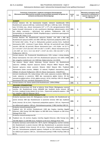RA-TL-Z-14/2016 Opis Przedmiotu Zamówienia - Część 2 Sukcesywna dostawa części i akcesoriów komputerowych oraz aplikacji biurowych Techniczne, funkcjonalne i użytkowe wymagania Zamawiającego Oferowane przez Wykonawców produkty muszą posiadać parametry nie gorsze niż wskazane poniżej przez Zamawiającego Załącznik 1.2 ilość Minimalny wymagany okres gwarancji (w miesiącach) z czasem naprawy max.10 dni roboczych 2 24 2 24 1 24 2 24 1 12 1 24 3 12 23% 2 12 9 tac odbiorczych papieru: 100 szt.; Zainstalowana pamięć: 2 MB; Interfejs USB 2.0; Drukarka monochromatyczna A4: Prędkość min. 50 str/min; Rozdzielczość 1200 dpi; Duplex; Interfejs Gigabit 23% Ethernet, USB; Pamięć 256 MB; Bęben na 300 000 stron; Podajnik na 100 stron; Obsługa PCL6 i PS3 Drukarka monochromatyczna A4: 1 12 10 Prędkość min. 35 str/min; Duplex; Interfejs Gigabit Ethernet, USB; Pamięć min. 23% 2 12 1 12 Poz. 1 2 3 stawka VAT SKANERY Format skanera: A3, do skanowania książek, element światłoczuły CCD. Rozdzielczość optyczna 600 dpi, rozdzielczość 600 dpi x 1200 dpi, kolor: 48 bitów wej./ 24 bitów wyj., obszar skanowania (12" x 17"), A3; oprogramowanie OCR, wąska krawędź skanowania w celu uzyskiwania idealnego odwzorowanie stron 23% bez efektu zszarzenia i deformacji linii grzbietu. Podłączenie: USB 2.0. Kompatybilny ze standardem TWAIN. Współpracujący z systemami operacyjnymi: Windows XP / Vista / 7 / 8 Format skanera: A4, Rozdzielczość optyczna (Szyba): min 600 x 600 dpi, Rozdzielczość optyczna (ADF): min 600 x 600 dpi, Pojemność podajnika (ADF): min 50 Kartek (A4/ Letter, 70 g/㎡), Maksymalna grubość poniżej 5mm, Szybkość skanowania ADF): minimum 9 ppm (Kolor, 200 dpi, A4 portret),20 ppm (Skala 23% szarości, 200 dpi, A4 portret), Obszar skanowania (szer. x dł.) Szyba: od 12.7 x 12.7 mm (0.5" x 0.5") do 216 x 297 mm (8.5" x 11.69") , Obszar skanowania (szer. x dł.) ADF: od 13.2 x 13.2 mm (0.52" x 0.52") do 216 x 356 mm (8.5" x 14"), Podłączenie: USB 2.0, Format skanera: A4, Przetwornik fotoelektryczny: CCD, Lampa z zimną katodą, Obszar skanowania: min 216 x 297 mm, Rozdzielczość optyczna: min 3200 x 6400 23% dpi, osiągalna rozdzielczość: min 3200 dpi, Glębia kolorów: min 48 Bit, Typ skanera: Skaner płaski, kolorowy, Format skanera: A4, Rozdzielczość optyczna: 1200dpi, Gęstość optyczna (kolor): Wejscie 48bit/ Wyjscie 24bit, 4 Gęstość optyczna (skala szarości): Wejscie 16bit/ Wyjscie 8bit, Prędkość 23% skanowania (skala szarości, 200dpi): 15 sekund, Prędkość skanowania (kolor, 5 6 7 8 11 200dpi): 32 sekund, Podłączenie: USB 2.0, Obszar skanowania: 216x297mm, element światłoczuły: CIS, rodzaj lampy: LED, rozdz. optyczna w pionie: 4800 dpi, rozdz. optyczna w poziomie: 4800 dpi, wewnętrzna głębia koloru: 48 bit, 23% zewnętrzna głębia koloru: 24 bit, głębia szarości: 16 bit, interfejs: USB 2.0; długość skanowania 297 mm; szerokość skanowania 215 mm Format skanera: A3, skaner płaski (CIS) Rozdzielczość: 1200x1200dpi 23% DRUKARKI ATRAMENTOWE Drukarka atramentowa A4: Druk w kolorze; Druk Photo; Obsługiwany rozmiar nośnika: A4; Rozdzielczość druku 600x600 dpi; Szybkość druku (mono) 28 23% str./min.; Szybkość druku (kolor) 22 str./min.; Pojemność podajnika papieru: 200 szt.; Interfejs: USB 2.0, Ethernet, Wi-Fi DRUKARKI LASEROWE MONOCHROMATYCZNE Drukarka laserowa mono A4: Obsługiwany rozmiar nośnika: A4; Rozdzielczość w pionie (mono): 600 dpi; Rozdzielczość w poziomie (mono): 600 dpi; Szybkość druku (mono): 18 str./min.; Pojemność podajników papieru: 150 szt.; Pojemność 256 MB; Bęben na 100 000 stron; Podajnik na 50 stron; Obsługa PCL6 i PS3 Drukarka laserowa czarno-biała A4 z Wi-Fi, Eprint: Obsługiwany rozmiar nośnika: A4; Rozdzielczość w pionie (mono): 600 dpi; Rozdzielczość w poziomie (mono): 600 dpi; Szybkość druku (mono): 18 str./min.; Pojemność podajników papieru: 23% 150 szt.; Zainstalowane podajniki papieru: Podajnik na 150 arkuszy; Pojemność tac odbiorczych papieru: 100 szt.; Zainstalowana pamięć: 8 MB; Interfejs USB 2.0; Wi-Fi; Strona 1 z 17 RA-TL-Z-14/2016 Opis Przedmiotu Zamówienia - Część 2 Sukcesywna dostawa części i akcesoriów komputerowych oraz aplikacji biurowych Załącznik 1.2 Drukarka laserowa czarno-biała A4 z dupleksem oraz interfejsem LAN i WiFi; Obsługiwane języki drukarek: PCL 5e; Obsługiwany rozmiar nośnika: A4; 12 Rozdzielczość w pionie (mono): 600 dpi; Rozdzielczość w poziomie (mono): 600 dpi; Szybkość druku (mono): 25 str./min.; Wydajność 15000 str./mies.; Pojemność 23% podajników papieru: 260 szt.; Pojemność tac odbiorczych papieru: 150 szt.; 2 12 23% 2 12 Zainstalowane podajniki papieru: 2x Podajnik na 500 arkuszy, Podajnik 23% 2 24 23% 4 12 23% 2 12 2 12 Automatyczny dupleks; Zainstalowana pamięć: 128 MB; Interfejs USB 2.0 HiSpeed; Ethernet 10/100; wireless 802.11b/g/n Drukarka laserowa mono A4 z dupleksem oraz interfejsem LAN: Obsługiwane języki drukarek: PCL 5c, PCL 6; PostScript Level 3; Obsługiwany rozmiar nośnika: A4; Rozdzielczość w pionie (mono): 1200 dpi; Rozdzielczość w poziomie (mono): 1200 dpi; Szybkość druku (mono): 33 str./min.; Wydajność min. 50000 str./mies.; 13 Pojemność podajników papieru: 300 szt.; Zainstalowane podajniki papieru: Podajnik na 250 arkuszy, Podajnik wielofunkcyjny na 50 arkuszy; pojemność nośników: 800 arkuszy.; Zainstalowane tace odbiorcze papieru: Tacka odbiorcza na 150 arkuszy; Automatyczny dupleks; Zainstalowana pamięć: 256 MB; Obsługiwana wielkość pamięci: 256 MB; Interfejs USB 2.0; Karta sieciowa (LAN): 10/100/1000 Drukarka laserowa mono A3 z dupleksem, interfejsem LAN oraz dodatkowym podajnikiem papieru: Emulacje: PCL 5e, PCL6, PostScript Level 3, IBM ProPrinter; Obsługiwany rozmiar nośnika: A3; Rozdzielczość w pionie (mono): 1200 dpi; Rozdzielczość w poziomie (mono): 1200 dpi; Szybkość druku (mono): 50 str./min.; 14 wielofunkcyjny na 100 arkuszy; Zai