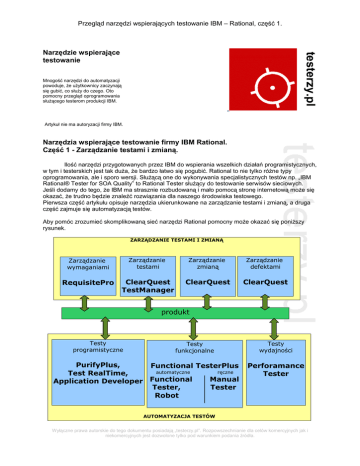 Przegląd narzędzi wspierających testowanie IBM – Rational, część 1. testerzy.pl Narzędzie wspierające testowanie Mnogość narzędzi do automatyzacji powoduje, że użytkownicy zaczynają się gubić, co służy do czego. Oto pomocny przegląd oprogramowania służącego testerom produkcji IBM. Artykuł nie ma autoryzacji firmy IBM. Narzędzia wspierające testowanie firmy IBM Rational. Część 1 - Zarządzanie testami i zmianą. Ilość narzędzi przygotowanych przez IBM do wspierania wszelkich działań programistycznych, w tym i testerskich jest tak duża, że bardzo łatwo się pogubić. Rational to nie tylko różne typy oprogramowania, ale i sporo wersji. Służącą one do wykonywania specjalistycznych testów np. „IBM Rational® Tester for SOA Quality” to Rational Tester służący do testowanie serwisów sieciowych. Jeśli dodamy do tego, że IBM ma strasznie rozbudowaną i mało pomocą stronę internetową może się okazać, że trudno będzie znaleźć rozwiązania dla naszego środowiska testowego. Pierwsza część artykułu opisuje narzędzia ukierunkowane na zarządzanie testami i zmianą, a druga część zajmuje się automatyzacją testów. Aby pomóc zrozumieć skomplikowaną sieć narzędzi Rational pomocny może okazać się poniższy rysunek. ZARZĄDZANIE TESTAMI I ZMIANĄ Zarządzanie wymaganiami Zarządzanie testami Zarządzanie zmianą Zarządzanie defektami RequisitePro ClearQuest TestManager ClearQuest ClearQuest produkt Testy programistyczne Testy funkcjonalne PurifyPlus, Functional TesterPlus automatyczne ręczne Test RealTime, Functional Manual Application Developer Tester, Tester Robot Testy wydajności Perforamance Tester AUTOMATYZACJA TESTÓW Wyłączne prawa autorskie do tego dokumentu posiadają „testerzy.pl”. Rozpowszechnianie dla celów komercyjnych jak i niekomercyjnych jest dozwolone tylko pod warunkiem podania źródła. Przegląd narzędzi wspierających testowanie IBM – Rational, część 1. Artykuł skupia się jedynie na narzędziach przydatnych testerom czarno- lub szaro- skrzynkowym, tak, więc PurifyPlus, Test RealTime oraz Application Developer nie został tu opisane. Rational® RequisitePro® - narzędzie zarządzania wymaganiami oraz przypadkami użycia. Użytkownikami tego narzędzia będą zespoły projektowe mające za cel poprawę jakości produktu jeszcze zanim rozpocznie się pisania kodu. Jest to baza danych, nie tylko przechowująca wymagania, ale umożliwiająca również ich łatwe filtrowanie i wyszukiwanie. Wymagania są ze sobą wielokrotnie powiązane lub wypływają jedno z drugiego. Dzięki RequisitePro można śledzić i kontrolować zmiany zachodzące na najwyższych i najniższych poziomach wymagań. Oczywiście oprogramowanie może łatwo zostać zintegrowane z całą platformą IBM dedykowane tworzeniu oprogramowania - Software Development Platform. Korzyści: −łatwy dostęp do wymagań bez względu na rolę w projekcie, czy też miejsce na mapie geograficznej, −wsparcie narzędziowe dla zarządzania wymaganiami i analizy wpływu (przy zmianie wymagań). Rational® ClearQuest® - narzędzie automatyzacji procesu tworzenia oprogramowania. Oferuje automatyzację procesu, raportowanie, śledzenie zmian i defektów dla poprawy przewidywalności i kontroli tworzenia oprogramowania. Narzędzie dostarcza ścieżek pracy (workflow), które łatwo mogą zostać dopasowane do potrzeb użytkowników. ClearQuest zarządza czynnikami programistycznymi i testowymi w zintegrowanym środowisku, dzięki czemu ułatwia komunikację programista – tester. Zapewnia funkcje bezpieczeństwa jak autoryzacja i podpis elektroniczny. Dostępny jest poprzez interfejs sieciowy oraz główne IDE takie jak IBM Rational Application Developer, IBM WebSphere Studio, Microsoft® Visual Studio 2005 i Eclipse framework. W środowisku zintegrowanym z IBM Rational ClearCase® dostarcza pełniejszej kontroli zmian w oprogramowaniu i zarządzaniu konfiguracją. Umożliwia kompleksowe zarządzanie wymaganiami, programowaniem, kompilowaniem, testami, implementacją i zarządzaniem portfolio. ClearQuest wspiera automatyzację i kontrolę procesu dla poprawienia efektywności. Funkcja Korzyści Automatyzacja procesu Powtarzalność, przewidywalność Śledzenie defektów i zmian Zarządzanie tematami do rozwiązania Raportowanie i metryki Poprawia przejrzystość projektu i procesu Ścieżki pracy Szybkie wdrożenie toku pracy Łatwa kastomizacja Modyfikacja interfejsu do potrzeb organizacji Zarządzanie zmianami oparte na aktywnościach Zdefiniowanie i zarządzanie zmianami jako aktywności Zarządzanie testami Zarządzanie testami i programowaniem w jednym narzędziu Śledzenie poszczególnych kompilacji i wdrażania Proces śledzenie w całym procesie tworzenia oprogramowania Interfejs sieciowy i IDE Dostęp do zasobów bazy z dowolnego miejsca Autoryzacja Zapewnia śledzenie zmian wprowadzanych Wyłączne prawa autorskie do tego dokumentu posiadają „testerzy.pl”. Rozpowszechnianie dla celów komercyjnych jak i niekomercyjnych jest dozwolone tylko pod warunkiem podania źródła. Przegląd narzędzi wspierających testowanie IBM – Rational, część 1. przez poszczególnych członków zespołu Podpis elektroniczny Identyfikowanie ludzi wykonujących akcje i dokonujących zmian Wsparcie audytów Śledzenie od pierwszych do ostatnich aktywności na bazie danych Skalowalność Dopasowanie do potrzeb i środowiska Integracja z ClearCase Zarządzanie zmianami z jednego punktu kontrolnego Wygląd okna raportowania defektu w ClearQuest. Rational® TestManager – centrum zarządzania testami, ich wykonaniem i raportowania. Wspiera wszystkie działania testerskie, od testowania ręcznego do skomplikowanych testów automatycznych łącznie z testowaniem komponentów, testami regresyjnymi i testami wydajności. Dostęp do TestManager-a powinni mieć wszyscy członkowie grupy projektowej dla zapewnienia wymiany takich informacji jak: 