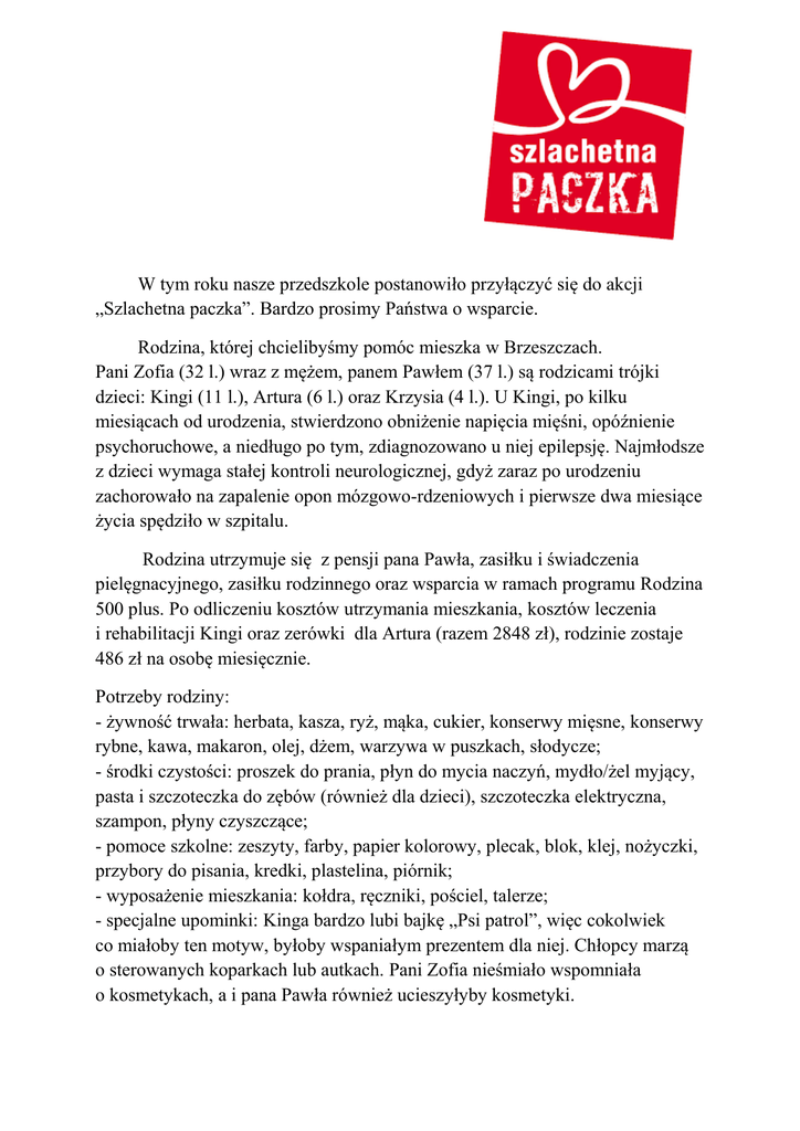 W tym roku nasze przedszkole postanowiło przyłączyć się do akcji „Szlachetna paczka”. Bardzo prosimy Państwa o wsparcie. Rodzina, której chcielibyśmy pomóc mieszka w Brzeszczach. Pani Zofia (32 l.) wraz z mężem, panem Pawłem (37 l.) są rodzicami trójki dzieci: Kingi (11 l.), Artura (6 l.) oraz Krzysia (4 l.). U Kingi, po kilku miesiącach od urodzenia, stwierdzono obniżenie napięcia mięśni, opóźnienie psychoruchowe, a niedługo po tym, zdiagnozowano u niej epilepsję. Najmłodsze z dzieci wymaga stałej kontroli neurologicznej, gdyż zaraz po urodzeniu zachorowało na zapalenie opon mózgowo-rdzeniowych i pierwsze dwa miesiące życia spędziło w szpitalu. Rodzina utrzymuje się z pensji pana Pawła, zasiłku i świadczenia pielęgnacyjnego, zasiłku rodzinnego oraz wsparcia w ramach programu Rodzina 500 plus. Po odliczeniu kosztów utrzymania mieszkania, kosztów leczenia i rehabilitacji Kingi oraz zerówki dla Artura (razem 2848 zł), rodzinie zostaje 486 zł na osobę miesięcznie. Potrzeby rodziny: - żywność trwała: herbata, kasza, ryż, mąka, cukier, konserwy mięsne, konserwy rybne, kawa, makaron, olej, dżem, warzywa w puszkach, słodycze; - środki czystości: proszek do prania, płyn do mycia naczyń, mydło/żel myjący, pasta i szczoteczka do zębów (również dla dzieci), szczoteczka elektryczna, szampon, płyny czyszczące; - pomoce szkolne: zeszyty, farby, papier kolorowy, plecak, blok, klej, nożyczki, przybory do pisania, kredki, plastelina, piórnik; - wyposażenie mieszkania: kołdra, ręczniki, pościel, talerze; - specjalne upominki: Kinga bardzo lubi bajkę „Psi patrol”, więc cokolwiek co miałoby ten motyw, byłoby wspaniałym prezentem dla niej. Chłopcy marzą o sterowanych koparkach lub autkach. Pani Zofia nieśmiało wspomniała o kosmetykach, a i pana Pawła również ucieszyłyby kosmetyki.