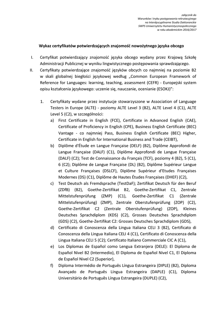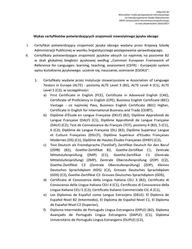 załącznik do Warunków i trybu postępowania rekrutacyjnego na Interdyscyplinarne Studia Doktoranckie SWPS Uniwersytetu Humanistycznospołecznego w roku akademickim 2016/2017 Wykaz certyfikatów potwierdzających znajomość nowożytnego języka obcego I. II. Certyfikat potwierdzający znajomość języka obcego wydany przez Krajową Szkołę Administracji Publicznej w wyniku lingwistycznego postępowania sprawdzającego. Certyfikaty potwierdzające znajomość języków obcych co najmniej na poziomie B2 w skali globalnej biegłości językowej według „Common European Framework of Reference for Languages: learning, teaching, assessment (CEFR) - Europejski system opisu kształcenia językowego: uczenie się, nauczanie, ocenianie (ESOKJ)”: 1. Certyfikaty wydane przez instytucje stowarzyszone w Association of Language Testers in Europe (ALTE) - poziomy ALTE Level 3 (B2), ALTE Level 4 (C1), ALTE Level 5 (C2), w szczególności: a) First Certificate in English (FCE), Certificate in Advanced English (CAE), Certificate of Proficiency in English (CPE), Business English Certificate (BEC) Vantage - co najmniej Pass, Business English Certificate (BEC) Higher, Certificate in English for International Business and Trade (CEIBT), b) Diplôme d'Étude en Langue Française (DELF) (B2), Diplôme Approfondi de Langue Française (DALF) (C1), Diplôme Approfondi de Langue Française (DALF) (C2); Test de Connaissance du Français (TCF), poziomy 4 (B2), 5 (C1), 6 (C2); Diplôme de Langue Française (DL) (B2), Diplôme Supérieur Langue et Culture Françaises (DSLCF), Diplôme Supérieur d'Etudes Françaises Modernes (DS) (C1), Diplôme de Hautes Études Françaises (DHEF) (C2), c) Test Deutsch als Fremdsprache (TestDaF); Zertifikat Deutsch für den Beruf (ZDfB) (B2), Goethe-Zertifikat B2, Goethe-Zertifikat C1, Zentrale Mittelstufenprüfung (ZMP) (C1), Goethe-Zertifikat C1 (Zentrale Mittelstufenprüfung) (ZMP), Zentrale Oberstufenprüfung (ZOP) (C2), Goethe-Zertifikat C2 (Zentrale Oberstufenprüfung) (ZOP), Kleines Deutsches Sprachdiplom (KDS) (C2), Grosses Deutsches Sprachdiplom (GDS) (C2), Goethe-Zertifikat C2: Grosses Deutsches Sprachdiplom (GDS), d) Certificato di Conoscenza della Lingua Italiana CELI 3 (B2), Certificato di Conoscenza della Lingua Italiana CELI 4 (C1), Certificato di Conoscenza della Lingua Italiana CELI 5 (C2); Certificato Italiano Commerciale CIC A (C1), e) Los Diplomas de Español como Lengua Extranjera (DELE): El Diploma de Español Nivel B2 (Intermedio), El Diploma de Español Nivel C1, El Diploma de Español Nivel C2 (Superior), f) Diploma Intermédio de Português Língua Estrangeira (DIPLE) (B2), Diploma Avançado de Português Língua Estrangeira (DAPLE) (C1), Diploma Universitário de Português Língua Estrangeira (DUPLE) (C2), załącznik do Warunków i trybu postępowania rekrutacyjnego na Interdyscyplinarne Studia Doktoranckie SWPS Uniwersytetu Humanistycznospołecznego w roku akademickim 2016/2017 g) Nederlands als Vreemde Taal/Dutch as a Foreign Language (CNaVT) Profiel Professionele Taalvaardigheid (PPT) (B2)/Profile Professional Language Proficiency (PPT) (B2), Profiel Taalvaardigheid Hoger Onderwijs (PTHO) (B2)/Profile Language Proficiency Higher Education (PTHO) (B2), Profiel Academische Taalvaardigheid (PAT) (C1)/Profile Academic Language Proficiency (PAT) (C1); Nederlands als Tweede Taal II (NT2 II) (B2)/Dutch as a Second Language II (NT2-II) (B2), h) Prøve i Dansk 3 (B2), Studieprøven (C1), i) Certyfikat znajomości języka słoweńskiego na poziomie średniozaawansowanym/Certificate of Slovene on the Intermediate Level (B2), Certyfikat znajomości języka słoweńskiego na poziomie zaawansowanym/Certificate of Slovene on the Advanced Level (C1); 2. Certyfikaty następujących instytucji: a) Educational Testing Service (ETS) - w szczególności certyfikaty: Test of English as a Foreign Language (TOEFL) - co najmniej 87 pkt w wersji Internet-Based Test (iBT); Test of English as a Foreign Language (TOEFL) - co najmniej 180 pkt w wersji Computer-Based Test (CBT) uzupełnione o co najmniej 50 pkt z Test of Spoken English (TSE); Test of English as a Foreign Language (TOEFL) - co najmniej 510 pkt w wersji Paper-Based Test (PBT) uzupełnione o co najmniej 3,5 pkt z Test of Written English (TWE) oraz o co najmniej 50 pkt z Test of Spoken English (TSE); Test of English for International Communication (TOEIC) - co najmniej 700 pkt; Test de Français International (TFI) - co najmniej 605 pkt, b) European Consortium for the Certificate of Attainment in Modern Languages (ECL), c) City Guilds, City Guilds Pitman Qualifications, Pitman Qualifications Institute - w szczególności certyfikaty: English for Speakers of Other Languages (ESOL) - First Class Pass at Intermediate Level, Higher Intermediate Level, Advanced Level; International English for Speakers of Other Languages (IESOL) - poziom „Communicator”, poziom „Expert”, poziom „Mastery”; City Guilds Level 1 Certificate in ESOL International (reading, writing and listening) Communicator (B2) 500/1765/2; City Guilds Level 2 Certificate in ESOL International (reading, writing and listening) Expert (C1) 500/1766/4; City Guilds Level 3 Certificate in ESOL International (reading, writing and listening) Mastery (C2) 500/1767/6; Spoken English Test (SET) for Business - Stage B poziom „Communicator”, Stage C poziom „Expert”, Stage C poziom „Mastery”; English for Business Communications (EBC) - Level 2, Level 3; English for Office Skills (EOS) - Level 2, załącznik do Warunków i trybu postępowania rekrutacyjnego na Interdyscyplinarne Studia Doktoranckie SWPS Uniwersytetu Humanistycznospołecznego w roku akademickim 2016/2017 d) Edexcel, Pearson Language Tests, Pearson Language Assessments w szczególności certyfikaty: London Tests of English, Level 3 (Edexcel Level 1 Certificate in ESOL International); London Tests of English, Level 4 (Edexcel Level 2 Certificate in ESOL International); London Tests o
