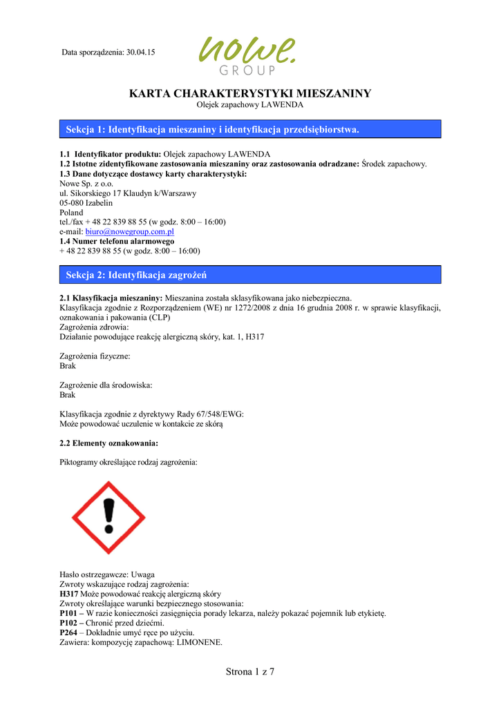 Data sporządzenia: 30.04.15 KARTA CHARAKTERYSTYKI MIESZANINY Olejek zapachowy LAWENDA Sekcja 1: Identyfikacja mieszaniny i identyfikacja przedsiębiorstwa. 1.1 Identyfikator produktu: Olejek zapachowy LAWENDA 1.2 Istotne zidentyfikowane zastosowania mieszaniny oraz zastosowania odradzane: Środek zapachowy. 1.3 Dane dotyczące dostawcy karty charakterystyki: Nowe Sp. z o.o. ul. Sikorskiego 17 Klaudyn k/Warszawy 05-080 Izabelin Poland tel./fax + 48 22 839 88 55 (w godz. 8:00 – 16:00) e-mail: [email protected] 1.4 Numer telefonu alarmowego + 48 22 839 88 55 (w godz. 8:00 – 16:00) Sekcja 2: Identyfikacja zagrożeń 2.1 Klasyfikacja mieszaniny: Mieszanina została sklasyfikowana jako niebezpieczna. Klasyfikacja zgodnie z Rozporządzeniem (WE) nr 1272/2008 z dnia 16 grudnia 2008 r. w sprawie klasyfikacji, oznakowania i pakowania (CLP) Zagrożenia zdrowia: Działanie powodujące reakcję alergiczną skóry, kat. 1, H317 Zagrożenia fizyczne: Brak Zagrożenie dla środowiska: Brak Klasyfikacja zgodnie z dyrektywy Rady 67/548/EWG: Może powodować uczulenie w kontakcie ze skórą 2.2 Elementy oznakowania: Piktogramy określające rodzaj zagrożenia: Hasło ostrzegawcze: Uwaga Zwroty wskazujące rodzaj zagrożenia: H317 Może powodować reakcję alergiczną skóry Zwroty określające warunki bezpiecznego stosowania: P101 – W razie konieczności zasięgnięcia porady lekarza, należy pokazać pojemnik lub etykietę. P102 – Chronić przed dziećmi. P264 – Dokładnie umyć ręce po użyciu. Zawiera: kompozycję zapachową: LIMONENE. Strona 1 z 7 Data sporządzenia: 30.04.15 KARTA CHARAKTERYSTYKI MIESZANINY Olejek zapachowy LAWENDA 2.3 Inne zagrożenia: Brak. Mieszanina nie spełnia kryteriów PBT i vPvB zgodnie z załącznikiem XIII do rozporządzenia (WE) nr 1907/2006. Sekcja 3: Skład i informacja o składnikach 3.2 Mieszanina Opis mieszaniny: ciekła mieszanina związków organicznych Składniki niebezpieczne: Nazwa 4-tert-BUTYLCYCLOHEXYL ACETATE DIHYDROMYRCENOL BORNANON tetrahydro-4-methyl-2-(2-methylpropyl)- 2Hpyran-4-ol Numery CAS: 32210-23-4 WE: 250-954-9 CAS: 18479-58-8 WE: 242-362-4 CAS: 76-22-2 WE: 200-945-0 CAS: 63500-71-0 WE: 405-040-6 Numery rejestr. REACH: 01-2119976286-24-xxxx 01-2119457274-37-xxxx 01-2119966156-31-xxxx 01-0000015458-64-xxxx Klasyfikacja 1272/2008 % wag Skin Sens. 1, H317 10 – 15 Eye Irrit. 2; H319 Skin Irrit. 2, H315 Acute Tox. 4; H302 Acute Tox. 4; H332 Eye Irrit. 2; H319 2–5 1–2 1–2 Pełna treść przytoczonych zwrotów wskazujących rodzaj zagrożenia znajduje się w rozdziale 16. Sekcja 4: Środki pierwszej pomocy 4.1 Opis środków pierwszej pomocy Drogi narażenia: przez drogi oddechowe, przez kontakt ze skórą, z oczami oraz przez przewód pokarmowy. W przypadku wdychania: W razie zawrotów głowy lub nudności wyprowadzić poszkodowanego na świeże powietrze, w razie braku szybkiej poprawy zasięgnąć porady lekarza. W przypadku kontaktu ze skórą: Zdjąć zanieczyszczoną odzież. Umyć skórę wodą z mydłem. W przypadku poparzenia nałożyć jałowy opatrunek. W przypadku trwałego podrażnienia skóry zwrócić się do lekarza. W przypadku kontaktu z oczami: Usunąć szkła kontaktowe. Płukać oczy z otwartą powieką przez kilka minut dużą ilością wody. Niezwłocznie zasięgnąć porady lekarza. W przypadku połknięcia: Nie powodować wymiotów. Przepłukać jamę ustną i wypić dużą ilość wody. W przypadku utrzymującej się dolegliwości zasięgnąć porady lekarza. 4.2 Najważniejsze ostre i opóźnione objawy oraz skutki narażenia Brak. 4.3. Wskazania dotyczące wszelkiej natychmiastowej pomocy lekarskiej i szczególnego postępowania z poszkodowanym O sposobie postępowania decyduje lekarz po ocenie stanu poszkodowanego. Sekcja 5: Postępowanie w przypadku pożaru 5.1. Środki gaśnicze Właściwe środki gaśnicze: Dwutlenek węgla, piana, proszek lub strumień wody. Środki gaśnicze, których nie wolno używać: Strumień wody pod wysokim ciśnieniem. 5.2. Szczególne zagrożenia związane z mieszaniną Mieszanina nie jest palna. W wyniku działania podwyższonej temperatury mogą wydzielać się szkodliwe gazy. 5.3. Informacje dla straży pożarnej Podczas gaszenia pożaru stosować urządzenia oddechowe z własnym obiegiem powietrza i odzież ochronną na całą sylwetkę. Strona 2 z 7 Data sporządzenia: 30.04.15 KARTA CHARAKTERYSTYKI MIESZANINY Olejek zapachowy LAWENDA Sekcja 6: Postępowanie w przypadku niezamierzonego uwolnienia do środowiska 6.1 Indywidualne środki ostrożności, wyposażenie ochronne i procedury w sytuacjach awaryjnych Unikać kontaktu ze skórą. Nie wdychać par. Stosować rękawice ochronne z kauczuku butylowego, gumy nitrylowej lub neoprenu. Jeśli zachodzi potrzeba likwidacji szkód należy nałożyć odzież ochronną gazoszczelną i aparat izolujący drogi oddechowe. 6.2 Środki ostrożności w zakresie ochrony środowiska Zapobiegać rozprzestrzenianiu się oraz przedostaniu do kanalizacji i zbiorników wodnych. Powstrzymać lub absorbować wyciekającą ciecz piaskiem, ziemią lub innymi odpowiednimi materiałami. Jeśli substancja dostała się do zbiornika wody, kanału lub została rozlana na glebę oraz roślinność, zawiadomić straż pożarną. 6.3 Metody i materiały zapobiegające rozprzestrzenianiu się skażenia i służące do usuwania skażenia Preparat zebrać mechanicznie. Zebrać materiałami pochłaniającymi ciecze (np. piasek, ziemia, uniwersalne substancje wiążące, krzemionka, trociny, itp.). Usuwaniem powinny zająć się specjalistyczne służby – straż pożarna. 6.4 Odniesienia do innych sekcji Środki ochrony osobistej – sekcja 8. Postępowanie z odpadami – sekcja 13. Sekcja 7: Postępowanie z mieszaniną i jej magazynowanie 7.1 Środki ostrożności dotyczące bezpiecznego postępowania Stosować powszechnie obowiązujące zasady obchodzenia się z chemikaliami. Zabrudzone środkiem ubranie natychmiast zdjąć. Nie wdychać par, unikać bez