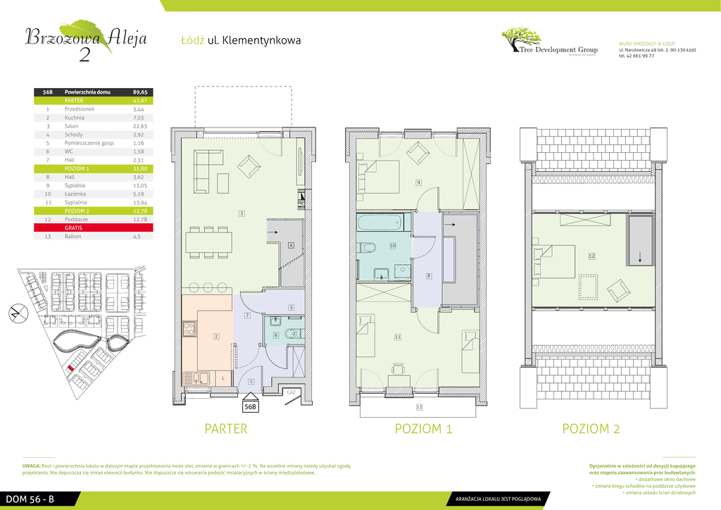 Łódź ul. Klementynkowa 56B Powierzchnia domu 89,65 PARTER 41,07 1 Przedsionek 3,44 2 Kuchnia 7,03 3 Salon 22,63 4 Schody 2,92 5 Pomieszczenie gosp. 1,16 6 WC 1,58 7 Hall 2,31 POZIOM 1 35,80 8 Hall 3,62 9 Sypialnia 13,05 10 Łazienka 5,19 11 Sypialnia 13,94 POZIOM 2 12,78 Poddasze 12,78 12 BIURO SPRZEDAŻY W ŁODZI: ul. Narutowicza 49 lok. 2, 90-130 Łódź tel. 42 661 99 77 9 3 GRATIS 13 Balkon 4,5 4 10 12 D AZ WJ 8 5 7 6 2 L 11 1 GAZ 56B PARTER 13 POZIOM 2 POZIOM 1 Opcjonalnie w zależności od decyzji kupującego oraz stopnia zaawansowania prac budowlanych: • dodatkowe okno dachowe • zmiana biegu schodów na poddasze użytkowe • zmiana układu ścian działowych UWAGA: Rzut i powierzchnia lokalu w dalszym etapie projektowania może ulec zmianie w granicach +/- 2 %. Na wszelkie zmiany należy użyskać zgodę projektanta. Nie dopuszcza się zmian elewacji budynku. Nie dopuszcza się wkuwania podejść instalacyjnych w ściany międzylokalowe. DOM 56 - B ARANŻACJA LOKALU JEST POGLĄDOWA