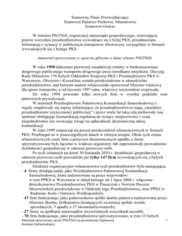 Szanowny Panie Przewodniczący Szanowni Państwo Posłowie, Ministrowie Szanowni Goście W imieniu PIGTSiS, organizacji samorządu gospodarczego, zrzeszającej prawie wszystkie przedsiębiorstwa wywodzące się z byłej PKS, przedstawiam Informację o sytuacji w publicznym transporcie zbiorowym, szczególnie w firmach wywodzących się z byłego PKS. (materiał opracowano w oparciu głównie o dane własne PIGTSiS) W roku 1990 dokonano pierwszej zasadniczej zmiany w funkcjonowaniu drogowego publicznego transportu drogowego poza ośrodkami miejskimi. Decyzją Rady Ministrów 176 byłych Oddziałów Krajowej PKS i Przedsiębiorstw PKS w Warszawie, Olsztynie i Koszalinie zostało przekształcone w samodzielne przedsiębiorstwa, nad którymi nadzór właścicielski sprawował Minister właściwy dla spraw transportu, a od stycznia 1997 roku, właściwy terytorialnie wojewoda. Do roku 1998 powstało kilka nowych firm w wyniku podziału oraz pierwszych prywatyzacji. W statutach Przedsiębiorstw Państwowej Komunikacji Samochodowej z reguły znajdowały się zapisy informujące, że przedsiębiorstwa te mają „charakter przedsiębiorstw użyteczności publicznej” i przez wiele lat taką rolę próbowały one spełniać obsługując komunikacją regularną do tysięcy miejscowości i osad, niejednokrotnie nie zwracając uwagi na opłacalność ekonomiczną takiej komunikacji. W roku 1999 rozpoczął się proces przekształceń własnościowych w firmach PKS. Przebiegał on w poszczególnych latach w różnym tempie. Obok tych zmian własnościowych część firm z przyczyn ekonomicznych upadła, a firmy sprywatyzowane były łączone w większe organizmy lub zaprzestawały prowadzenia działalności gospodarczej w zakresie przewozu osób. Po tych zmianach na dzień 30 listopada 2010 r. działalność gospodarczą w zakresie przewozu osób prowadziło już tylko 147 firm wywodzących się z byłych przedsiębiorstw PKS. Struktura organizacyjno-własnościowa tych przedsiębiorstw była następująca: - 4 firmy działają nadal, jako Przedsiębiorstwa Państwowej Komunikacji Samochodowej, które nadzorowane są przez wojewodów: w tym PPKS w Warszawie w skład którego od 1 lipca 2008 r. włączono dotychczasowe Przedsiębiorstwa PKS w Piasecznie i Nowym Dworze Mazowieckim przekształcone w Oddziały tego Przedsiębiorstwa, oraz PPKS w Radomiu, Kole i Ostrowie Wielkopolskim. - 47 firm funkcjonuje, jako jednoosobowe spółki skarbu państwa nadzorowane przez Ministra Skarbu, (kilkanaście działających wcześniej spółek zostało sprzedanych, 3 upadły a 27 skomunalizowanych); - 27 firmy są spółkami samorządów terytorialnych wszystkich szczebli; - 70 firm funkcjonuje, jako przedsiębiorstwa sprywatyzowane, w tym 13 byłych Materiał opracowany przez PIGTSiS na posiedzenie Sejmowej Komisji Infrastruktury. 1 przedsiębiorstw tworzy jedno duże wielozakładowe przedsiębiorstwo Veolia. (49 przedsiębiorstw to spółki pracownicze, które je przejęły w odpłatne użytkowanie). W omawianym okresie 14 przedsiębiorstw upadło, ponadto z przyczyn organizacyjnych zlikwidowano łącznie 19 samodzielnych przedsiębiorstw, także z przyczyn ekonomicznych 4 firmy zaprzestały realizacji zadań przewozowych. W roku 1997 dokonano kolejnej zasadniczej zmiany w funkcjonowaniu drogowej komunikacji publicznej. Wprowadzono zezwolenia na realizację konkretnych linii przewozowych wydawane przez wojewodów i ministra właściwego ds. transportu, i otwarto formalnie rynek dla kilku tysięcy nowych firm posiadających najczęściej jeden lub kilka autobusów. Od dnia 1 stycznia 2002 r. funkcje organizatora komunikacji przejęły organy samorządów terytorialnych wszystkich szczebli. Powstał wtedy prawny system funkcjonowania publicznego transportu drogowego, który obowiązuje do chwili obecnej. Wśród tego typu przewozów osób dominującą rolę odgrywają przewozy uczniów do szkół, co od pewnego czasu, na skutek kolejnych decyzji rządowych zastępuje się przewozami organizowanymi przez gminy przy pomocy tzw. „gimbusów”., oraz stale malejące przewozy osób starszych do pracy, szkół wyższych, do lekarza, itp. W wyniku wzrastającej konkurencyjności w zakresie ilości firm przewozowych operujących na rynku, na bardzo wielu liniach komunikacyjnych została zdublowana komunikacja, szczególnie w relacjach, gdzie występują większe potoki podróżnych. Panująca sytuacja na rynku przewozowym ma niekorzystny wpływ na sytuację ekonomiczną znacznej ilości przewoźnikom, w tym firm PKS. W tym okresie nastąpiły olbrzymie zmiany w autobusowej regionalnej komunikacji regularnej. Pojawiały się na tym rynku nowo tworzone małe przedsiębiorstwa, oraz bardzo duża liczba osób fizycznych, które realizują takie przewozy. Przez pierwsze 8 lat nie było w tym względzie praktycznie żadnej regulacji prawnej. Od 1998 r. na wykonywanie przewozów regularnych wprowadzono wymóg uzyskania zezwolenia wydawanego przez wojewodów lub ministra właściwego do spraw transportu. Funkcjonowała także tzw. koordynacja rozkładów jazdy. Liberalizacja i deregulacja rynku przewozów pasażerskich spowodowała, że nowe podmioty rozpoczynały obsługę linii i kursów zapewniających wysoką rentowność, także PPKS stopniowo odchodziły od obsługi nierentownych kursów. Od 2002 roku kompetencje do wydawania zezwoleń na wykonywanie krajowych przewozów regularnych zostały przekazane do organów administracji samorządowej. Działalność gospodarcza w drogowym transporcie osób formalnie jest działalnością podlegającą regulacji prawnej. Regulacja prawna w tym zakresie opiera się na ustawie z 06 września 2001 r. o transporcie drogowym. Materiał opracowany przez PIGTSiS na posiedzenie Sejmowej Komisji Infrastruktury. 2 Ustawa wyznacza na regulatora rynku – organy administracji samorządowej wszystkich szczebli. Praktycznie jednak, ta rola sprowadza się wyłącznie do wydania niezbędnej decyzji