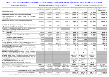 OFERTA SPECJALNA GRUPOWEGO UBEZPIECZENIA PRACOWNICZEGO DLA PRACOWNIKÓW POLITECHNIKI ŚLĄSKIEJ W GLIWICACH Rodzaje zdarzeń losowych WYSOKOŚĆ ŚWIADCZEŃ- warianty dotychczasowe Wariant I Suma ub.: 8 000 Zgon ubezpieczonego Wariant II Wariant III Suma ub.: 8 500 Suma ub.: 7 000 WYSOKOŚĆ ŚWIADCZEŃ- warianty proponowane Współmałżonkowie PROPOZYCJA-I PROPOZYCJA-II PROPOZYCJA-III Współmałżonkowie Suma ub.: 7 000 Suma ub.: 9 000 Suma ub.: 9 000 Suma ub.: 10 000 i pełnoletnie dzieci Suma ub.: 8 000 30 000 zł 31 250 zł 27 500 zł 12 250 zł 45 000 zł 45 000 zł 50 000 zł 20 000 zł Zgon ubezpieczonego w wyniku nieszczęśliwego wypadku 60 000 zł 62 500 zł 55 000 zł 24 500 zł 90 000 zł 90 000 zł 100 000 zł 40 000 zł Zgon ubezpieczonego śródmózgowego 50 000 zł 52 500 zł 45 000 zł 12 250 zł 67 500 zł 67 500 zł 75 000 zł 20 000 zł 68 000 zł 71 000 zł 62 000 zł 31 500 zł 112 500 zł 112 500 zł 125 000 zł 60 000 zł 320 zł 340 zł 280 zł 280 zł 360 zł 360 zł 400 zł 320 zł 320 zł 340 zł 280 zł 360 zł 360 zł 400 zł 8 000 zł 16 000 zł 2 400 zł 1 600 zł 1 600 zł 1 200 zł 8 500 zł 17 000 zł 2 550 zł 7 000 zł 14 000 zł 2 100 zł 1 400 zł 1 400 zł 700 zł 7 000 zł 7 000 zł 2 100 zł 1 400 zł 1 400 zł 700 zł 9 000 zł 18 000 zł 2 700 zł 2 700 zł 1 800 zł 1 350 zł 9 000 zł 18 000 zł 2 700 zł 10 000 zł 20 000 zł 2 700 zł 8 000 zł 16 000 zł 2 400 zł 1 600 zł 1 600 zł 800 zł 3 200 zł 3 400 zł 2 800 zł 2 800 zł 3 600 zł 3 600 zł 3 600 zł 3 200 zł 80 zł 85 zł 70 zł 70 zł 90 zł 90 zł 100 zł 80 zł 40 zł 42,50 zł 35 zł 35 zł 45 zł 45 zł 50 zł 40 zł w wyniku zawału lub krwotoku Zgon ubezpieczonego w wyniku wypadku komunikacyjnego Za każdy 1% trwałego uszczerbku na zdrowiu ubezpieczonego spowodowany nieszczęśliwym wypadkiem Za każdy 1% trwałego uszczerbku na zdrowiu ubezpieczonego spowodowany zawałem lub krwotokiem śródmózgowym Zgon współubezpieczonych: Małżonka Małżonka w wyniku nieszczęśliwego wypadku Dziecka Noworodka martwo urodzonego Rodziców i teściów ubezpieczonego Urodzenie się dziecka ubezpieczonemu Z tytułu osierocenia , świadczenie dla każdego dziecka ubezpieczonego w wieku do 18 lat, a w razie uczęszczania do szkoły w wieku do 25 lat Za każdy dzień pobytu w szpitalu w okresie pierwszych 14 dni, jeśli pobyt był spowodowany nieszczęśliwym wypadkiem Za każdy dzień pobytu w szpitalu za okres powyżej 14 dni, jeśli pobyt był spowodowany nieszczęśliwym wypadkiem, lub za każdy dzień pobytu w szpitalu nie spowodowany wypadkiem Dodatkowe Świadczenia Medyczne: Koszty Leczenia Szpitalnego (min 4 dni) - pobyt w Polsce, UE oraz Australii, Nowej Zelandii, Islandii, Japonii, Kanadzie, USA, Monako, Szwajcarii, Norwegii, Watykanie za każdy dzień pobytu w szpitalu spowodowanego nieszczęśliwym wypadkiem ,wypadkiem komunikacyjnym lub wypadkiem w pracy /do 14 dni/ za każdy dzień pobytu w szpitalu spowodowanego zawałem lub wylewem śródmózgowym /do 14 dni/ TAK TAK TAK 22,50 zł dodatkowo 22,50 zł dodatkowo za 25 zł dodatkowo za za każdy dzień każdy dzień każdy dzień 22,50 zł dodatkowo za każdy dzień za każdy dzień rekonwalescencji /do 30 dni/ 22,50 zł za każdy Operacje chirurgiczne Klasa I/ Klasa II/ Klasa III 2 400 zł 1 500 zł/900 zł/300zł 2 100 zł 2 550 zł 1 500 zł/900 zł/300zł (zakres podstawowy) 1 500 zł/900 zł/300zł 1 500 zł/900 zł/300 zł Opieka Medyczna wariant INTRO ŁĄCZNA SKŁADKA MIESIĘCZNA 54,48 zł 45,00 zł 44,72 zł 44,90 zł 22,50 zł dodatkowo za każdy dzień 25 zł dodatkowo za każdy dzień 22,50 zł za każdy dzień 25 zł za każdy dzień 450 zł 450 zł 500 zł 2 700 zł 2 700 zł 3 000 zł dzień Pobyt na OIT (Odział Intensywnej Terapii) - jednorazowo Ciężkie choroby w zakresie rozszerzonym 2 100 zł 2 000 zł/1 200 zł/400 zł 2 000 zł/1 200 zł/400 zł 2 000 zł/1 200 zł/400 zł TAK TAK TAK 63,00 zł 59,50 zł 51,40 zł 2 400 zł (zakres podstawowy) 2 000 zł/1 200 zł/400 zł 50,00 zł Niniejsza ulotka/ oferta, kalkulacje składek i wysokości świadczeń mają charakter informacyjny i nie są ofertą handlową w rozumieniu art. 66 Kodeksu Cywilnego. PZU Życie SA nie odpowiada za ewentualne pomyłki w druku.
