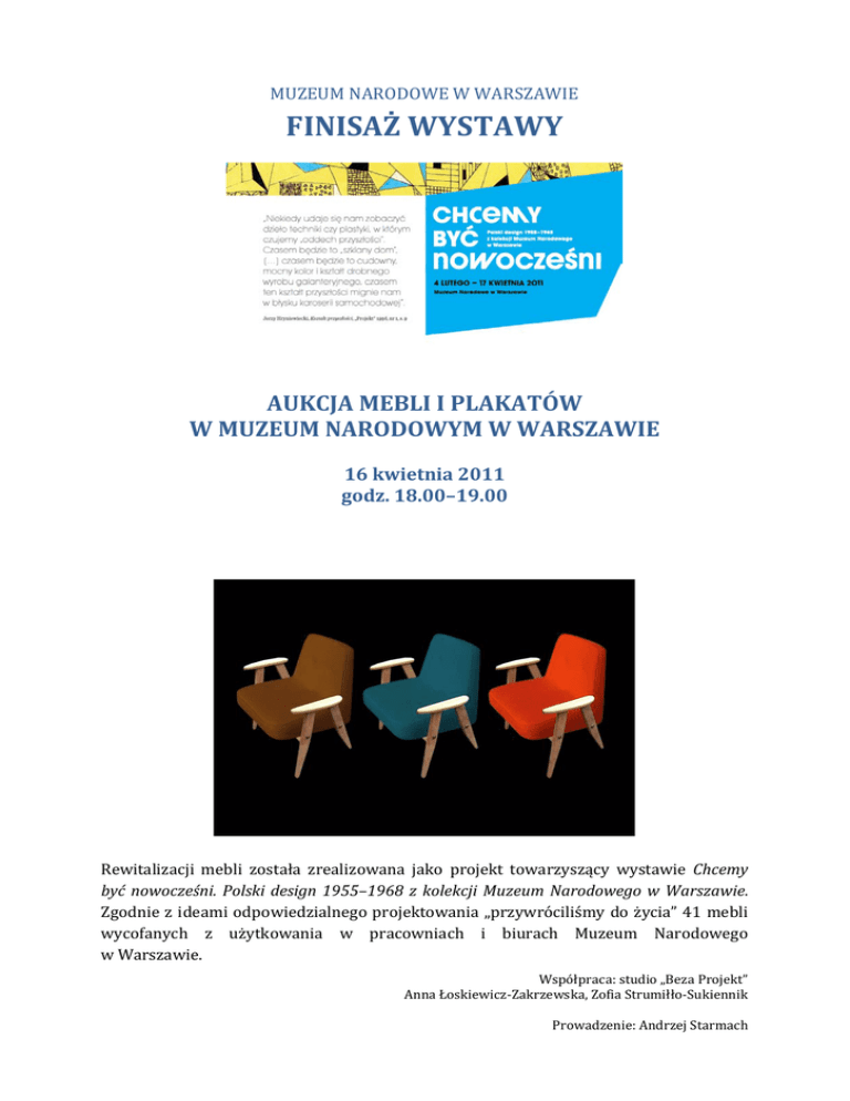 MUZEUM NARODOWE W WARSZAWIE FINISAŻ WYSTAWY AUKCJA MEBLI I PLAKATÓW W MUZEUM NARODOWYM W WARSZAWIE 16 kwietnia 2011 godz. 18.00–19.00 Rewitalizacji mebli została zrealizowana jako projekt towarzyszący wystawie Chcemy być nowocześni. Polski design 1955–1968 z kolekcji Muzeum Narodowego w Warszawie. Zgodnie z ideami odpowiedzialnego projektowania „przywróciliśmy do życia” 41 mebli wycofanych z użytkowania w pracowniach i biurach Muzeum Narodowego w Warszawie. Współpraca: studio „Beza Projekt” Anna Łoskiewicz-Zakrzewska, Zofia Strumiłło-Sukiennik Prowadzenie: Andrzej Starmach WYKAZ LICYTOWANYCH MEBLI 1) Fotel „366”, proj. Józef Chierowski, lata 60. – przed rewitalizacją Fotele „366” projektu Józefa Chierowskiego – pierwotna wersja modelu pochodzi z 1962 r.; wykonany w Dolnośląskiej Fabryce Mebli w Świebodzicach, egzemplarze muzealne wyprodukowała Powiatowa Spółdzielnia Usług Wielobranżowych „Węgierka” w Przasnyszu (20 sztuk) Wśród mebli utrzymanych w stylu przełomu lat 50. i 60. ważną rolę odegrał fotel „366” projektu Józefa Chierowskiego (późniejszego profesora wrocławskiej Państwowej Wyższej Szkoły Sztuk Plastycznych). Model ten powstał w 1962 roku w fabryce Świebodzicach w momencie, kiedy po pożarze zakładu wznowiono produkcję, wprowadzając nowy – zgodny z nowoczesną stylistyką – wzór. Fotel Chierowskiego ma prostą, łatwą w produkcji konstrukcję i wygodne tapicerowane siedzisko. Dzięki swojej lekkiej zgrabnej formie zdobył taką popularność, że produkowano go przez kilka dziesięcioleci w fabryce świebodzickiej, a także w innych mniejszych firmach, gdzie powstawały jego mniej lub bardziej wierne kopie. Siedzisko fotela ma trapezowaty kształt, a zwężone ku dołowi i rozstawione na zewnątrz nogi tworzą ażurowy lekki stelaż, którego ważną częścią są podłokietniki o opływowej formie odpowiadającej estetyce tego okresu (w niektórych modelach lakierowane na czarno). Fotel „366” – po rewitalizacji Stopniowe odnawianie fotela polegało na coraz większej ingerencji w jego siedzisko 01. ORYGINAŁ Fotel zachował swoją oryginalną formę, dobrane zostały nowe materiały oddające możliwie najwierniej pierwotny charakter mebla. 02. PRZEKRĘCONY Poprzez nieuzasadnione żadnymi pozaestetycznymi racjami przekręcenie naturalnego miejsca szwów wykroju tkaniny obiciowej powstał nowy asymetryczny wzór. Ta drobna zmiana powoduje, że mebel traci swoją przynależność do konkretnego stylu i staje się bliższy współczesnym tendencjom projektowym. 03. WZÓR Fotele obite wzorzystymi tkaninami z lat 60. 04. BEZA „366” Najbardziej przetworzony typ fotela – siedzisko z gąbki pokrytej gumową warstwą. Drewniana konstrukcja została dodatkowo wyposażona w metalowe elementy podtrzymujące gąbkę. 2) Taboret z siedziskiem, proj. Władysław Wołkowski, lata 60. – przed rewitalizacją Taborety metalowe z siedziskiem wyplatanym sznurkiem projektu Władysława Wołkowskiego z lat 60. (2 sztuki) Taborety projektu Władysława Wołkowskiego o lekkiej metalowej konstrukcji z giętego pręta i siedzisku z wyplotem ze sznurka to mebelki o nowoczesnych kształtach. Wołkowski zasłynął jako twórca wyjątkowo pięknych i dekoracyjnych siedzisk wykonanych z metalowej ażurowej konstrukcji wyplatanej wikliną – do najsłynniejszych należy fotel „Chuligan”. Podobne siedziska – na stelażach z metalowych rurek lub pręta zbrojeniowego – produkowano w latach 50. i 60. na większą skalę w niedużych spółdzielniach produkcyjnych. Inni, jak Teresa Kruszewska czy Zygmund Majchrzak, projektowali modele wyplatane kolorową linką igielitową lub wikliną. Takie meble razem z lekkimi stoliczkami o kolorowych blatach i wzorzystymi tkaninami w oknach zapełniły kawiarnie i kluby, tworząc nowoczesne atrakcyjne wnętrza. Wystawione na aukcję taborety Wołkowskiego stanowiły w owym czasie wyposażenie kawiarni Muzeum Narodowego w Warszawie, obecnie ich egzemplarze znajdują się w zbiorach Ośrodka Wzornictwa Nowoczesnego MNW, a jeden z nich prezentowany jest na wystawie Chcemy być nowocześni... 3) Krzesła z tapicerowanym siedziskiem i oparciem, prod. Zamojskie Fabryki Mebli, lata 60. (7 sztuk) Krzesło „Skoczek”, lata 60. – przed rewitalizacją Masowo produkowane krzesło projektu nieznanego autora o półkoliście wygiętych wspornikach oparcia. Lekka nowoczesna konstrukcja o dynamicznej sylwetce odpowiadała zapotrzebowaniu na niewielki mebel do małego mieszkania lat 60. Inspiracja półokrągłymi poręczami zrodziła pomysł „Skoczka” – krzesła odnoszącego się w swojej estetyce do popularnego w Polsce sportu zimowego – skoków narciarskich. Poduszka siedziska oraz oparcia zostały podwyższone i obite w większości jasnym materiałem, który przywołuje skojarzenia ze śnieżnymi czapami. Poręcze zaś zmieniły się w skocznie narciarskie – sugeruje to dodatek-gadget, jakim jest figurka skoczka przymocowana do poręczy. 4) Krzesło tapicerowane, autor nieznany, lata 60. (1 sztuka) Krzesło o tapicerowanym siedzisku i oparciu osadzonym na czterech toczonych, zwężających się ku dołowi i rozstawionych nogach – tak charakterystycznych dla mebli tego okresu. Prosta forma oraz jaskrawe obicie siedziska i oparcia odpowiadały potrzebie nowoczesnej stylistyki wnętrz mieszkalnych. Mebel ten był w masowej produkcji. Rewitalizacja polegała na zmianie tkaniny tapicerki. Krzesło tapicerowane, lata 60. – przed rewitalizacją 5) Stolik, proj. Hanna Lachert, 1956 – przed rewitalizacją Stoliki z czarnym szklanym blatem, proj. Hanna Lachert, 1956, wyk. Spółdzielnia Artystów „Ład” (3 sztuki) Jeden z najbardziej popularnych stolików kawiarnianych wykorzystywany także w przestrzeniach mieszkalnych, poczekalniach i innych wnętrzach publicznych. Stolik o blacie o zaokrąglonych rogach, przykrytym taflą szkła barwionego na czarno, ma nóżki le