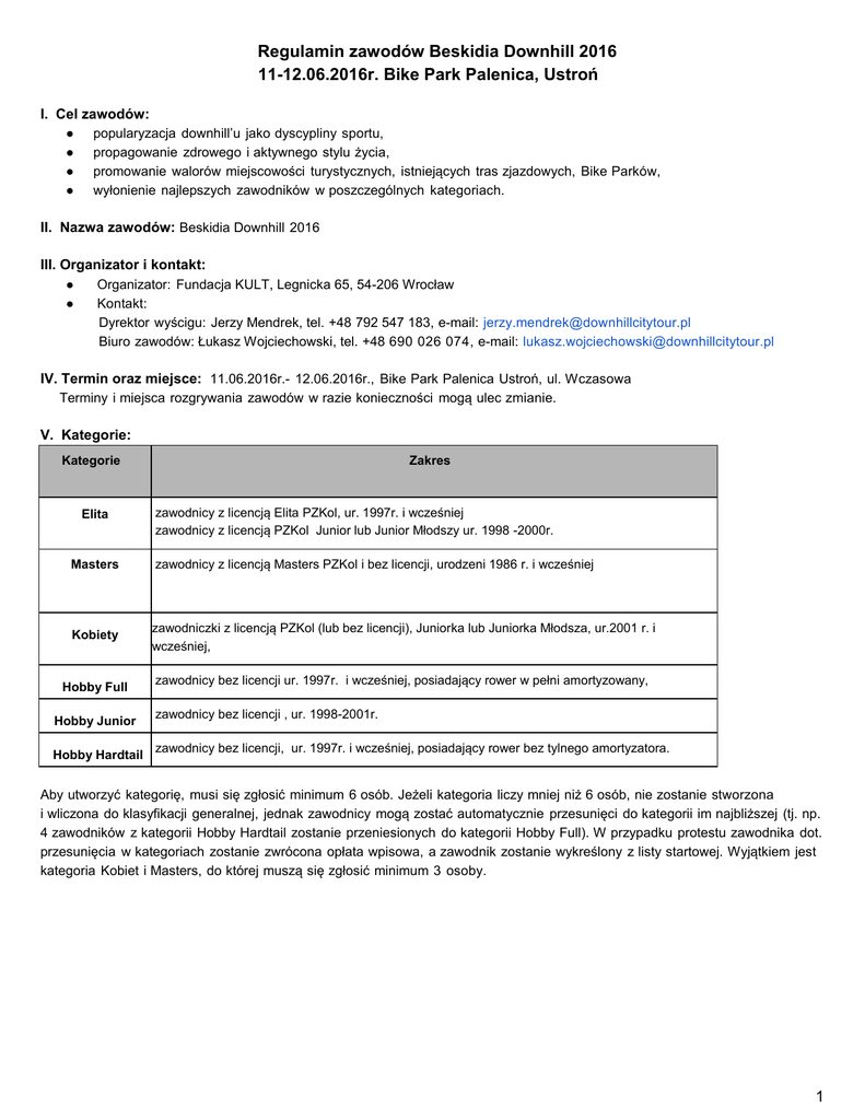 Regulamin zawodów Beskidia Downhill 2016 1112.06.2016r. Bike Park Palenica, Ustroń I. Cel zawodów: ● popularyzacja downhill’u jako dyscypliny sportu, ● propagowanie zdrowego i aktywnego stylu życia, ● promowanie walorów miejscowości turystycznych, istniejących tras zjazdowych, Bike Parków, ● wyłonienie najlepszych zawodników w poszczególnych kategoriach. II. Nazwa zawodów: Beskidia Downhill 2016 III. Organizator i kontakt: ● Organizator: Fundacja KULT, Legnicka 65, 54-206 Wrocław ● Kontakt: Dyrektor wyścigu: Jerzy Mendrek, tel. +48 792 547 183, email: [email protected] Biuro zawodów: Łukasz Wojciechowski, tel. +48 690 026 074, email: [email protected] IV. Termin oraz miejsce: 11.06.2016r. 12.06.2016r., Bike Park Palenica Ustroń, ul. Wczasowa Terminy i miejsca rozgrywania zawodów w razie konieczności mogą ulec zmianie. V. Kategorie: Kategorie Elita Zakres zawodnicy z licencją Elita PZKol, ur. 1997r. i wcześniej zawodnicy z licencją PZKol Junior lub Junior Młodszy ur. 1998 2000r. Masters zawodnicy z licencją Masters PZKol i bez licencji, urodzeni 1986 r. i wcześniej Kobiety zawodniczki z licencją PZKol (lub bez licencji), Juniorka lub Juniorka Młodsza, ur.2001 r. i wcześniej, Hobby Full Hobby Junior Hobby Hardtail zawodnicy bez licencji ur. 1997r. i wcześniej, posiadający rower w pełni amortyzowany, zawodnicy bez licencji , ur. 19982001r. zawodnicy bez licencji, ur. 1997r. i wcześniej, posiadający rower bez tylnego amortyzatora. Aby utworzyć kategorię, musi się zgłosić minimum 6 osób. Jeżeli kategoria liczy mniej niż 6 osób, nie zostanie stworzona i wliczona do klasyfikacji generalnej, jednak zawodnicy mogą zostać automatycznie przesunięci do kategorii im najbliższej (tj. np. 4 zawodników z kategorii Hobby Hardtail zostanie przeniesionych do kategorii Hobby Full). W przypadku protestu zawodnika dot. przesunięcia w kategoriach zostanie zwrócona opłata wpisowa, a zawodnik zostanie wykreślony z listy startowej. Wyjątkiem jest kategoria Kobiet i Masters, do której muszą się zgłosić minimum 3 osoby. 1 VI. Warunki uczestnictwa: Beskidia Downhill 2016 to zawody ogólnodostępne zarówno dla zawodników z licencją PZKol jak i dla amatorów. Uczestnikiem będzie każda osoba, która ukończyła 15 rok życia oraz spełni następujące warunki: ● dokona rejestracji online poprzez formularz zgłoszeniowy na stronie http://www.racetiming.pl/ w terminie od 15.04.2016r. do 9.06.2016r. do godz. 24:00 i dokona opłaty wpisowej w gotówce, w Biurze Zawodów w dniu 11.06.2016r. w godz. 9:00 15:00. Wysokość opłaty wpisowej w gotówce wynosi: 70 zł. lub dokona rejestracji online poprzez formularz zgłoszeniowy na stronie http://www.racetiming.pl/, w terminie od 15.04.2016r. do 9.06.2016r. do godz. 24:00 i dokona przedpłaty na następujące konto: 98 1090 2327 0000 0001 3012 4325 Fundacja KULT Legnicka 65 54-206 Wrocław W tytule należy podać imię i nazwisko zawodnika oraz kategorię. Wysokość opłaty wpisowej w formie przedpłaty wynosi: 50 zł. ● posiada sprawny technicznie rower z dwoma działającymi hamulcami, kask pełny integralny, ochraniacze zabezpieczające (nakolanniki, ochraniacze na łokcie, ochraniacz kręgosłupa – żółw) oraz rękawiczki z pełnymi palcami. Wypełniając listę zgłoszeniową do zawodów uczestnik akceptuje poniższą klauzulę: “Organizator zawodów Beskidia Downhill 2016 oraz wszystkie osoby z nim współpracujące nie ponoszą odpowiedzialności względem uczestników zawodów Beskidia Downhill 2016 za szkody osobowe, rzeczowe i majątkowe, które wystąpią przed, w trakcie lub po zawodach Beskidia Downhill 2016. Uczestnicy startują na własną odpowiedzialność. Uczestnicy ponoszą odpowiedzialność cywilną i prawną za wszystkie szkody. Poprzez złożenie podpisu na liście zgłoszeniowej do zawodów Beskidia Downhill 2016 zawodnicy zrzekają się prawa dochodzenia prawnego lub zwrotnego od organizatora Beskidia Downhill 2016 lub od jego zleceniobiorców w razie wypadku lub szkody związanej z zawodami Beskidia Downhill 2016. Poprzez złożenie podpisu na liście zgłoszeniowej do zawodów Beskidia Downhill 2016 przyjmuję do wiadomości, że w razie wypadku z moim udziałem (lub z udziałem mojego dziecka lub podopiecznego) nie mogę wnosić żadnych roszczeń w stosunku do organizatora Beskidia Downhill 2016 oraz osób z nim współpracujących tj. sponsorów i partnerów. Zobowiązuję się do przestrzegania zarządzeń służb porządkowych, sędziów oraz warunków regulaminu Beskidia Downhill 2016. Zgadzam się z warunkami uczestnictwa i zgłaszam swoje uczestnictwo (lub uczestnictwo mojego dziecka lub podopiecznego) w w/w zawodach. Mój stan zdrowia (lub stan zdrowia mojego dziecka lub podopiecznego) pozwala na uczestnictwo w zawodach sportowych, bez ryzyka utraty zdrowia bądź życia. Zapoznałem się z regulaminem, formułą i trasą zawodów Beskidia Downhill 2016. Jestem świadomy zagrożeń wynikających z uczestnictwa w zawodach Beskidia Downhill 2016. Posiadam ważne ubezpieczenie w zakresie następstw nieszczęśliwych wypadków, kosztów leczenia oraz kontuzji sportowych. W czasie zawodów nie będę pod wpływem alkoholu, środków psychoaktywnych bądź innych substancji wywierających niekorzystny wpływ na zdolność oceny sytuacji i ryzyka wynikającego z uczestnictwa w zawodach. Niniejszym podpisem wyrażam zgodę na bezpłatne i nieograniczone w czasie oraz terytorialnie, wykorzystywanie mojego wizerunku (lub wizerunku mojego dziecka lub podopiecznego) przez organizatora zawodów Beskidia Downhill 2016 oraz przez wszystkie osoby z nim współpracujące, w tym przede wszystkim sponsorów, fotografów, partnerów i z tego tytułu nie będę w przyszłości rościł żadnych praw majątkowych. Zdjęcia, nagrania filmowe oraz wywiady z wykorzystaniem mojego wizerunku (lub wizerunku mojego dziecka lub podopiecznego), a także wyniki zawodów Beskidia Downhil