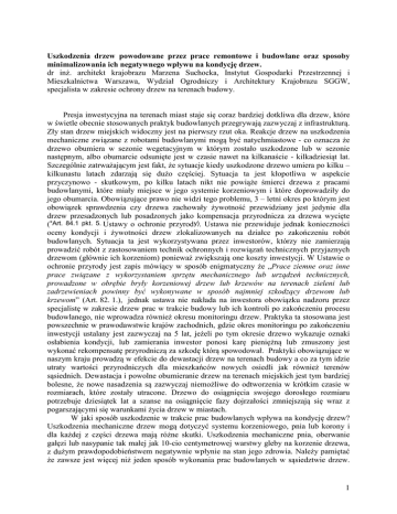 Uszkodzenia drzew powodowane przez prace remontowe i budowlane oraz sposoby minimalizowania ich negatywnego wpływu na kondycję drzew. dr inż. architekt krajobrazu Marzena Suchocka, Instytut Gospodarki Przestrzennej i Mieszkalnictwa Warszawa, Wydział Ogrodniczy i Architektury Krajobrazu SGGW, specjalista w zakresie ochrony drzew na terenach budowy. Presja inwestycyjna na terenach miast staje się coraz bardziej dotkliwa dla drzew, które w świetle obecnie stosowanych praktyk budowlanych przegrywają zazwyczaj z infrastrukturą. Zły stan drzew miejskich widoczny jest na pierwszy rzut oka. Reakcje drzew na uszkodzenia mechaniczne związane z robotami budowlanymi mogą być natychmiastowe - co oznacza że drzewo obumiera w sezonie wegetacyjnym w którym zostało uszkodzone lub w sezonie następnym, albo obumarcie odsunięte jest w czasie nawet na kilkanaście - kilkadziesiąt lat. Szczególnie zatrważającym jest fakt, że sytuacje kiedy uszkodzone drzewo umiera po kilku – kilkunastu latach zdarzają się dużo częściej. Sytuacja ta jest kłopotliwa w aspekcie przyczynowo - skutkowym, po kilku latach nikt nie powiąże śmierci drzewa z pracami budowlanymi, które miały miejsce w jego systemie korzeniowym i które doprowadziły do jego obumarcia. Obowiązujące prawo nie widzi tego problemu, 3 – letni okres po którym jest obowiązek sprawdzenia czy drzewa zachowały żywotność przewidziany jest jedynie dla drzew przesadzonych lub posadzonych jako kompensacja przyrodnicza za drzewa wycięte (*Art. 84.1 pkt. 5. Ustawy o ochronie przyrody). Ustawa nie przewiduje jednak konieczności oceny kondycji i żywotności drzew zlokalizowanych na działce po zakończeniu robót budowlanych. Sytuacja ta jest wykorzystywana przez inwestorów, którzy nie zamierzają prowadzić robót z zastosowaniem technik ochronnych i rozwiązań technicznych przyjaznych drzewom (głównie ich korzeniom) ponieważ zwiększają one koszty inwestycji. W Ustawie o ochronie przyrody jest zapis mówiący w sposób enigmatyczny że „Prace ziemne oraz inne prace związane z wykorzystaniem sprzętu mechanicznego lub urządzeń technicznych, prowadzone w obrębie bryły korzeniowej drzew lub krzewów na terenach zieleni lub zadrzewieniach powinny być wykonywane w sposób najmniej szkodzący drzewom lub krzewom” (Art. 82. 1.), jednak ustawa nie nakłada na inwestora obowiązku nadzoru przez specjalistę w zakresie drzew prac w trakcie budowy lub ich kontroli po zakończeniu procesu budowlanego, nie wprowadza również okresu monitoringu drzew. Praktyka ta stosowana jest powszechnie w prawodawstwie krajów zachodnich, gdzie okres monitoringu po zakończeniu inwestycji ustalany jest zazwyczaj na 5 lat, jeżeli po tym okresie drzewo wykazuje oznaki osłabienia kondycji, lub zamierania inwestor ponosi karę pieniężną lub zmuszony jest wykonać rekompensatę przyrodniczą za szkodę którą spowodował. Praktyki obowiązujące w naszym kraju prowadzą w efekcie do dewastacji drzew na terenach budowy a co za tym idzie utraty wartości przyrodniczych dla mieszkańców nowych osiedli jak również terenów sąsiednich. Dewastacja i powolne obumieranie drzew na terenach miejskich jest tym bardziej bolesne, że nowe nasadzenia są zazwyczaj niemożliwe do odtworzenia w krótkim czasie w rozmiarach, które zostały utracone. Drzewo do osiągnięcia swojego dorosłego rozmiaru potrzebuje dziesiątek lat a szanse na osiągnięcie fazy dojrzałości zmniejszają się wraz z pogarszającymi się warunkami życia drzew w miastach. W jaki sposób uszkodzenie w trakcie prac budowlanych wpływa na kondycję drzew? Uszkodzenia mechaniczne drzew mogą dotyczyć systemu korzeniowego, pnia lub korony i dla każdej z części drzewa mają różne skutki. Uszkodzenia mechaniczne pnia, oberwanie gałęzi lub nasypanie tak małej jak 10-cio centymetrowej warstwy gleby na korzenie drzewa, z dużym prawdopodobieństwem negatywnie wpłynie na stan jego zdrowia. Należy pamiętać że zawsze jest więcej niż jeden sposób wykonania prac budowlanych w sąsiedztwie drzew. 1 Znajomość specyfiki drzew umożliwia wybór mniej szkodliwego rozwiązania, często również tańszego. Uszkodzenie korzeni Najczęściej uszkadzaną częścią drzewa, zazwyczaj w sposób nieświadomy, są korzenie. Uszkodzenia nie są widoczne i trudno jest je kontrolować a wiele z nich powstaje w sposób nieświadomy. Badania mówią, że każde uszkodzenie korzeni jest groźne dla kondycji drzewa a usunięcie lub uszkodzenie powyżej 45% systemu korzeniowego spowoduje nie tylko zachwianie statyki ale również śmierć drzewa natychmiastową lub odsunięta w czasie nawet na lata. Żeby właściwie określić zasięg systemu korzeniowego w praktyce należy pamiętać, że ok. 80% korzeni zlokalizowane jest w wierzchniej warstwie gleby do głębokości 60 cm i mogą rozciągać się na odległość dwa lub trzy razy większą niż średnica korony. Jeżeli powierzchnia terenu nie jest przykryta nawierzchnią nieprzepuszczalną duża ilość korzeni koncentruje się jednak na linii rzutu korony, aby tam pobierać wodę skapującą z liści, strefa ta powinna być szczególnie chroniona. Poza wodą z solami mineralnymi do rozwoju korzenie potrzebują również powietrza, dlatego ubicie gleby jest jednym z głównych morderców korzeni a w konsekwencji drzew. W warunkach miejskich nieprawdziwym również jest założenie, że drzewa wykształcają system korzeniowy zawsze symetrycznie – w mieście korzenie rosną tam gdzie znajdują warunki do życia a więc glebę do rozwoju zasobną w tlen, wodę i jest to zazwyczaj kształt nieregularny. Fot 1. Odsłonięcie korzeni i pozostawienie ich niezabezpieczonych podczas zmiany nawierzchni powoduje przesuszenie i obumarcie znacznie większej części systemu korzeniowego niż wynikałoby to z mechanicznych uszkodze . Jak fakty o których wspomniano powyżej można wykorzystać w ochronie drzew w trakcie robót budowlan