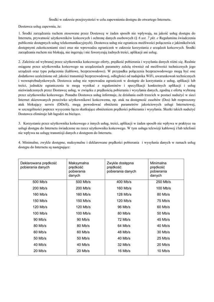 Środki w zakresie przejrzystości w celu zapewnienia dostępu do otwartego Internetu. Dostawca usług zapewnia, że: 1. Środki zarządzania ruchem stosowane przez Dostawcę w żaden sposób nie wpływają, na jakość usług dostępu do Internetu, prywatność użytkowników końcowych i ochronę danych osobowych (§ 6 ust. 7 pkt. e Regulaminu świadczenia publicznie dostępnych usług telekomunikacyjnych). Dostawca usług nie ogranicza możliwości połączenia z jakimikolwiek dostępnymi zakończeniami sieci oraz nie wprowadza ograniczeń w zakresie korzystania z urządzeń końcowych. Środki zarządzania ruchem nie blokują, nie ingerują i nie faworyzują żadnych treści, aplikacji ani usług. 2. Zależnie od wybranej przez użytkownika końcowego oferty, prędkość pobierania i wysyłania danych różni się. Realnie osiągane przez użytkownika końcowego na urządzeniach parametry zależą również od możliwości technicznych jego urządzeń oraz typu połączenia (kablowe, bezprzewodowe). W przypadku połączenia bezprzewodowego mogą być one dodatkowo uzależnione od: jakości transmisji bezprzewodowej, odległości od nadajnika WiFi, uwarunkowań technicznych i wewnątrzbudynkowych. Dostawca usług nie wprowadza ograniczeń w dostępie do korzystania z usług, aplikacji lub treści, jednakże ograniczenia te mogą wynikać z regulaminów i specyfikacji konkretnych aplikacji i usług nieświadczonych przez Dostawcę usług, w związku z prędkością pobierania i wysyłania danych, zgodną z ofertą wybraną przez użytkownika końcowego. Ponadto Dostawca usług informuje, że działania osób trzecich w postaci nadużyć w sieci Internet skierowanych przeciwko użytkownikowi końcowemu, np. atak na dostępność zasobów (Dos) lub rozproszony atak blokujący serwis (DDoS), mogą powodować obniżenie parametrów jakościowych usługi Internetowej, w szczególności poprzez wysycenie łącza skutkujące obniżeniem prędkości pobierania i wysyłania. Skutki takich nadużyć Dostawca eliminuje lub łagodzi na bieżąco. 3. Korzystanie przez użytkownika końcowego z innych usług, treści, aplikacji w żaden sposób nie wpływa w praktyce na usługi dostępu do Internetu świadczone na rzecz użytkownika końcowego. W tym usługa telewizji kablowej i/lub telefonii nie wpływa na usługę transmisji danych z dostępem do Internetu. 4. Minimalne, zwykle dostępne, maksymalne i deklarowane prędkości pobierania i wysyłania danych w ramach usług dostępu do Internetu są następujące: Deklarowana prędkość pobierania danych Maksymalna prędkość pobierania danych Zwykle dostępna prędkość pobierania danych Minimalna prędkość pobierania danych 500 Mb/s 500 Mb/s 400 Mb/s 250 Mb/s 200 Mb/s 200 Mb/s 160 Mb/s 100 Mb/s 160 Mb/s 160 Mb/s 128 Mb/s 80 Mb/s 150 Mb/s 150 Mb/s 120 Mb/s 75 Mb/s 120 Mb/s 120 Mb/s 96 Mb/s 60 Mb/s 100 Mb/s 100 Mb/s 80 Mb/s 50 Mb/s 90 Mb/s 90 Mb/s 72 Mb/s 45 Mb/s 80 Mb/s 80 Mb/s 64 Mb/s 40 Mb/s 60 Mb/s 60 Mb/s 48 Mb/s 30 Mb/s 50 Mb/s 50 Mb/s 40 Mb/s 25 Mb/s 40 Mb/s 40 Mb/s 32 Mb/s 20 Mb/s 20 Mb/s 20 Mb/s 16 Mb/s 10 Mb/s Deklarowana prędkość wysyłania danych Maksymalna prędkość wysyłania danych Zwykle dostępna prędkość wysyłania danych Minimalna prędkość wysyłania danych 100 Mb/s 100 Mb/s 80 Mb/s 50 Mb/s 50 Mb/s 50 Mb/s 40 Mb/s 25 Mb/s 20 Mb/s 20 Mb/s 16 Mb/s 10 Mb/s 10 Mb/s 10 Mb/s 8 Mb/s 5 Mb/s 6 Mb/s 6 Mb/s 4,8 Mb/s 3 Mb/s 5 Mb/s 5 Mb/s 4 Mb/s 2,5 Mb/s 3 Mb/s 3 Mb/s 2,4 Mb/s 1,5 Mb/s 2 Mb/s 2 Mb/s 1,6 Mb/s 1 Mb/s 1 Mb/s 1 Mb/s 0,8 Mb/s 0,5 Mb/s Prędkości pobierania i wysyłania danych, mierzone są za pomocą testów dostępnych na stronie internetowej pod adresem http://tvsm.speedtest.net, za pomocą urządzenia serwisowego Dostawcy usług podłączonego do Zakończenia Sieci w Lokalu użytkownika końcowego. Jakość parametrów Usługi jest gwarantowana na odcinku od routera brzegowego Dostawcy usług do Zakończenia Sieci. W razie niezachowania parametrów, o których mowa powyżej, dostęp do informacji i treści oraz możliwość ich rozpowszechniania, a także możliwość korzystania z niektórych aplikacji i usług mogą być ograniczone. Znaczne odstępstwa od odpowiednich deklarowanych prędkości pobierania i wysyłania danych mogą wpływać na korzystanie przez użytkowników końcowych z praw do uzyskania dostępu do informacji i treści oraz do ich rozpowszechniania, a także do korzystania z wybranych aplikacji i usług oraz ich udostępniania, jak również do korzystania z wybranych urządzeń końcowych, niezależnie od lokalizacji użytkownika końcowego lub Dostawcy usług czy też od lokalizacji, miejsca pochodzenia lub miejsca docelowego informacji, treści lub usługi w następujący sposób: powodować brak dostępu lub utrudniony dostęp. 5. Konsument jest uprawniony do korzystania ze środków ochrony prawnej w przypadku jakichkolwiek stałych lub regularnie powtarzających się rozbieżności pomiędzy faktycznym wykonaniem usługi dostępu do Internetu pod względem prędkości lub innych parametrów jakości usługi a wykonaniem opisanym zgodnie z pkt 1 - 4. Wśród środków ochrony prawnej znajdują się następujące środki: obniżenie abonamentu, odszkodowanie - kara umowna, uprawnienie do złożenia reklamacji do Dostawcy usług, uprawnienie do skorzystania z postępowania przed Prezesem UKE oraz przed stałym polubownym sądem konsumenckim działającym przy Prezesie UKE, a także uprawnienie do złożenia pozwu, wniosku o zawezwanie do ugodowego załatwienia sprawy oraz do wszczęcia postępowania mediacyjnego przed sądem powszechnym.