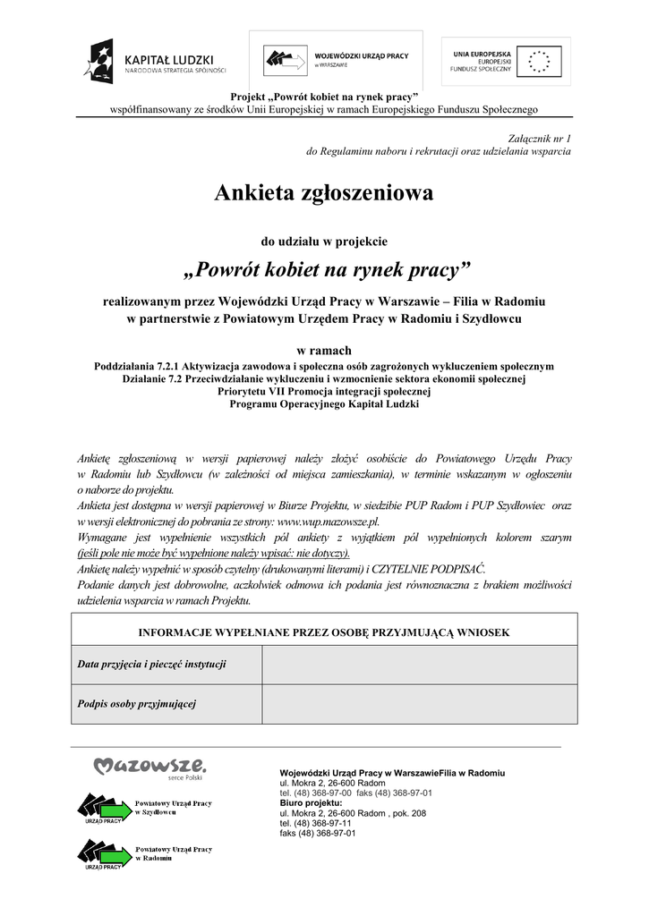 Projekt ,,Powrót kobiet na rynek pracy” współfinansowany ze środków Unii Europejskiej w ramach Europejskiego Funduszu Społecznego Załącznik nr 1 do Regulaminu naboru i rekrutacji oraz udzielania wsparcia Ankieta zgłoszeniowa do udziału w projekcie „Powrót kobiet na rynek pracy” realizowanym przez Wojewódzki Urząd Pracy w Warszawie – Filia w Radomiu w partnerstwie z Powiatowym Urzędem Pracy w Radomiu i Szydłowcu w ramach Poddziałania 7.2.1 Aktywizacja zawodowa i społeczna osób zagrożonych wykluczeniem społecznym Działanie 7.2 Przeciwdziałanie wykluczeniu i wzmocnienie sektora ekonomii społecznej Priorytetu VII Promocja integracji społecznej Programu Operacyjnego Kapitał Ludzki Ankietę zgłoszeniową w wersji papierowej należy złożyć osobiście do Powiatowego Urzędu Pracy w Radomiu lub Szydłowcu (w zależności od miejsca zamieszkania), w terminie wskazanym w ogłoszeniu o naborze do projektu. Ankieta jest dostępna w wersji papierowej w Biurze Projektu, w siedzibie PUP Radom i PUP Szydłowiec oraz w wersji elektronicznej do pobrania ze strony: www.wup.mazowsze.pl. Wymagane jest wypełnienie wszystkich pól ankiety z wyjątkiem pól wypełnionych kolorem szarym (jeśli pole nie może być wypełnione należy wpisać: nie dotyczy). Ankietę należy wypełnić w sposób czytelny (drukowanymi literami) i CZYTELNIE PODPISAĆ. Podanie danych jest dobrowolne, aczkolwiek odmowa ich podania jest równoznaczna z brakiem możliwości udzielenia wsparcia w ramach Projektu. INFORMACJE WYPEŁNIANE PRZEZ OSOBĘ PRZYJMUJĄCĄ WNIOSEK Data przyjęcia i pieczęć instytucji Podpis osoby przyjmującej Wojewódzki Urząd Pracy w WarszawieFilia w Radomiu ul. Mokra 2, 26-600 Radom tel. (48) 368-97-00 faks (48) 368-97-01 Biuro projektu: ul. Mokra 2, 26-600 Radom , pok. 208 tel. (48) 368-97-11 faks (48) 368-97-01 Projekt „Powrót kobiet na rynek pracy” współfinansowany ze środków Unii Europejskiej w ramach Europejskiego Funduszu Społecznego 1. DANE PERSONALNE 1.1 Imię (imiona) 1.2 Nazwisko 1.3 Data i miejsce urodzenia 1.4 Wiek w chwili przystąpienia do projektu 1.5 Nr i seria dowodu osobistego lub innego dokumentu 1.6 Pesel _ 1.7 NIP _ _ 1.8 Adres zamieszkania Miejscowość Ulica Nr domu Nr lokalu Kod pocztowy, poczta obszar miejski (gminy miejskie i miasta powyżej 25 tys. mieszkańców) Gmina/ miasto obszar wiejski (gminy wiejskie, miasta do 25 tys. mieszkańców) Powiat Województwo 1.9 Adres zameldowania (proszę wypełnić, jeżeli jest inny niż zamieszkania) Miejscowość Ulica Nr domu Nr lokalu Kod pocztowy, poczta Gmina/ miasto obszar miejski (gminy miejskie i miasta powyżej 25 tys. mieszkańców) obszar wiejski (gminy wiejskie, miasta do 25 tys. mieszkańców) Powiat Województwo 1.10 Numer telefonu stacjonarnego 2 Projekt „Powrót kobiet na rynek pracy” współfinansowany ze środków Unii Europejskiej w ramach Europejskiego Funduszu Społecznego 1.11 Numer telefonu komórkowego 1.12 Adres poczty elektronicznej ( e-mail) 2. INFORMACJE DODATKOWE 2.1 Poziom wykształcenia (proszę zaznaczyć X we właściwym miejscu) wyższe policealne średnie ogólnokształcące średnie zawodowe zasadnicze zawodowe ponadgimnazjalne gimnazjalne podstawowe niepełne podstawowe Zawód wyuczony/specjalizacja: Zawód ostatnio wykonywany: 1. ………………………………………………………………………………….. 2. …………………………………………………………………………………. 3. …………………………………………………………………………………. 2.2 Dodatkowe kwalifikacje / certyfikaty / ukończone szkolenia 4. ………………………………………………………………………………… 5. ……………………………………………………………………………….. 6. ………………………………………………………………………………… tak Stopień……………………………….. Rodzaj niepełnosprawności………… 2.3 Posiadanie orzeczenia o stopniu niepełnosprawności …………………………………………. Wydane od dnia…………………..do nie dnia………………………………….. 3 Projekt „Powrót kobiet na rynek pracy” współfinansowany ze środków Unii Europejskiej w ramach Europejskiego Funduszu Społecznego 3. DOŚWIADCZENIE ZAWODOWE Stanowisko – zawód Lata pracy 1. ………………………………………………………………………………… 2. ………………………………………………………………………………… 3. ………………………………………………………………………………… 4. ………………………………………………………………………………… 3.1 Przebieg pracy zawodowej (w odwrotnym porządku chronologicznym od ostatniej pracy do wcześniejszych) 5. ………………………………………………………………………………… 6. ………………………………………………………………………………… 7. ………………………………………………………………………………… 8. ………………………………………………………………………………… 9. ………………………………………………………………………………… 10. ………………………………………………………………………………… 3.2 Staż pracy w latach (ogółem) 4. STATUS KOBIETY NA RYNKU PRACY (spełnienie kryterium grupy docelowej projektu) osoba bezrobotna zarejestrowana w PUP od: 4.1 Status kobiety na rynku pracy w chwili ubiegania się o udział w projekcie) (proszę zaznaczyć X we właściwym miejscu) do 1 roku od 1-5 lat od 5-8 lat od 8-10 lat powyżej10 lat powracająca na rynek pracy po urlopie macierzyńskim i/lub wychowawczym zamieszkująca na terenie Miasta Radomia zamie