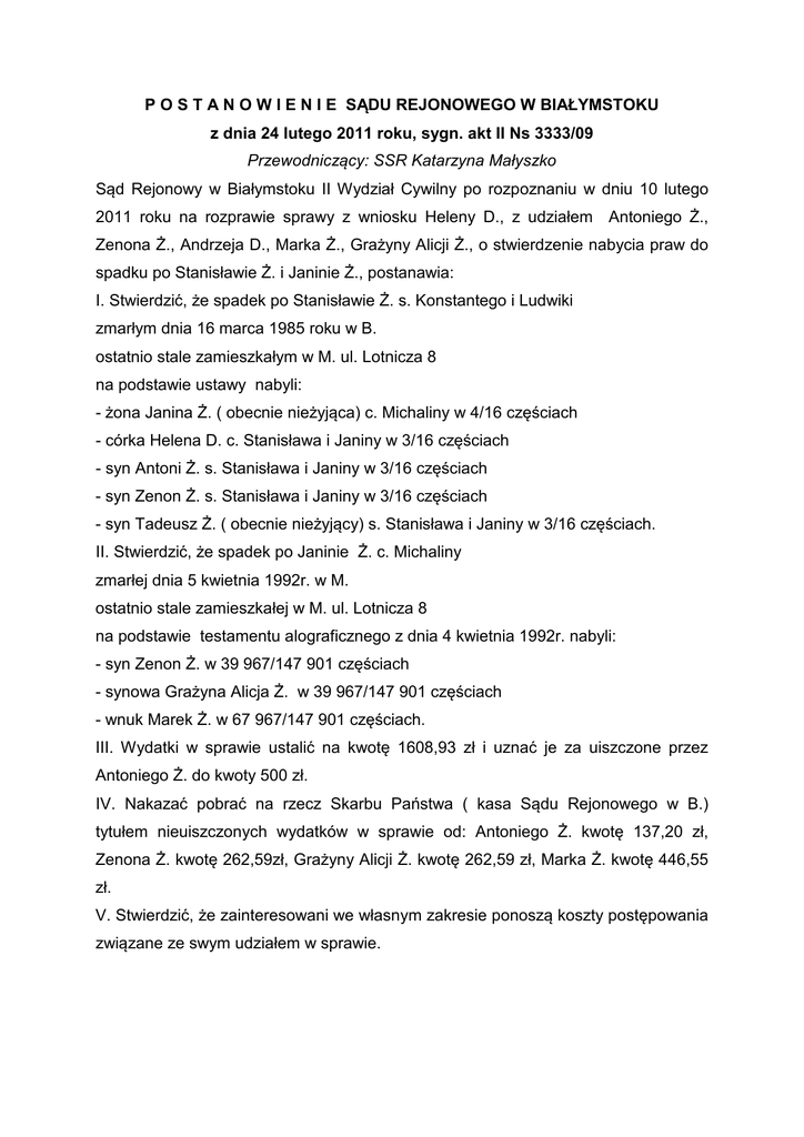 P O S T A N O W I E N I E SĄDU REJONOWEGO W BIAŁYMSTOKU z dnia 24 lutego 2011 roku, sygn. akt II Ns 3333/09 Przewodniczący: SSR Katarzyna Małyszko Sąd Rejonowy w Białymstoku II Wydział Cywilny po rozpoznaniu w dniu 10 lutego 2011 roku na rozprawie sprawy z wniosku Heleny D., z udziałem Antoniego Ż., Zenona Ż., Andrzeja D., Marka Ż., Grażyny Alicji Ż., o stwierdzenie nabycia praw do spadku po Stanisławie Ż. i Janinie Ż., postanawia: I. Stwierdzić, że spadek po Stanisławie Ż. s. Konstantego i Ludwiki zmarłym dnia 16 marca 1985 roku w B. ostatnio stale zamieszkałym w M. ul. Lotnicza 8 na podstawie ustawy nabyli: - żona Janina Ż. ( obecnie nieżyjąca) c. Michaliny w 4/16 częściach - córka Helena D. c. Stanisława i Janiny w 3/16 częściach - syn Antoni Ż. s. Stanisława i Janiny w 3/16 częściach - syn Zenon Ż. s. Stanisława i Janiny w 3/16 częściach - syn Tadeusz Ż. ( obecnie nieżyjący) s. Stanisława i Janiny w 3/16 częściach. II. Stwierdzić, że spadek po Janinie Ż. c. Michaliny zmarłej dnia 5 kwietnia 1992r. w M. ostatnio stale zamieszkałej w M. ul. Lotnicza 8 na podstawie testamentu alograficznego z dnia 4 kwietnia 1992r. nabyli: - syn Zenon Ż. w 39 967/147 901 częściach - synowa Grażyna Alicja Ż. w 39 967/147 901 częściach - wnuk Marek Ż. w 67 967/147 901 częściach. III. Wydatki w sprawie ustalić na kwotę 1608,93 zł i uznać je za uiszczone przez Antoniego Ż. do kwoty 500 zł. IV. Nakazać pobrać na rzecz Skarbu Państwa ( kasa Sądu Rejonowego w B.) tytułem nieuiszczonych wydatków w sprawie od: Antoniego Ż. kwotę 137,20 zł, Zenona Ż. kwotę 262,59zł, Grażyny Alicji Ż. kwotę 262,59 zł, Marka Ż. kwotę 446,55 zł. V. Stwierdzić, że zainteresowani we własnym zakresie ponoszą koszty postępowania związane ze swym udziałem w sprawie. UZASADNIENIE Wnioskodawczyni Helena D. po ostatecznym sprecyzowaniu stanowiska wniosła o stwierdzenie nabycia spadku po zmarłym w dniu 16 marca 1985 roku Stanisławie Ż. na podstawie ustawy, zaś po zmarłej w dniu 5 kwietnia 1992 roku Janinie Ż. na podstawie testamentu alograficznego sporządzonego w dniu 4 kwietnia 1992 roku. Kwestionowała istnienie testamentu sporządzonego przez ojca Stanisława Ż. oraz przesłankę istnienia obawy rychłej śmierci testatora w sugerowanej dacie sporządzenia testamentu. Wniosła o nieobciążanie jej kosztami postępowania. Uczestnicy postępowania Antoni Ż. i Andrzej D. ostatecznie przychylili się do stanowiska wnioskodawczyni. Uczestnik postępowania Zenon Ż. wniósł o stwierdzenie nabycia spadku po ojcu Stanisławie Ż. na mocy utraconego testamentu szczególnego sporządzonego w obecności trzech świadków i podpisanego przez testatora w dniu 1 marca 1985 roku - w całości na swoją rzecz oraz o stwierdzenie spadku po Janinie Ż. na podstawie testamentu alograficznego z dnia 4 kwietnia 1992 roku na rzecz: Zenona Ż., Grażyny Alicji Ż. i Marka Ż. stosownie do udziałów w masie spadkowej. Uczestnicy Marek Ż. i Grażyna Alicja Ż. poparli w całości stanowisko Zenona Ż. Sąd Rejonowy ustalił, co następuje: Spadkodawca Stanisław Ż. zmarł 16 marca 1985 roku w B. Stale zamieszkiwał w M. przy ul. Lotniczej 8. W dacie zgonu był żonaty z Janiną Ż. i miał czworo dzieci: Antoniego Ż., Tadeusza Ż. (zmarły dnia 13 grudnia 1999 roku), Zenona Ż. i Helenę D. Spadkodawczyni Janina Ż. zmarła 5 kwietnia 1992 roku w M. Stale zamieszkiwała w M. przy ul. Lotniczej 8. W dacie zgonu była wdową. Pozostawiła po sobie czworo dzieci: Antoniego Ż., Tadeusza Ż. (zmarły dnia 13 grudnia 1999 roku), Zenona Ż. i Helenę D. Tadeusz Ż. zmarł dnia 13 grudnia 1999 roku w G. Sąd Rejonowy w G. postanowieniem z dnia 29 lutego 2000 roku stwierdził, że spadek po Tadeuszu Ż. na podstawie testamentu własnoręcznego w całości nabył Andrzej D. (siostrzeniec). W dniu 1 marca 1985 roku Stanisław Ż. w obecności trzech świadków: Eugeniusza P., Ryszarda W. i Bogusława W. oraz przy obecności Janiny Ż., Grażyny Alicji Ż. i Zenona Ż. wyraził ostatnią wolę, która została spisana przez Bogusława W., podpisana przez testatora i obecnych świadków. Testament był w posiadaniu Zenona Ż. i uległ zniszczeniu w dniu 25 października 2000 roku podczas pożaru, który miał miejsce w zajmowanym przez niego domu przy ul. Lotniczej 8 w M. Spadkodawczyni Janina Ż. pozostawiła testament alograficzny sporządzony w obecności zastępcy Burmistrza Miasta i Gminy w M. i obecnych świadków. Testament został sporządzony i podpisany przez spadkodawczynię Janinę Ż. i obecnych świadków oraz przez zastępcę burmistrza i opatrzony datą 4 kwietnia 1992 roku. Sąd Rejonowy w B. postanowieniem z dnia 26 marca 2010 roku w sprawie II Ns 723/10 sprostował akt urodzenia, akt małżeństwa i akt zgonu Stanisława Ż., w ten sposób, że w miejscach błędnie wpisanego nazwiska wpisał nazwisko w sposób prawidłowy, w miejsce nieprecyzyjnie określanej daty i źle wpisanego miejsca urodzenia „1906 roku” , „Łopiuchy”, wpisał datę „1 maja 1906 roku”, „Goniądz”. Przed śmiercią Stanisław i Janina małżonkowie Ż. umową przekazania własności gospodarstwa rolnego z dnia 20 lipca 1978 roku przekazali Zenonowi i Grażynie Alicji małżonkom Ż. gospodarstwo rolne ogólnej powierzchni 17,37 ha położone na terenie wsi Ł. Spadkobiercy do śmierci byli użytkownikami wieczystymi działki gruntu o powierzchni 0,0628 oznaczonej numerem 797 położonej w M. zabudowanej budynkiem mieszkalnym i gospodarczym. Sąd Rejonowy zważył, co następuje : Postępowanie o stwierdzenie nabycia spadku ma na celu ustalenie, czy osoba wskazana we wniosku jako spadkodawca zmarła oraz kto i na jakiej podstawie (ustawy czy też testamentu) jest jej spadkobiercą. Przy tym jeżeli spadkodawca nie pozostawił testamentu, to wówczas przepisy kodeksu cywilnego stanowią w swej treści kto, i z jakim udziałem dziedziczy spadek po osobie zmarłej.