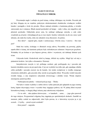 MARCIN RUSNAK ŚWIATŁO I MROK Przystanęła nagle i cofnęła się pod ścianę, widząc zbliżające się światło. Poczuła jak jej buty ślizgają się na wąskim, pokrytym ekskrementami chodniczku wiodącym wzdłuż kanału i postąpiła o krok do przodu. Obcas stuknął cichutko o kamienną płytkę, a światło zatrzymało się w miejscu. Blask musiał pochodzić od lampy – stały i silny, nie migotliwy jak płomień pochodni. Oddychała przez usta, by uniknąć mdlącego smrodu, a całe ciało swędziało ją od potu i obsiadających ją co rusz much. Insekty wdzierały się do ust, nosa i pod ubranie, ale stała bez ruchu, żeby nie zdradzić swej obecności. Za późno. – Kto idzie? – zapytał głos, męski i szeleszczący. Chwila ciszy. I znowu: – Kto tam jest? Stała bez ruchu, ściskając w dłoniach swoją sakwę. Poczułaby się pewniej, gdyby oparła dłoń o ścianę, ale kamienie pokryte były zielonkawym szlamem i brązowym grzybem. Wolałaby iść po kolana w tym bajorze gówna, sików i wymiocin, niż dotknąć dłońmi tych ścian. Usłyszała kroki. Ktokolwiek niósł tę lampę, zbliżał się szybko. Mógł być od niej o piętnaście kroków. Już tylko o dwanaście. Dziesięć. Instynktownie ruszyła w tył, próbując uciekać, gdy poślizgnęła się i poczuła jak kamień chodnika usuwa się jej spod stóp. Z jej ust wydobył się tylko jęk, gdy upadając stłukła sobie pośladki i poczęła zsuwać się do kanału. Już miała wylądować w środku stojącego strumienia odchodów, gdy poczuła silny uścisk na przegubie dłoni. Wszystko wokół otaczało światło lampy, a ona stopniowo odzyskała równowagę i zdołała wstać. Wtedy dopiero nieznajomy puścił jej dłoń. – Niebezpieczna płytka – wskazał pod jej nogi. – Śliska. Nie była w stanie wydobyć z siebie słowa i tylko patrzyła jak ogłupiała na jego ciemną kurtę, kaptur skrywający twarz i wysokie buty sięgające połowy ud. W jednej dłoni trzymał kierunkową lampę, w drugiej długi żelazny pręt zakończony trójzębem. – Co tu robi… taka piękna dziewczyna… w kanałach… sama… – jego głos pasował do tego miejsca. Przypominał wilgotną linę ciągniętą po spróchniałych deskach. Zamilkł na moment, jakby czekał na odpowiedź, choć była pewna, że z łatwością wyczyta ją w jej oczach. – Czyżby… przed czymś uciekała? – Kim jesteś? – zapytała. – Pytanie na pytanie… nie ładnie – chwycił za sznur przewieszony przez ramię i pokazał jej uwiązane do niego cztery duże szczury. Trzy z nich jeszcze zdradzały oznaki życia. – Jestem szczurołapem. A ona? – Muszę… – zebrała się w sobie, żeby wydukać parę słów – muszę się przedrzeć przez kanały. Wydostać się z miasta. Wiem, że jest wyjście po zachodniej stronie. Zaprowadzisz mnie tam? – Czy zaprowadzę? A czemuż miałbym to zrobić? – Zapłacę – powiedziała i na potwierdzenie potrząsnęła sakwą. Brzęknęło parę monet. – Zapłaci. Na zachód. Ona o niczym nie wie. Biedactwo. – O czym nie wiem? – Ona pójdzie za mną. Inni muszą ją zobaczyć. Poznać. Zobaczyć, co im Vermillio przyprowadził – obrócił się na pięcie i ruszył z powrotem drogą, którą przyszedł. Po paru krokach obejrzał się przez ramię i mimo, że nie widziała jego twarzy, była pewna, że szczurołap się niecierpliwi. – Na co ona czeka? Na kolejne stłuczenie ślicznej pupki? Kamienie zdradliwe bez światła. Pójdzie ze mną. – Zaprowadzisz mnie na zachód? Do wyjścia? – Zaprowadzę. Pójdzie ze mną. Niech trzyma się blisko. Światła nie dużo. Ledwie starczy. Ruszyła za nim, ostrożnie stawiając kroki, choć musiała przyznać, że w świetle latarni podróż chodnikiem okazała się znacznie łatwiejsza niż wcześniej. Masowała sobie lewe biodro, bolące przy każdym kroku. – Odważna – odezwał się jej przewodnik. – Sama w mroku… ze szczurami… – Miałam pochodnię. Ale zgubiłam drogę w tych korytarzach i zgasła. – Czemu nie zawróciła? – zapytał, ale nie odpowiedziała. Nie odezwał się więcej. Szli przez około godzinę, a on ani razu się nie zawahał. Prowadził równym tempem, uprzedzając ją ilekroć mijali niepewne kamienie, progi, uskoki czy inne niespodzianki. Gdyby szła tędy bez światła, z pewnością nie raz wylądowałaby wśród nieczystości, nie wspominając o ryzyku skręcenia czy złamania nogi. Wolała sobie nawet nie wyobrażać otwartej rany w tym ścieku. Prawdopodobnie byłaby jej ostatnią. Nie wspominając o szczurach. Widziała ich czerwone ślepka obserwujące ich uważnie z bezpiecznego mroku, znikające w głębszym cieniu, gdy tylko światło zanadto się zbliżyło. Parę razy dostrzegła zmykające gryzonie, a sama długość ich ogonów potrafiła przyprawić ją o mdłości. Przez myśl jej przemknęło pytanie, jak to możliwe, że ten szczurołap upolował aż cztery, kiedy tak panicznie omijają każde źródło światła. – Pułapki – rzekł, nim zdążyła zadać pytanie. – Rozstawiamy pułapki. – Więc po co ten trójząb? – W kanałach… – zakaszlał cicho, jakby robił to tak często, że weszło mu w nawyk – są gorsze rzeczy… niż szczury. Dopiero teraz zauważyła, że przy każdym rozwidleniu przystawał na sekundę, dwie; patrzył wtedy w obie strony i zerkał za siebie. Wcześniej sądziła, że upewnia się czy ona za nim nadąża. Teraz była pewna, że to ostrożność. Coś czaiło się w tych kanałach i szczurołap wcale by się nie zdziwił, gdyby to coś podążało ich tropem. Gdy natrafiali na odnogi, którymi napływał ściek – szerokie na krok rynny – za każdym razem szli po wąskim chodniczku wzdłuż owych dopływów tak długo, aż natrafiali na drewnianą lub żelazną kładkę. Szczurołap konsekwentnie korzystał z nich i trzymał się z dala od krawędzi. Kiedy zapytała go o to, wzruszył ramionami i wymamrotał coś o 