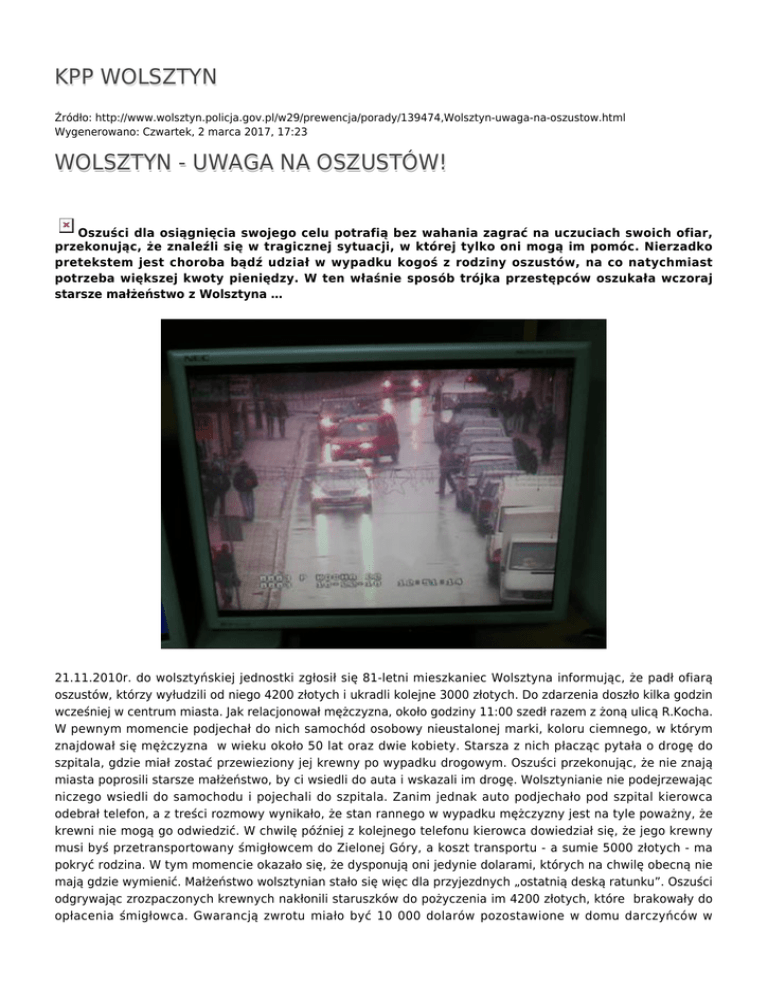 KPP WOLSZTYN Źródło: http://www.wolsztyn.policja.gov.pl/w29/prewencja/porady/139474,Wolsztyn-uwaga-na-oszustow.html Wygenerowano: Czwartek, 2 marca 2017, 17:23 WOLSZTYN - UWAGA NA OSZUSTÓW! Oszuści dla osiągnięcia swojego celu potrafią bez wahania zagrać na uczuciach swoich ofiar, przekonując, że znaleźli się w tragicznej sytuacji, w której tylko oni mogą im pomóc. Nierzadko pretekstem jest choroba bądź udział w wypadku kogoś z rodziny oszustów, na co natychmiast potrzeba większej kwoty pieniędzy. W ten właśnie sposób trójka przestępców oszukała wczoraj starsze małżeństwo z Wolsztyna … 21.11.2010r. do wolsztyńskiej jednostki zgłosił się 81-letni mieszkaniec Wolsztyna informując, że padł ofiarą oszustów, którzy wyłudzili od niego 4200 złotych i ukradli kolejne 3000 złotych. Do zdarzenia doszło kilka godzin wcześniej w centrum miasta. Jak relacjonował mężczyzna, około godziny 11:00 szedł razem z żoną ulicą R.Kocha. W pewnym momencie podjechał do nich samochód osobowy nieustalonej marki, koloru ciemnego, w którym znajdował się mężczyzna w wieku około 50 lat oraz dwie kobiety. Starsza z nich płacząc pytała o drogę do szpitala, gdzie miał zostać przewieziony jej krewny po wypadku drogowym. Oszuści przekonując, że nie znają miasta poprosili starsze małżeństwo, by ci wsiedli do auta i wskazali im drogę. Wolsztynianie nie podejrzewając niczego wsiedli do samochodu i pojechali do szpitala. Zanim jednak auto podjechało pod szpital kierowca odebrał telefon, a z treści rozmowy wynikało, że stan rannego w wypadku mężczyzny jest na tyle poważny, że krewni nie mogą go odwiedzić. W chwilę później z kolejnego telefonu kierowca dowiedział się, że jego krewny musi byś przetransportowany śmigłowcem do Zielonej Góry, a koszt transportu - a sumie 5000 złotych - ma pokryć rodzina. W tym momencie okazało się, że dysponują oni jedynie dolarami, których na chwilę obecną nie mają gdzie wymienić. Małżeństwo wolsztynian stało się więc dla przyjezdnych „ostatnią deską ratunku”. Oszuści odgrywając zrozpaczonych krewnych nakłonili staruszków do pożyczenia im 4200 złotych, które brakowały do opłacenia śmigłowca. Gwarancją zwrotu miało być 10 000 dolarów pozostawione w domu darczyńców w zamykanej saszetce. Do przekazania pieniędzy doszło w mieszkaniu, gdzie ofiary zaprosiły oszustów. Prawda, która wyszła na jaw po kilku godzinach okazała się bardzo dotkliwa dla dwojga wolsztynian. Jak się bowiem okazało jedna z kobiet zauważyła gdzie schowana była gotówka i pod pozorem skorzystania z toalety dokonała kradzieży torebki, w której było 3000 złotych. W chwili odkrycia tego faktu oczywistym stało się, że małżeństwo padło ofiarą oszustów. Próżno było też szukać pozostawionych jako zastaw dolarów – w saszetce, której miała znajdować się amerykańska waluta były tylko zwinięte w rulon chusteczki higieniczne. KPP w Wolsztynie wszczęło w tej sprawie postępowanie wyjaśniające, analizowany jest zapis monitoringu miejskiego, ustalane są okoliczności zdarzenia. Osoby, które mogą przyczynić się do identyfikacji sprawców proszone są o kontakt z KPP w Wolsztynie. Sprawcom za dokonane oszustwo grozi kara pozbawienia wolności od 6 miesięcy do 8 lat. Policja apeluje do wszystkich o szczególną ostrożność w podobnych przypadkach. Szczególnie ostrożne powinny być osoby starsze, które najczęściej padają ofiarami oszustów. Pamiętać należy przede wszystkim o tym, że zawsze istnieje niebezpieczeństwo, że wizyta w domu osób obcych może zakończyć się oszustwem lub kradzieżą. W przypadku jakichkolwiek wątpliwości policjanci proszą o kontakt pod numer alarmowy 997. Dzięki temu możliwe będzie ustalenie personaliów nieproszonych gości, a przypadku konieczności ich zatrzymanie. Ocena: 0/5 (0) Tweetnij