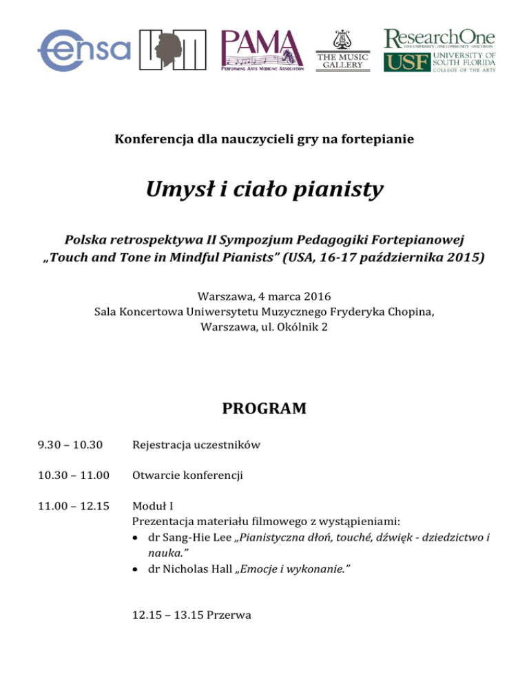 Konferencja dla nauczycieli gry na fortepianie Umysł i ciało pianisty Polska retrospektywa II Sympozjum Pedagogiki Fortepianowej „Touch and Tone in Mindful Pianists” (USA, 16-17 października 2015) Warszawa, 4 marca 2016 Sala Koncertowa Uniwersytetu Muzycznego Fryderyka Chopina, Warszawa, ul. Okólnik 2 PROGRAM 9.30 – 10.30 Rejestracja uczestników 10.30 – 11.00 Otwarcie konferencji 11.00 – 12.15 Moduł I Prezentacja materiału filmowego z wystąpieniami: dr Sang-Hie Lee „Pianistyczna dłoń, touché, dźwięk - dziedzictwo i nauka.” dr Nicholas Hall „Emocje i wykonanie.” 12.15 – 13.15 Przerwa 13.15 – 14.45 Moduł II GOŚĆ SPECJALNY - WYKŁAD dr Carina Joly „Nowe horyzonty w nauczaniu gry na fortepianie: praktyczne rozważania o postawie i stabilizacji ciała.” 14.45 – 15.15 Przerwa 15.15 – 16.45 Moduł III Prezentacja materiału filmowego z wystąpieniami: John Chong i Dustin Hardwick: „Przykłady techniki palcowej, masy i pracy ramienia, przenoszenia ciężaru, koordynacji mięśni piersiowych.” dr Martha Thomas: „Wielkie techniki dla małych dłoni: strategie ćwiczenia dla pianistów z małymi i średniej wielkości dłońmi.” 16.45 – 17.00 Zakończenie konferencji