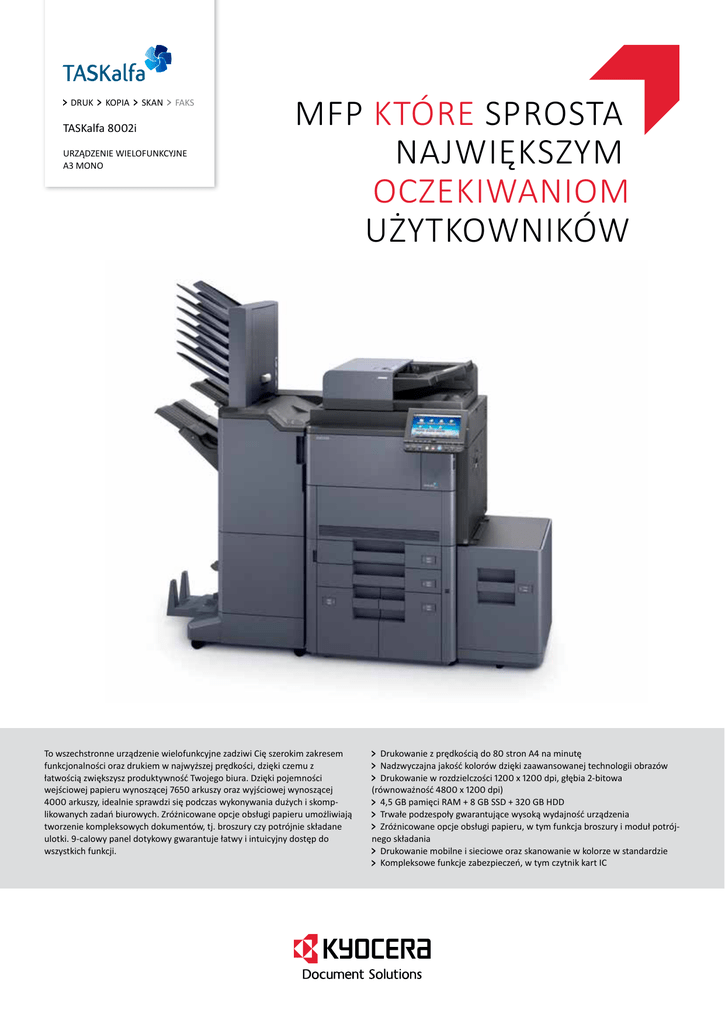 DRUK KOPIA SKAN FAKS TASKalfa 8002i URZĄDZENIE WIELOFUNKCYJNE A3 MONO MFP które sprosta największym oczekiwaniom użytkowników To wszechstronne urządzenie wielofunkcyjne zadziwi Cię szerokim zakresem funkcjonalności oraz drukiem w najwyższej prędkości, dzięki czemu z łatwością zwiększysz produktywność Twojego biura. Dzięki pojemności wejściowej papieru wynoszącej 7650 arkuszy oraz wyjściowej wynoszącej 4000 arkuszy, idealnie sprawdzi się podczas wykonywania dużych i skomplikowanych zadań biurowych. Zróżnicowane opcje obsługi papieru umożliwiają tworzenie kompleksowych dokumentów, tj. broszury czy potrójnie składane ulotki. 9-calowy panel dotykowy gwarantuje łatwy i intuicyjny dostęp do wszystkich funkcji. Drukowanie z prędkością do 80 stron A4 na minutę Nadzwyczajna jakość kolorów dzięki zaawansowanej technologii obrazów Drukowanie w rozdzielczości 1200 x 1200 dpi, głębia 2-bitowa (równoważność 4800 x 1200 dpi) 4,5 GB pamięci RAM + 8 GB SSD + 320 GB HDD Trwałe podzespoły gwarantujące wysoką wydajność urządzenia Zróżnicowane opcje obsługi papieru, w tym funkcja broszury i moduł potrójnego składania Drukowanie mobilne i sieciowe oraz skanowanie w kolorze w standardzie Kompleksowe funkcje zabezpieczeń, w tym czytnik kart IC TASKalfa 8002i została wyposażona w bardzo wytrzymałe komponenty umożliwiające efektywne i niezawodne działanie w aktywnych środowiskach biurowych. Urządzenia zapewniają wysoką wydajność oraz szerokie możliwości indywidualnej konfiguracji, gwarantując jednocześnie minimalny wpływ na środowisko. DANE OGÓLNE Technologia: KYOCERA Laser mono, platforma HyPAS™ Prędkość drukowania i kopiowania: 80/40 stron A4/ A3 Rozdzielczość: 1200 x 1200 dpi, głębia 2-bitowa dla drukowania w jakości 4800 dpi x 1200 dpi Czas nagrzewania od momentu włączenia: Ok. 30 sekund lub mniej Czas wydruku pierwszej strony: Ok. 4,7 sek. lub mniej Procesor: Freescale QorIQ T1024 (Dual Core) 1.2 GHz Pamięć: 4,5 GB pamięci RAM, 8 GB SSD + 320 GB HDD Interfejsy: USB 2.0 (Hi-Speed) x 4, USB Host 2.0, Fast Ethernet 10BaseT/100BaseTX/1000BaseT, gniazdo dodatkowej karty sieciowej, gniazdo opcjonalnej karty pamięci SD, SDHC, gniazdo na opcjonalny Fax System Wymiary (szer x głęb x wys): 750 x 822 x 1234mm (DP, panel sterowania uwzględnione) Waga: Ok. 150 kg Napięcie zasilania: AC 220 V ~ 240 V, 50/60 Hz Pobór mocy: Drukowanie: 1170 W Tryb gotowości: 100 W Tryb uśpienia: 1 W Poziom hałasu (ISO 7779/ISO 9296): Drukowanie: 54,5 dB(A) LpA, gotowość: 34,3 dB(A) LpA Certyfikaty: GS, TÜV, CE - urządzenie produkowane jest zgodnie z normami jakości ISO 9001, ochrony środowiska ISO 14001 oraz dyrektywą RoHs OBSŁUGA PAPIERU Wszystkie podane pojemności dotyczą papieru o grubości 0,11 mm. Pojemność wejściowa: Taca uniwersalna na 150 arkuszy, 60 – 300 g/m2 (baner 136 – 165 g/m2), A6R – 305 x 457 mm, baner maks. 305 x 1220 mm; podajniki papieru 2x 1500 arkuszy, 60 – 256 g/m2, A4, B5; uniwersalne kasety na papier 2x500 arkuszy, 60 – 256 g/m2, A5R – 305 x 457 mm; maks. pojemność wejściowa (z opcjami): 7650 arkuszy A4 Podajnik dokumentów: (jednościeżkowe skanowanie w dupleksie) 270 arkuszy; 35 – 220 g/m2 (jednostronnie), 50 – 220 g/m2 (dwustronnie); A6R – baner do 2200 mm Moduł dupleksu: Drukowanie dwustronne w standardzie, A5R – 305 x 457 mm, 60 – 256 g/m2 Pojemność wyjściowa: Standardowa taca separująca na 70 arkuszy, opcjonalnie taca kopii (D): górna na 100 arkuszy, dolna na 250 arkuszy; maks. opcjonalna pojemność wyjściowa: 4300 arkuszy DRUKOWANIE Język kontrolera: PRESCRIBE Emulacje: PCL6 (PCL5c/PCL-XL), KPDL3 (zgodna z PostScript 3), wydruk bezpośredni plików PDF, XPS i OpenXPS Obsługiwane systemy operacyjne: Wszystkie aktualne wersje Windows, Mac OS X wersja 10,8 lub wyższa, UNIX LINUX oraz inne według potrzeb Czcionki: 93 czcionki outline (PCL), 136 czcionek (KPDL3), 8 czcionek (Windows Vista), 1 czcionka Bitmap, 45 typów 1-wymiarowych oraz jeden 2-wymiarowy kod kreskowy (PDF-417) Dodatkowe możliwości drukowania: Szyfrowany druk bezpośredni PDF, drukowanie IPP, drukowanie e-mail, WSD, wydruk bezpieczny przez SSL, IPsec, SNMPv3, szybkie kopiowanie, funkcja wydruku próbnego, wydruk prywatny, przechowywanie i zarządzanie pracami Obsługa druku mobilnego: Aplikacja KYOCERA Mobile Print dla iOS i Android, AirPrint, Mopria, NFC, Direct Wi-Fi, Google Cloud Print OPIOWANIE Maksymalny format oryginału: A3 Kopiowanie ciągłe: 1 – 9999 Zakres zoom: 25 – 400% co 1% Stałe współczynniki zoom: 5 zmniejszeń/5 powiększeń Funkcje: Skanuj raz-drukuj wielokrotnie, sorter elektroniczny, 2w1, 4w1, funkcja powtarzania obrazu, numerowanie stron, tryb okładki, broszura, przerwanie kopiowania, szablon formularza, funkcja stemplowania, pomijanie pustych stron Tryby ekspozycji: Automatyczny, ręczny: 16 stopni Wybór oryginału: Tekst + zdjęcie, tekst, zdjęcie, map SKANOWANIE Tryby skanowania: Skan do e-mail, skan do FTP, do SMB, do USB Host, do skrzynki, Network TWAIN, WSD Szybkość skanowania: (A4, 300 dpi, Dual Scan) 220 obrazów na minutę Rozdzielczość: 600 x 600 dpi, 400 x 400 dpi, 300 x 300 dpi, 200 x 400 dpi, 200 x 200 dpi, 200 x 100 dpi (24 bity) Maksymalny obszar skanowania: A3, baner do 2200 mm Rozpoznawanie oryginału: Tekst, zdjęcie, tekst + zdjęcie, zoptymalizowany pod OCR Typy plików: PDF (skompresowany, szyfrowany, PDF/A), przeszukiwalny PDF (OCR), JPEG, TIFF, XPS, Open XPS FAKS (OPCJA) Kompatybilność: ITU-T Super G3 Szybkość modemu: Maks. 33,6 kbps Szybkość transmisji: Maks. 3 sekundy (JBIG) Dostępne rozdzielczości: Normal: 200 x 100 dpi Fine: 200 x 200 dpi Superfine: 200 x 400 dpi Ultrafine: 400 x 400 dpi, 600 x 600 dpi Maks. rozmiar oryginału: A3, baner do 1600 mm Metody kompresji: JBIG, MMR, MR, MH Funkcje: Faks internetowy (opcja), faks sieciowy, wysyłanie i odbiór z obrotem obrazu, odbiór faksów 2-stronnych, odbiór do pamięc
