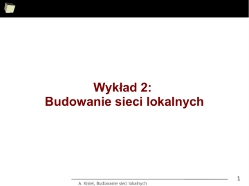 Wykład 2: Budowanie sieci lokalnych A. Kisiel, Budowanie sieci lokalnych 1 Budowanie sieci lokalnych Technologie istotne z punktu widzenia konfiguracji i testowania poprawnego działania sieci lokalnej: Protokół ICMP i narzędzia go wykorzystujące Mapowanie adresów: DNS i ARP ■ Funkcje i znaczenie routera w sieci lokalnej ■ Technologia NAT ■ Interfejs sieciowy i jego konfiguracja ■ Automatyczna konfiguracja sieci: DHCP ■ A. Kisiel, Budowanie sieci lokalnych 2 Sieć lokalna Internet router host serwer DNS (DHCP, WWW, etc.) Sieć lokalna ma wspólny „adres IP sieci” ■ Zwykle stanowi jeden zespół komputerów połączonych Ethernetem i/lub WiFi ■ A. Kisiel, Budowanie sieci lokalnych 3 Protokół ICMP Protokół ICMP (Internet Control Message Protocol) działa w w. sieci, jest przekazywany w ramkach IP ■ ICMP kontroluje i modyfikuje działania urządzeń w w. sieci: steruje przepływem danych raportuje brak możliwości dostarczenia danych (z podaniem przyczyny) umożliwia przekierowanie tras testuje osiągalność zdalnego hosta raportuje przekroczenie TTL protokółu IP (Time-To-Live), gdy pakiet jest zbyt wiele razy przekazywany pomiędzy kolejnymi hostami ■ A. Kisiel, Budowanie sieci lokalnych 4 Zastosowanie ICMP: ping i traceroute Polecenie ping wykorzystuje funkcjonalność ICMP Echo: host otrzymujący taki komunikat powinien odpowiedzieć można sprawdzić dostępność hosta można sprawdzić czas dostępu i jakość łącza ■ Polecenie traceroute korzysta z funkcjonalności TTL protokołu IP i odpowiedzi ICMP do śledzenia drogi pakietów w sieci pokazuje trasę, którą przebywają pakiety po drodze do zdalnego hosta testuje, gdzie urywa się połączenie pokazuje czas odpowiedzi w kolejnych etapach ■ A. Kisiel, Budowanie sieci lokalnych 5 Mapowanie adresów: DNS ■ Usługa DNS (Domain Name Service) dokonuje zamiany (mapowania) nazwy literowej komputera na adres IP. działa w warstwie aplikacji, t.j. w sieci musi być uruchomiona aplikacja serwera DNS na konkretnym komputerze. Jego adres musimy podać jako część konfiguracji sieci. mapowanie nazwa-IP nie jest jednoznaczne, chociaż każde zapytanie o poprawną nazwę zawsze zwraca jeden numer IP w lokalnej sieci jeden serwer DNS lub wcale można użyć lokalnego pliku /etc/hosts A. Kisiel, Budowanie sieci lokalnych 6 Mapowanie adresów: ARP ■ Protokół ARP działa na połączeniu w. łącza danych i sieciowej. Dokonuje translacji adresów IP na adresy sprzętowe MAC poprawne odpowiedzi ARP są przechowywane w lokalnej tablicy ARP (większa szybkość) gdy adres IP jest poprawny, ale nie znajduje się w sieci lokalnej, ARP podaje adres urządzenia, które wie co dalej zrobić z pakietem Adresy MAC są unikalne globalnie, ale nie da się ich użyć do adresowania w Internecie. Przy pomocy ARP poznajemy tylko adresy wewnątrz naszej sieci lokalnej (Ethernet) A. Kisiel, Budowanie sieci lokalnych 7 Znaczenie i funkcje routera ■ Router (gateway) jest urządzeniem łączącym sieć lokalną z inną siecią (w tym z Internetem) działa w w. sieci – funkcjonuje na podstawie adresów IP jego adres MAC jest granicą poza którą kończy się „sieć lokalna” musi mieć połączenie z co najmniej dwoma sieciami i przekierowuje ruch pomiędzy nimi (w obie strony) każdy komputer w sieci lokalnej, który chce połączyć się z Internetem musi znać jego adres (część konfiguracji komputera) A. Kisiel, Budowanie sieci lokalnych 8 Technologia NAT ■ Technologia NAT (Network Address Translation) mapuje jedne adresy IP/porty na inne Powszechnie stosowane do podłączenia sieci prywatnych do Internetu Taka sieć prywatna jest widoczna z zewnątrz jako jeden adres IP (adres routera), wewnątrz sieci komputery są rozróżniane przez ich adresy IP, na zewnątrz każda lokalna kombinacja IP+numer portu jest mapowane na inny port zewnętrzny routera. Router musi obsługiwać NAT – gdy jakiś komputer z sieci lokalnej łączy się ze światem, połączenie jest mapowane na jeden z portów routera przypisanych do zewnętrznego adresu. Komunikacja zwrotna na ten port jest przekierowywana do hosta w sieci lokalnej. Zalety i wady rozwiązania: ➔ „Oszczędza” adresy IP ➔ Utrudnia ataki na komputery w sieci lokalnej ➔ Serwer postawiony na komputerze w sieci lokalnej nie będzie widoczny z zewnątrz (bez dodatkowych działań) A. Kisiel, Budowanie sieci lokalnych 9 Router a gateway ■ Często stosowaną konfiguracją sieci lokalnej jest zmiana sposobu podłączenia do sieci Internet: zamiast routera używa się gateway Router to urządzenie działające w w. sieci i w. transportowej, gateway działa w w. aplikacji Aby dostać się do „wewnętrznej” sieci, należy najpierw zalogować się na gatewayu, dopiero z niego można połączyć się z komputerami w sieci lokalnej. Połączenia wychodzące zwykle nie mają tego ograniczenia. Pozwala to na lepszą kontrolę bezpieczeństwa, dodatkowo sieć lokalna może być nierutowalna A. Kisiel, Budowanie sieci lokalnych 10 Interfejs sieciowy ■ Interfejs sieciowy, to punkt dostępu przy pomocy którego komputer komunikuje się z siecią zwykle jest związany z konkretnym urządzeniem fizycznym (kiedyś kartą sieciową, teraz zwykle wbudowaną w płytę główną), ale nie zawsze (np. interfejs loopback) ma przypisany adres sieciowy (dla Internetu: adres IP) jest obiektem używanym w konfiguracji bardziej zaawansowanych funkcjonalności sieciowych (routing, dzielenie łącza) A. Kisiel, Budowanie sieci lokalnych 11 Konfiguracja sieci ■ „Skonfigurowanie sieci” polega na logicznym powiązaniu adresów z konkretnymi urządzeniami oraz wskazanie sposobów połączenia z najważniejszymi usługami Musimy się upewnić, że mamy poprawnie uruchomione urządzenie fizyczne (zwykle: poprawnie zainstalowany sterownik) Adres IP przypisujemy poleceniem ifconfig Wskazujemy sposób kontaktu z adresami poza naszą siecią lokalną poleceniem route Podajemy adres