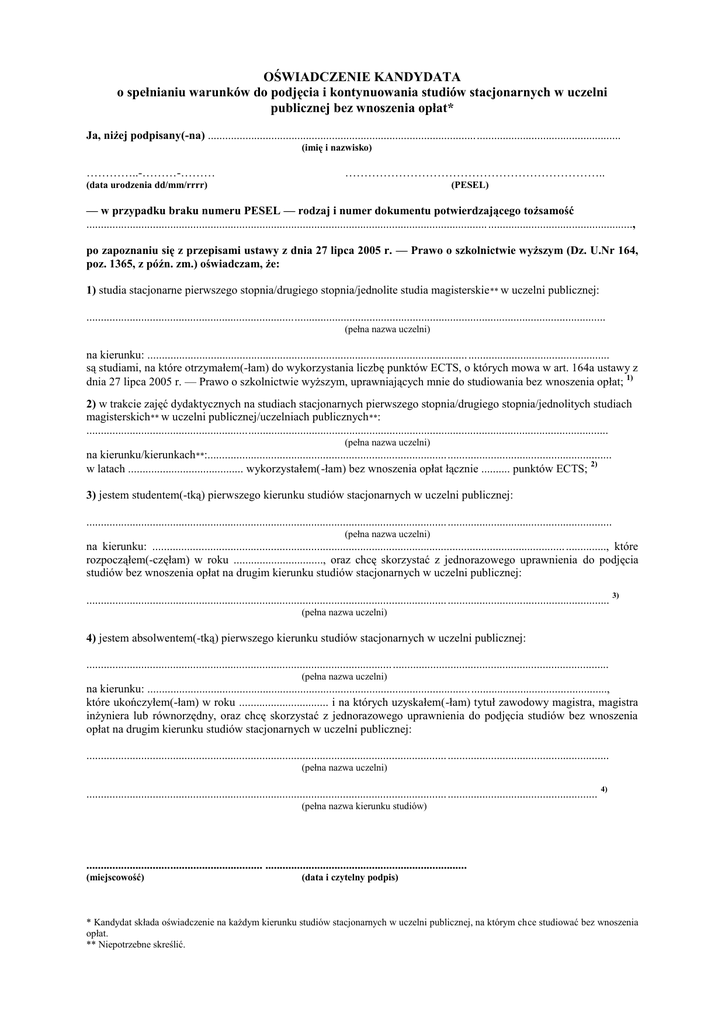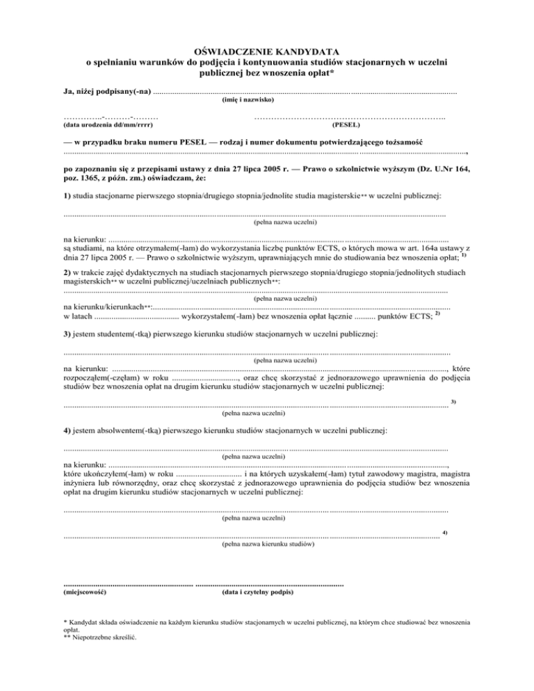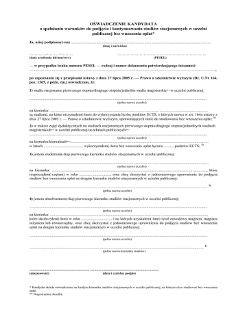 OŚWIADCZENIE KANDYDATA o spełnianiu warunków do podjęcia i kontynuowania studiów stacjonarnych w uczelni publicznej bez wnoszenia opłat* Ja, niżej podpisany(-na) ............................................................................................................................................... (imię i nazwisko) …………..-………-……… ………………………………………………………….. (data urodzenia dd/mm/rrrr) (PESEL) — w przypadku braku numeru PESEL — rodzaj i numer dokumentu potwierdzającego tożsamość ........................................................................................................................................... .................................................., po zapoznaniu się z przepisami ustawy z dnia 27 lipca 2005 r. — Prawo o szkolnictwie wyższym (Dz. U.Nr 164, poz. 1365, z późn. zm.) oświadczam, że: 1) studia stacjonarne pierwszego stopnia/drugiego stopnia/jednolite studia magisterskie ** w uczelni publicznej: .................................................................................................................................................................................... (pełna nazwa uczelni) na kierunku: ............................................................................................................... ................................................. są studiami, na które otrzymałem(-łam) do wykorzystania liczbę punktów ECTS, o których mowa w art. 164a ustawy z dnia 27 lipca 2005 r. — Prawo o szkolnictwie wyższym, uprawniających mnie do studiowania bez wnoszenia opłat; 1) 2) w trakcie zajęć dydaktycznych na studiach stacjonarnych pierwszego stopnia/drugiego stopnia/jednolitych studiach magisterskich** w uczelni publicznej/uczelniach publicznych **: ..................................................................................................................................................................................... (pełna nazwa uczelni) na kierunku/kierunkach**:............................................................................................................................................ w latach ........................................ wykorzystałem(-łam) bez wnoszenia opłat łącznie .......... punktów ECTS; 2) 3) jestem studentem(-tką) pierwszego kierunku studiów stacjonarnych w uczelni publicznej: ............................................................................................................................. ......................................................... (pełna nazwa uczelni) na kierunku: ............................................................................................................................................... .............., które rozpocząłem(-częłam) w roku ..............................., oraz chcę skorzystać z jednorazowego uprawnienia do podjęcia studiów bez wnoszenia opłat na drugim kierunku studiów stacjonarnych w uczelni publicznej: ............................................................................................................................. ........................................................ 3) (pełna nazwa uczelni) 4) jestem absolwentem(-tką) pierwszego kierunku studiów stacjonarnych w uczelni publicznej: ..................................................................................................................................................................................... (pełna nazwa uczelni) na kierunku: ..............................................................................................................................................................., które ukończyłem(-łam) w roku ............................... i na których uzyskałem(-łam) tytuł zawodowy magistra, magistra inżyniera lub równorzędny, oraz chcę skorzystać z jednorazowego uprawnienia do podjęcia studiów bez wnoszenia opłat na drugim kierunku studiów stacjonarnych w uczelni publicznej: ............................................................................................................................. ........................................................ (pełna nazwa uczelni) ............................................................................................................................. .................................................... 4) (pełna nazwa kierunku studiów) ............................................................. ...................................................................... (miejscowość) (data i czytelny podpis) * Kandydat składa oświadczenie na każdym kierunku studiów stacjonarnych w uczelni publicznej, na którym chce studiować bez wnoszenia opłat. ** Niepotrzebne skreślić. PRZYPISY: 1)Wypełnia kandydat, który chce podjąć w uczelni publicznej studia stacjonarne pierwszego albo drugiego stopnia albo jednolite studia magisterskie w roku akademickim 2011/2012 lub w latach następnych (bez względu na ukończone przed dniem 1 października 2011 r. studia stacjonarne w uczelni publicznej bez wnoszenia opłat) i dla którego są to pierwsze studia stacjonarne w uczelni publicznej bez wnoszenia opłat na określonym poziomie kształcenia, na które otrzymał do wykorzystania liczbę punktów ECTS, o których mowa w art. 164a ustawy z dnia 27 lipca 2005 r. — Prawo o szkolnictwie wyższym. 2) Wypełnia kandydat, który chce kontynuować bez wnoszenia opłat studia stacjonarne w uczelni publicznej na określonym poziomie kształcenia, rozpoczęte w roku akademickim 2011/2012 lub w latach następnych, które będzie odbywał w ramach liczby punktów ECTS, o których mowa w art. 164a ustawy z dnia 27 lipca 2005 r.— Prawo o szkolnictwie wyższym. W przypadku gdy limit punktów był wykorzystywany przez kandydata na określonym poziomie kształcenia w więcej niż jednej uczelni lub na więcej niż jednym kierunku, należy wskazać je wszystkie. 3) Wyp