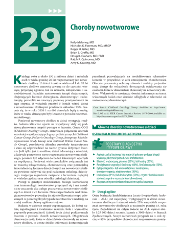 29 K Choroby nowotworowe Kelly Maloney, MD Nicholas K. Foreman, MD, MRCP Roger H. Giller, MD Brian S. Greffe, MD Doug K. Graham, MD, PhD Ralph R. Quinones, MD Amy K. Keating, MD ażdego roku u około 150 z miliona dzieci i młodych osób w wieku poniżej 20 lat rozpoznawany jest nowotwór złośliwy. U dzieci i osób w wieku od 1 do 20 lat nowotwory złośliwe stanowią czwartą co do częstości wiodącą przyczynę zgonów, tuż za urazami, zabójstwami i samobójstwami. Jednakże zastosowanie terapii skojarzonych, obejmujących leczenie chirurgiczne, chemioterapię i radioterapię, pozwoliło na znaczącą poprawę przeżywalności do tego stopnia, iż wskaźnik przeżyć 5-letnich wśród dzieci z nowotworami złośliwymi przekracza aktualnie 75%. Szacuje się, że w roku 2020 1 na 600 dorosłych będą to osoby, które w wieku dziecięcym były leczone z powodu nowotworu złośliwego. Ponieważ nowotwory złośliwe u dzieci występują rzadko, badania kliniczne oparte na współpracy stały się podstawą planowania terapii i postępu w leczeniu. Grupa COG (Children’s Oncology Group), stanowiąca połączenie czterech wcześniej współpracujących grup pediatrycznych (Children’s Cancer Group, Pediatric Oncology Group, Intergroup Rhabdomyosarcoma Study Group oraz National Wilms Tumor Study Group), przedstawia aktualne protokoły terapeutyczne i stara się odpowiedzieć na ważne pytania dotyczące leczenia. Jeśli tylko jest to możliwe, dzieci i dorastająca młodzież, u których postawiono nowe rozpoznanie nowotworu złośliwego, powinni być włączeni do badań klinicznych opartych na współpracy. Ponieważ wiele protokołów związanych jest ze znaczną toksycznością, chorobowością oraz potencjalną śmiertelnością, leczenie dzieci chorych na nowotwory złośliwe powinno odbywać się pod nadzorem onkologa dziecięcego znającego zagrożenia związane z leczeniem, najlepiej w wielodyscyplinarnym ośrodku onkologii dziecięcej. Postęp w genetyce molekularnej, biologii komórkowej oraz immunologii nowotworów przyczynił się i ma zasadnicze znaczenie dla stałego poznawania nowotworów złośliwych u dzieci i ich leczenia. Nieustające badania nad biologią nowotworów prowadzą do zidentyfikowania terapii celowanych w poszczególnych typach nowotworów z nadzieją na mniej nasilone objawy ogólnoustrojowe. Badania w zakresie terapii wspomagającej, do której należą zapobieganie i zwalczanie zakażeń, bólu i wymiotów, poprawiły przeżywalność i jakość życia dzieci poddawanych leczeniu z powodu chorób nowotworowych. Długotrwała obserwacja osób, które w dzieciństwie chorowały na nowotwory złośliwe, to cenne źródło informacji dostarczających przesłanek pozwalających na modyfikowanie schematów leczenia w przyszłości w celu zmniejszenia chorobowości. Obecnie pracownicy ochrony zdrowia i rodziny pacjentów mają dostęp do wskazówek dotyczących opiekowania się osobami, które w dzieciństwie chorowały na nowotwory złośliwe. Wskazówki te zawierają również informacje na temat wskazanych badań oraz skutków odległych w zależności od zastosowanej chemioterapii. Cure Search. Children’s Oncology Group. Available at: http://www. survivorshipguidelines.org Ries LAG et al: SEER Cancer Statistics Review, 1975–2000.Available at: http://seer.cancer.gov/csr/1975_2000 Główne choroby nowotworowe u dzieci OSTRA BIAŁACZKA LIMFOBLASTYCZNA PODSTAWY DIAGNOSTYKI I TYPOWE OBJAWY Aspirat szpiku kostnego lub materiał pobrany podczas biopsji wykazują obecność ponad 25% limfoblastów. Bladość, wybroczyny, plamica (50%), ból kostny (25%). Powiększenie wątroby i śledziony (60%), limfadenopatia (50%). Cytopenia jedno- lub wieloukładowa: neutropenia, trombocytopenia, niedokrwistość (99%). Leukopenia (15%) lub leukocytoza (50%), często z limfoblastami stwierdzanymi w rozmazie krwi obwodowej. Rozpoznanie potwierdzone badaniem szpiku kostnego. Uwagi ogólne Ostra białaczka limfoblastyczna (acute lymphoblastic leukemia – ALL) jest najczęściej występującym u dzieci nowotworem złośliwym i stanowi około 25% wszystkich rozpoznań nowotworów złośliwych u pacjentów poniżej 15. roku życia. Zapadalność na całym świecie na ALL wynosi około 1:25 000 dzieci rocznie, łącznie z 3000 dzieci w Stanach Zjednoczonych. Szczyt zachorowań przypada na 4. rok życia; w 85% przypadków choroba jest rozpoznawana pomię- CHOROBY NOWOTWOROWE dzy 2. a 10. r.ż. Dzieci z zespołem Downa mają 14-krotnie większe ryzyko zachorowania na białaczkę. ALL jest spowodowana niekontrolowaną proliferacją niedojrzałych limfocytów. Jej przyczyna jest nieznana, pewną rolę mogą odgrywać czynniki genetyczne. Białaczka jest definiowana jako obecność ponad 25% nowotworowych komórek hematopoetycznych (blastów) w aspiracie szpiku kostnego. Blasty białaczkowe w większości przypadków ALL wieku dziecięcego mają na swojej powierzchni tzw. antygen CALLA (ang. common ALL antigen). Blasty te wywodzą się z prekursorów komórek B na wczesnym etapie ich rozwoju. Białaczkę taką określa się mianem „białaczki z komórek prekursorowych B”. Rzadziej limfoblasty wywodzą się z komórek T lub dojrzałych komórek B. Aktualnie ponad 70% dzieci leczonych z powodu ALL, otrzymujących agresywną skojarzoną chemioterapię oraz wczesne leczenie zmian w ośrodkowym układzie nerwowym przed wystąpieniem objawów, zostaje wyleczonych. Obraz kliniczny A. Objawy podmiotowe i przedmiotowe Pierwsze objawy występujące u pacjentów z ALL obejmują objawy związane z upośledzeniem funkcji szpiku jako źródła krwinek czerwonych (red blood cells – RBC), krwinek białych (white blood cells – WBC) bądź płytek krwi oraz objawy związane z pozaszpikowymi naciekami białaczkowymi (poza szpikiem kostnym). Często występuje gorączka przerywana na skutek albo działania cytokin indukowanych przez samą białaczkę, albo zakażeń rozwijających się na po