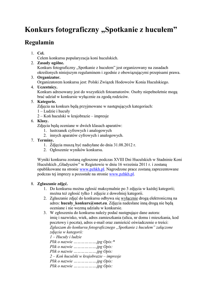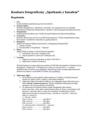 Konkurs fotograficzny „Spotkanie z hucułem” Regulamin 1. Cel. Celem konkursu popularyzacja koni huculskich. 2. Zasady ogólne. Konkurs fotograficzny „Spotkanie z hucułem” jest organizowany na zasadach określonych niniejszym regulaminem i zgodnie z obowiązującymi przepisami prawa. 3. Organizator. Organizatorem konkursu jest: Polski Związek Hodowców Konia Huculskiego. 4. Uczestnicy. Konkurs adresowany jest do wszystkich fotoamatorów. Osoby niepełnoletnie mogą brać udział w konkursie wyłącznie za zgodą rodziców. 5. Kategorie. Zdjęcia na konkurs będą przyjmowane w następujących kategoriach: 1 – Ludzie i hucuły 2 – Koń huculski w krajobrazie – impresje 6. Klasy. Zdjęcia będą oceniane w dwóch klasach aparatów: 1. lustrzanek cyfrowych i analogowych 2. innych aparatów cyfrowych i analogowych. 7. Terminy. 1. Zdjęcia muszą być nadsyłane do dnia 31.08.2012 r. 2. Ogłoszenie wyników konkursu. Wyniki konkursu zostaną ogłoszone podczas XVIII Dni Huculskich w Stadninie Koni Huculskich „Gładyszów” w Regietowie w dniu 16 września 2011 r. i zostaną opublikowane na stronie www.pzhkh.pl. Nagrodzone prace zostaną zaprezentowane podczas tej imprezy a pozostałe na stronie www.pzhkh.pl. 8. Zgłaszanie zdjęć. 1. Do konkursu można zgłosić maksymalnie po 3 zdjęcia w każdej kategorii; można też zgłosić tylko 1 zdjęcie z dowolniej kategorii. 2. Zgłaszanie zdjęć do konkursu odbywa się wyłącznie drogą elektroniczną na adres: [email protected]. Zdjęcia nadesłane inną drogą nie będą oceniane i nie wezmą udziału w konkursie. 3. W zgłoszeniu do konkursu należy podać następujące dane autora: imię i nazwisko, wiek, adres zamieszkania (ulica, nr domu i mieszkania, kod pocztowy i poczta), adres e-mail oraz zamieścić oświadczenie o treści: Zgłaszam do konkursu fotograficznego „Spotkanie z hucułem” załączone zdjęcia w kategorii: 1 – Hucuły i ludzie Plik o nazwie ……………….jpg Opis:* Plik o nazwie ……………….jpg Opis: Plik o nazwie ……………….jpg Opis: 2 – Koń huculski w krajobrazie – impresje Plik o nazwie ……………….jpg Opis: Plik o nazwie ……………….jpg Opis: Plik o nazwie ……………….jpg Opis: Wyrażam zgodę na przetwarzanie przez organizatora konkursu moich danych osobowych zgodnie z Ustawą o ochronie danych osobowych (Dz. U. nr 133/97, poz.883). *) Dopuszczalny jest opis zdjęcia w formie metadanych EXIF wg specyfikacji 2.1 lub 2.2 (automatycznie dodawany przez niektóre aparaty fotograficzne), uzupełniony danymi autora i krótkim opisem – komentarzem. 4. W opisie każdego zdjęcia należy podać: rodzaj aparatu, jakim zostało ono wykonane (kompaktczy lustrzanka, ewentualnie także marka i model), tytuł (nieobowiązkowo), krótki opis – komentarz (gdzie zostało wykonane, co przedstawia itp.). 5. Osoby niepełnoletnie muszą załączyć zgodę rodziców na udział w konkursie. 6. Zgłoszenie zdjęcia do konkursu stanowi jednocześnie akceptację wszystkich zapisów niniejszego regulaminu oraz potwierdzenie autentyczności danych. 9. Parametry zdjęć. Zdjęcia zgłaszane do konkursu powinny mieć: 1. maksymalny wymiar dłuższego boku: 1600 pikseli 2. minimalny wymiar krótszego boku: 1000 pikseli 3. maksymalny rozmiar pliku: 3 MB 4. format pliku: .jpg (nie mniej niż średni stopień kompresji) 5. na zdjęciach nie mogą być umieszczane żadne napisy, znaki wodne lub inne elementy graficzne. 10. Jury oraz zasady oceny i wyboru zwycięzców. 1. Oceny prac dokonają trzej jurorzy akredytowani przez organizatora. Każdy z jurorów wyda własny, niezależny od innych werdykt. Juror nie ma obowiązku oddania głosu we wszystkich kategoriach i klasach, jeżeli uzna to za stosowne. Werdykt jurora jest ostateczny i niepodważalny. 2. Jurorzy wybiorą niezależnie najlepsze zdjęcia w obu klasach. Ocena końcowa i wybór zwycięskich zdjęć w każdej klasie zostaną dokonane na oddzielnym spotkaniu jurorów. 11. Nagrody. W każdej klasie nagrodzone zostaną 3 zdjęcia. 1. Za pierwsze miejsce autor otrzyma nagrodę …………………………….. 2. Za drugie miejsce autor otrzyma nagrodę ……………………………….. 3. Za trzecie miejsce autor otrzyma nagrodę ………………………………. Nagrodzeni autorzy otrzymają również pamiątkowe dyplomy. Nagrody i dyplomy zostaną wręczone podczas XVIII Dni Huculskich w Stadninie Koni Huculskich „Gładyszów” w Regietowie w dniu 16 września 2012 r. Organizatorzy mogą przyznać nagrody specjalne i nagrody dodatkowe. 12. Deklaracje. Zgłoszenie zdjęć do konkursu jest deklaracją, że osoba zgłaszająca: 1. jest autorem załączonych zdjęć, 2. osoby rozpoznawalne na zdjęciach wyrażają zgodę na ich publikowanie, również dla celów reklamowych organizatora konkursu, 3. przyjmuje na siebie wszelkie roszczenia jakiejkolwiek natury, które osoby trzecie mogłyby kierować przeciwko organizatorom konkursu, 4. przyjmuje warunki Regulaminu Konkursu, 5. wyraża zgodę na przetwarzanie swoich danych osobowych zgodnie z ustawą o Ochronie Danych Osobowych (Dz.U.Nr.133 pozycja 883), 6. wyraża zgodę na nieodpłatne wykorzystywanie przez organizatora konkursu nadesłanych zdjęć, w dowolnym czasie i formie, dla celów promocji koni huculskich. 13. Postanowienia końcowe. 1. Organizator ma prawo do usuwania fotografii i tekstów o treści powszechnie uznawanej za obraźliwe, naruszające prawa osób trzecich lub prawo polskie, zawierających treści pornograficzne lub w sposób oczywisty godzące w uczucia religijne. Decyzja o usunięciu takich treści jest niepodważalna i ostateczna. 2. Organizator nie ponosi odpowiedzialności za zdarzenia uniemożliwiające prawidłowe przeprowadzenie konkursu, których nie był w stanie przewidzieć lub, którym nie mógł zapobiec, w szczególności w przypadku zaistnienia zdarzeń losowych, w tym siły wyższej. 3. Organizator ma prawo zmiany postan