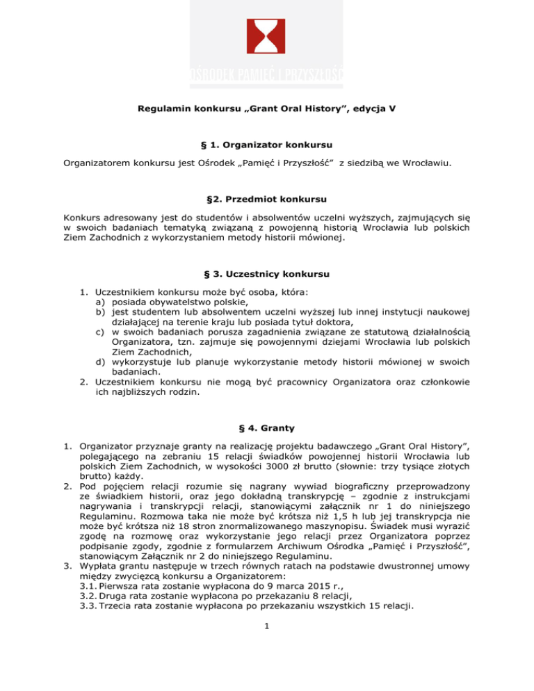 Regulamin konkursu „Grant Oral History”, edycja V § 1. Organizator konkursu Organizatorem konkursu jest Ośrodek „Pamięć i Przyszłość” z siedzibą we Wrocławiu. §2. Przedmiot konkursu Konkurs adresowany jest do studentów i absolwentów uczelni wyższych, zajmujących się w swoich badaniach tematyką związaną z powojenną historią Wrocławia lub polskich Ziem Zachodnich z wykorzystaniem metody historii mówionej. § 3. Uczestnicy konkursu 1. Uczestnikiem konkursu może być osoba, która: a) posiada obywatelstwo polskie, b) jest studentem lub absolwentem uczelni wyższej lub innej instytucji naukowej działającej na terenie kraju lub posiada tytuł doktora, c) w swoich badaniach porusza zagadnienia związane ze statutową działalnością Organizatora, tzn. zajmuje się powojennymi dziejami Wrocławia lub polskich Ziem Zachodnich, d) wykorzystuje lub planuje wykorzystanie metody historii mówionej w swoich badaniach. 2. Uczestnikiem konkursu nie mogą być pracownicy Organizatora oraz członkowie ich najbliższych rodzin. § 4. Granty 1. Organizator przyznaje granty na realizację projektu badawczego „Grant Oral History”, polegającego na zebraniu 15 relacji świadków powojennej historii Wrocławia lub polskich Ziem Zachodnich, w wysokości 3000 zł brutto (słownie: trzy tysiące złotych brutto) każdy. 2. Pod pojęciem relacji rozumie się nagrany wywiad biograficzny przeprowadzony ze świadkiem historii, oraz jego dokładną transkrypcję – zgodnie z instrukcjami nagrywania i transkrypcji relacji, stanowiącymi załącznik nr 1 do niniejszego Regulaminu. Rozmowa taka nie może być krótsza niż 1,5 h lub jej transkrypcja nie może być krótsza niż 18 stron znormalizowanego maszynopisu. Świadek musi wyrazić zgodę na rozmowę oraz wykorzystanie jego relacji przez Organizatora poprzez podpisanie zgody, zgodnie z formularzem Archiwum Ośrodka „Pamięć i Przyszłość”, stanowiącym Załącznik nr 2 do niniejszego Regulaminu. 3. Wypłata grantu następuje w trzech równych ratach na podstawie dwustronnej umowy między zwycięzcą konkursu a Organizatorem: 3.1. Pierwsza rata zostanie wypłacona do 9 marca 2015 r., 3.2. Druga rata zostanie wypłacona po przekazaniu 8 relacji, 3.3. Trzecia rata zostanie wypłacona po przekazaniu wszystkich 15 relacji. 1 4. Grant nie podlega przedłużeniu. 5. Osoba, której przyznano grant, może startować w kolejnych edycjach konkursu. §5. Wniosek 1. Wniosek składa kandydat na formularzu, będącym załącznikiem nr 3 do niniejszego Regulaminu (dostępny na stronie www.pamieciprzyszlosc.pl w zakładce „Edukacja -> Stypendia i granty”). 2. Wniosek należy złożyć w formie pisemnej w siedzibie Organizatora lub wysłać pocztą na adres Organizatora. 3. Do wniosku należy dołączyć: a) Curriculum Vitae kandydata z uwzględnieniem działalności naukowo-badawczej (maksymalnie 2 strony maszynopisu), b) Oryginał lub kserokopię zaświadczenia o studiowaniu na uczelni wyższej lub dyplomu ukończenia studiów wyższych, c) Skrócony opis przebiegu dotychczasowej pracy naukowej i zainteresowań badawczych (maksymalnie 2 strony znormalizowanego maszynopisu), d) Wykaz publikacji, e) List referencyjny samodzielnego pracownika naukowego, f) Projekt grantu, który powinien zawierać: 1. tytuł projektu, 2. tematykę relacji, ich zakres chronologiczny i charakterystykę świadków historii włącznie z, o ile to możliwe, załączeniem ich listy, 3. propozycję kwestionariusza pytań zadawanych na trzecim etapie rozmowy (opisanym w załączniku nr 1 do niniejszego Regulaminu). 4. Komplet dokumentów należy przesłać do dnia 13 lutego 2015 r. (decyduje data nadania) na adres Organizatora (Ośrodek „Pamięć i Przyszłość”, ul. Teatralna 10-12, 50-055 Wrocław) lub dostarczyć go do sekretariatu Organizatora najpóźniej do godziny 14.00 13 lutego 2015 r. (Wrocław, ul. Teatralna 10-12, IV piętro). 5. Wnioski niekompletne oraz zgłoszone po terminie nie będą rozpatrywane. 6. Nadesłane wnioski nie będą zwracane. §6. Rozstrzygnięcie konkursu 1. Zaopiniowane wnioski zostaną przedstawione Komisji Konkursowej powołanej przez Dyrektora Ośrodka „Pamięć i Przyszłość”. 2. Komisja Konkursowa dokona oceny wniosków i wyłoni zwycięzców konkursu. 3. Komisja ma prawo przeprowadzić drugi etap konkursu – rozmowę z wybranymi kandydatami. 4. Rozstrzygnięcie konkursu nastąpi do 4 marca 2015 r. 5. Decyzja Komisji Konkursowej jest nieodwołalna i nie podlega zaskarżeniu. 6. Wyniki konkursu zostaną podane do publicznej wiadomości na stronie internetowej Organizatora (www.pamieciprzyszlosc.pl), a laureaci zostaną dodatkowo zawiadomieni o przyznaniu grantu przez Komisję Konkursową telefonicznie lub mailowo. 7. Komisja nie ma obowiązku argumentować dlaczego dany wniosek został odrzucony. 2 8. W przypadku niskiej oceny nadesłanych wniosków organizator zastrzega sobie prawo do nie przyznania żadnego grantu. §7. Zobowiązania beneficjenta grantu 1. Zwycięzca konkursu przez okres pobierania grantu zobowiązany jest do: a) Kontynuowania pracy naukowej; b) Zebrania 15 relacji świadków powojennej historii Wrocławia lub polskich Ziem Zachodnich metodą opisaną w załączniku nr 1 do niniejszego regulaminu; c) Przekazania plików dźwiękowych i transkrypcji relacji do Archiwum Ośrodka „Pamięć i Przyszłość” zgodnie z procedurą archiwalną Organizatora (zwycięzcy konkursu zostaną zapoznani z ww. procedurą) i instrukcją stanowiącą załącznik nr 1 do niniejszego regulaminu: 1. 8 relacji nie później niż do 31 lipca 2015 r. 2. pozostałych 7 relacji nie później niż do 30 listopada 2015 r. d) Napisania do dnia 10 grudnia 2015 r. sprawozdania z przebiegu grantu (maksymalnie 2 strony znormalizowanego maszynopisu). 2. Zwycięzca konkursu zobowiązany jest do niezwłocznego poinformowania Organizatora o: a) zmianie danych osobowych, b) przerwaniu lub rezygnacji ze studiów, c) rezygnacji 