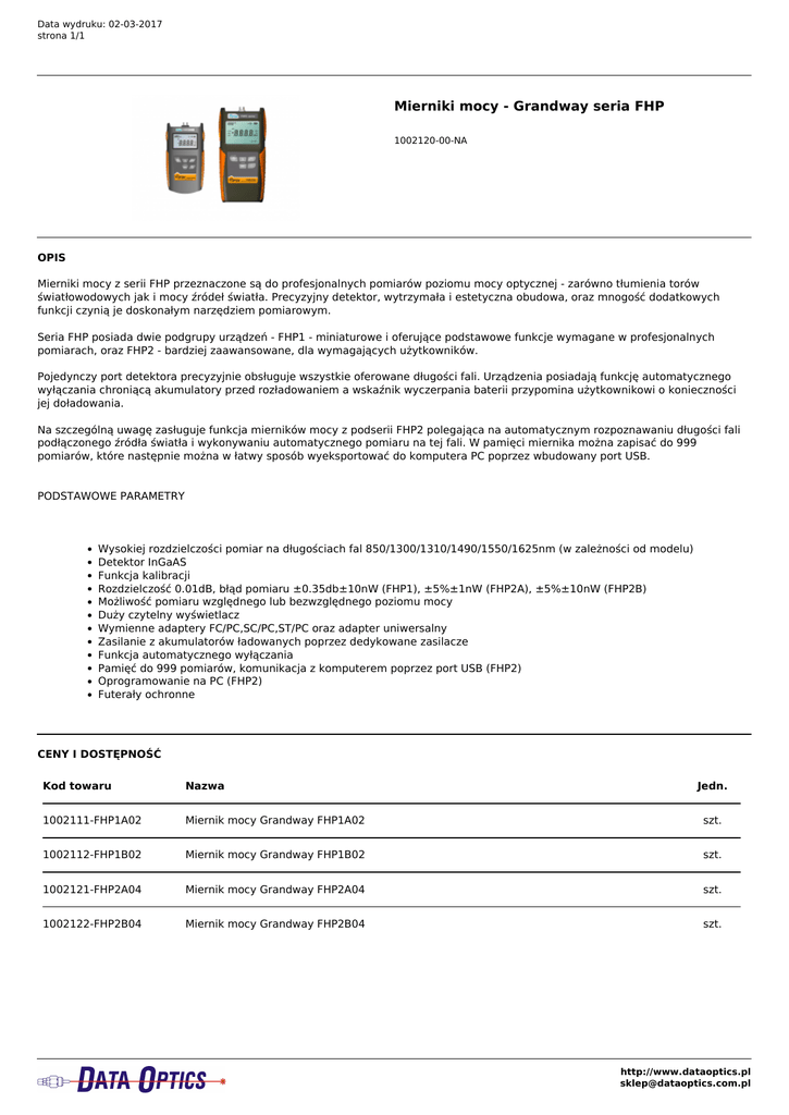 Data wydruku: 02-03-2017 strona 1/1 Mierniki mocy - Grandway seria FHP 1002120-00-NA OPIS Mierniki mocy z serii FHP przeznaczone są do profesjonalnych pomiarów poziomu mocy optycznej - zarówno tłumienia torów światłowodowych jak i mocy źródeł światła. Precyzyjny detektor, wytrzymała i estetyczna obudowa, oraz mnogość dodatkowych funkcji czynią je doskonałym narzędziem pomiarowym. Seria FHP posiada dwie podgrupy urządzeń - FHP1 - miniaturowe i oferujące podstawowe funkcje wymagane w profesjonalnych pomiarach, oraz FHP2 - bardziej zaawansowane, dla wymagających użytkowników. Pojedynczy port detektora precyzyjnie obsługuje wszystkie oferowane długości fali. Urządzenia posiadają funkcję automatycznego wyłączania chroniącą akumulatory przed rozładowaniem a wskaźnik wyczerpania baterii przypomina użytkownikowi o konieczności jej doładowania. Na szczególną uwagę zasługuje funkcja mierników mocy z podserii FHP2 polegająca na automatycznym rozpoznawaniu długości fali podłączonego źródła światła i wykonywaniu automatycznego pomiaru na tej fali. W pamięci miernika można zapisać do 999 pomiarów, które następnie można w łatwy sposób wyeksportować do komputera PC poprzez wbudowany port USB. PODSTAWOWE PARAMETRY Wysokiej rozdzielczości pomiar na długościach fal 850/1300/1310/1490/1550/1625nm (w zależności od modelu) Detektor InGaAS Funkcja kalibracji Rozdzielczość 0.01dB, błąd pomiaru ±0.35db±10nW (FHP1), ±5%±1nW (FHP2A), ±5%±10nW (FHP2B) Możliwość pomiaru względnego lub bezwzględnego poziomu mocy Duży czytelny wyświetlacz Wymienne adaptery FC/PC,SC/PC,ST/PC oraz adapter uniwersalny Zasilanie z akumulatorów ładowanych poprzez dedykowane zasilacze Funkcja automatycznego wyłączania Pamięć do 999 pomiarów, komunikacja z komputerem poprzez port USB (FHP2) Oprogramowanie na PC (FHP2) Futerały ochronne CENY I DOSTĘPNOŚĆ Kod towaru Nazwa Jedn. 1002111-FHP1A02 Miernik mocy Grandway FHP1A02 szt. 1002112-FHP1B02 Miernik mocy Grandway FHP1B02 szt. 1002121-FHP2A04 Miernik mocy Grandway FHP2A04 szt. 1002122-FHP2B04 Miernik mocy Grandway FHP2B04 szt. http://www.dataoptics.pl [email protected] Powered by TCPDF (www.tcpdf.org)