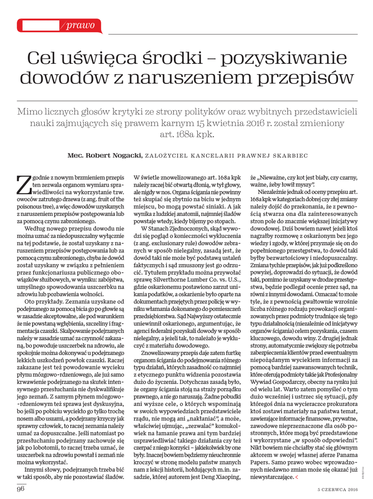 przedsiębiorczość prawo Cel uświęca środki – pozyskiwanie dowodów z naruszeniem przepisów Mimo licznych głosów krytyki ze strony polityków oraz wybitnych przedstawicieli nauki zajmujących się prawem karnym 15 kwietnia 2016 r. został zmieniony art. 168a kpk. Z godnie z nowym brzmieniem przepis ten zezwala organom wymiaru sprawiedliwości na wykorzystanie tzw. owoców zatrutego drzewa (z ang. fruit of the poisonous tree), a więc dowodów uzyskanych z naruszeniem przepisów postępowania lub za pomocą czynu zabronionego. Według nowego przepisu dowodu nie można uznać za niedopuszczalny wyłącznie na tej podstawie, że został uzyskany z naruszeniem przepisów postępowania lub za pomocą czynu zabronionego, chyba że dowód został uzyskany w związku z pełnieniem przez funkcjonariusza publicznego obowiązków służbowych, w wyniku: zabójstwa, umyślnego spowodowania uszczerbku na zdrowiu lub pozbawienia wolności. Oto przykłady. Zeznania uzyskane od podejrzanego za pomocą bicia go po głowie są w zasadzie akceptowalne, ale pod warunkiem że nie powstaną wgłębienia, szczeliny i fragmentacja czaszki. Skalpowanie podejrzanych należy w zasadzie uznać za czynność zakazaną, bo powoduje uszczerbek na zdrowiu, ale spokojnie można dokonywać u podejrzanego lekkich uszkodzeń powłok czaszki. Raczej zakazane jest też powodowanie wycieku płynu mózgowo-rdzeniowego, ale już samo krwawienie podejrzanego na skutek intensywnego przesłuchania nie dyskwalifikuje jego zeznań. Z samym płynem mózgowo-rdzeniowym też sprawa jest dyskusyjna, bo jeśli po pobiciu wyciekło go tylko trochę nosem albo uszami, a podejrzany krzyczy jak sprawny człowiek, to raczej zeznania należy uznać za dopuszczalne. Jeśli natomiast po przesłuchaniu podejrzany zachowuje się jak po lobotomii, to raczej trzeba uznać, że uszczerbek na zdrowiu powstał i zeznań nie można wykorzystać. Innymi słowy, podejrzanych trzeba bić w taki sposób, aby nie pozostawiać śladów. 96 z a ł o ż yc i e l K a nc e l a r i i P r aw n e j S k a r b i e c W świetle znowelizowanego art. 168a kpk należy raczej bić otwartą dłonią, w tył głowy, ale nigdy w nos. Organa ścigania nie powinny też skupiać się zbytnio na biciu w jednym miejscu, bo mogą powstać siniaki. A jak wynika z ludzkiej anatomii, najmniej śladów powstaje wtedy, kiedy bijemy po stopach. W Stanach Zjednoczonych, skąd wywodzi się pogląd o konieczności wykluczenia (z ang. exclusionary rule) dowodów zebranych w sposób nielegalny, zasadą jest, że dowód taki nie może być podstawą ustaleń faktycznych i sąd zmuszony jest go odrzucić. Tytułem przykładu można przywołać sprawę Silverthorne Lumber Co. vs. U.S., gdzie oskarżonemu postawiono zarzut unikania podatków, a oskarżenie było oparte na dokumentach przejętych przez policję w wyniku włamania dokonanego do pomieszczeń przedsiębiorstwa. Sąd Najwyższy ostatecznie uniewinnił oskarżonego, argumentując, że agenci federalni pozyskali dowody w sposób nielegalny, a jeżeli tak, to należało je wykluczyć z materiału dowodowego. Znowelizowany przepis daje zatem furtkę organom ścigania do podejmowania różnego typu działań, których zasadność co najmniej z etycznego punktu widzenia pozostawia dużo do życzenia. Dotychczas zasadą było, że organy ścigania stoją na straży porządku prawnego, a nie go naruszają. Żadne pobudki ani wyższe cele, o których wspominają w swoich wypowiedziach przedstawiciele rządu, nie mogą ani „nakłaniać”, a może, właściwiej ujmując, „zezwalać” komukolwiek na łamanie prawa ani tym bardziej usprawiedliwiać takiego działania czy też czerpać z niego korzyści – jakiekolwiek by one były. Inaczej bowiem będziemy nieuchronnie kroczyć w stronę modelu państw znanych nam z lekcji historii, hołdujących m.in. zasadzie, której autorem jest Deng Xiaoping, że „Nieważne, czy kot jest biały, czy czarny, ważne, żeby łowił myszy”. Niezależnie jednak od oceny przepisu art. 168a kpk w kategoriach dobrej czy złej zmiany należy dojść do przekonania, że z pewnością stwarza ona dla zainteresowanych stron pole do znacznie większej inicjatywy dowodowej. Dziś bowiem nawet jeżeli ktoś nagrałby rozmowę z oskarżonym bez jego wiedzy i zgody, w której przyznaje się on do popełnionego przestępstwa, to dowód taki byłby bezwartościowy i niedopuszczalny. Zmiana tychże przepisów, jak już podkreślono powyżej, doprowadzi do sytuacji, że dowód taki, pomimo że uzyskany w drodze przestępstwa, będzie podlegał ocenie przez sąd, na równi z innymi dowodami. Oznaczać to może tyle, że z pewnością gwałtownie wzrośnie liczba różnego rodzaju prowokacji organizowanych przez podmioty trudniące się tego typu działalnością (niezależnie od inicjatywy organów ścigania) celem pozyskania, czasem kluczowego, dowodu winy. Z drugiej jednak strony, automatycznie zwiększy się potrzeba zabezpieczenia klientów przed ewentualnym niepożądanym wyciekiem informacji za pomocą bardziej zaawansowanych technik, które oferują podmioty takie jak Profesjonalny Wywiad Gospodarczy, obecny na rynku już od wielu lat. Warto zatem pomyśleć o tym dużo wcześniej i ustrzec się sytuacji, gdy któregoś dnia na wycieraczce prokuratora ktoś zostawi materiały na państwa temat, zawierające informacje finansowe, prywatne, zawodowe nieprzeznaczone dla osób postronnych, które mogą być przedstawione i wykorzystane „w sposób odpowiedni”. Nikt bowiem nie chciałby stać się głównym aktorem w swojej własnej aferze Panama Papers. Samo prawo wobec wprowadzonych niedawno zmian może się okazać już niewystarczające. g 5 c z e rwca 2016 z djęc ia : Mec. Robert Nogacki,