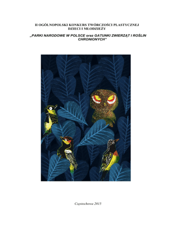 II OGÓLNOPOLSKI KONKURS TWÓRCZOŚCI PLASTYCZNEJ DZIECI I MŁODZIEŻY „PARKI NARODOWE W POLSCE oraz GATUNKI ZWIERZĄT I ROŚLIN CHRONIONYCH” Częstochowa 2015 REGULAMIN KONKURSU 1/ Organizator: Miejski Dom Kultury w Częstochowie 2/ Cel konkursu: prezentacja możliwości twórczych dzieci i młodzieży w dziedzinie plastyki, zachęcanie do aktywnej formy spędzania wolnego czasu - wycieczki do parków narodowych w celu poznania ich fauny i flory, rozwijanie umiejętności rozpoznawania gatunków roślin i zwierząt będących pod ochroną, wzbudzenie zainteresowania dzieci i młodzieży ekologią, rozwijanie wrażliwości estetycznej, rozwijanie umiejętności obserwacji i przenoszenie zaobserwowanych zjawisk na język sztuki, popularyzacja wiedzy na temat Parków Narodowych w Polsce, wymiana doświadczeń i poszerzanie wiedzy z zakresu różnych technik plastycznych. 3/ Uczestnicy: dzieci i młodzież w wieku od 6 do 21 lat. 4/ Warunki konkursu: format prac dowolny - lecz nie większy niż 100 x 70cm, technika dowolna – z wyjątkiem materiałów nietrwałych i sypkich, typu : ryż, cukier, kasze, plastelina itp., ilość prac nadesłanych - maksymalnie do 10 prac z danej placówki, każdy uczestnik konkursu może nadesłać tylko jedną pracę, prace niezgodne z regulaminem oraz nadesłane po terminie, nie będą kwalifikowane do konkursu, prace nadesłane na konkurs muszą być opisane na odwrocie: /imię i nazwisko autora, wiek, dokładny adres szkoły lub placówki ewentualnie adres zamieszkania/. Dodatkowo prosimy o podanie tematu pracy np. : „Kampinowski Park Narodowy” lub „Zwierzę chronione w Polsce – żubr” 5/ Termin nadsyłania prac plastycznych : Prace wykonane zgodnie z wymogami regulaminu należy przekazać lub przesłać w opakowaniu zapewniającym bezpieczne dotarcie przesyłki, do dnia 30 XI 2014 roku na adres: Miejski Dom Kultury ul. Łukasińskiego 50/68 42- 207 Częstochowa Na opakowaniu należy podać nazwę konkursu. 6/ Ocena prac: Komisja dokona oceny prac plastycznych, przyznając nagrody i kwalifikując prace na wystawę w następujących kategoriach wiekowych: od 6 - 11 lat, od 12 – 15 lat, od 16 – 21 lat 7/ Ogłoszenie wyników: Wyniki konkursu, termin wręczenia nagród oraz miejsce wystawy pokonkursowej zostaną zamieszczone na stronach internetowych MDK: www.mdk.czest.pl do dnia 28 II 2015 roku. 8/ Uwagi: Organizatorzy konkursu zastrzegają sobie prawo publikowania i reprodukowania prac konkursowych bez wypłacania honorariów autorskich. Przysłane prace przechodzą na własność organizatorów. Prac nie wolno rolować i składać. Informacje o konkursie można uzyskać telefonicznie: Miejski Dom Kultury w Częstochowie, ul. Łukasińskiego 50/68 tel./fax 34 3231279, za pomocą e-mail: [email protected] .lub strony internetowej http://www.mdk.czest.pl ZAPRASZAMY DO UDZIAŁU W KONKURSIE PLASTYCZNYM pt.: „PARKI NARODOWE W POLSCE oraz GATUNKI ZWIERZĄT I ROŚLIN CHRONIONYCH”.