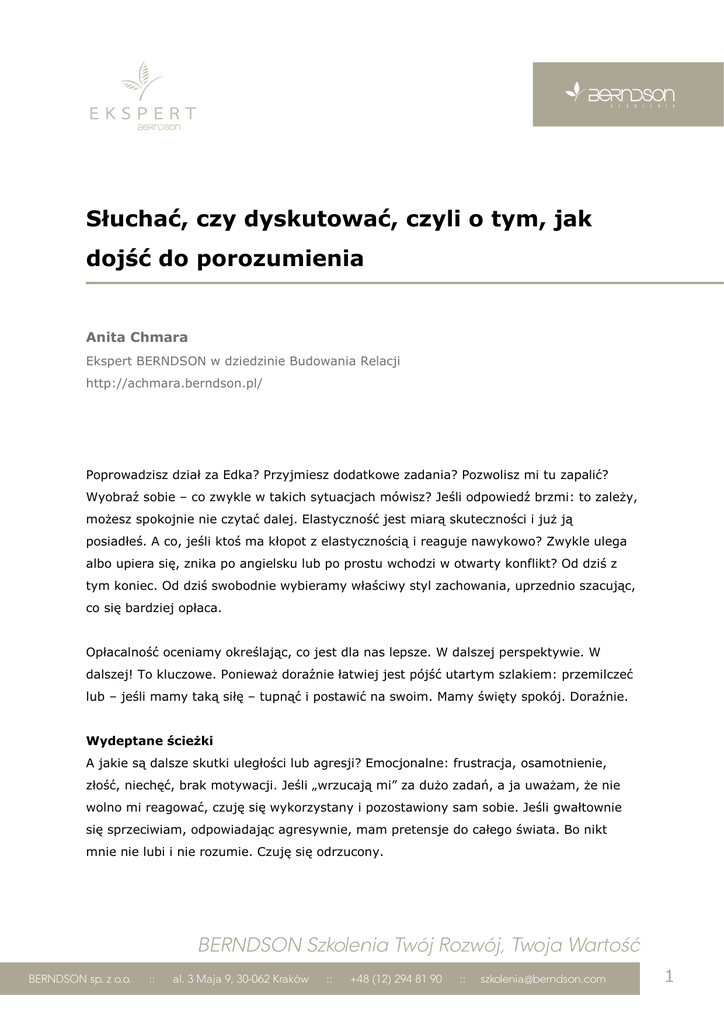 Słuchać, czy dyskutować, czyli o tym, jak dojść do porozumienia Anita Chmara Ekspert BERNDSON w dziedzinie Budowania Relacji http://achmara.berndson.pl/ Poprowadzisz dział za Edka? Przyjmiesz dodatkowe zadania? Pozwolisz mi tu zapalić? Wyobraź sobie – co zwykle w takich sytuacjach mówisz? Jeśli odpowiedź brzmi: to zaleŜy, moŜesz spokojnie nie czytać dalej. Elastyczność jest miarą skuteczności i juŜ ją posiadłeś. A co, jeśli ktoś ma kłopot z elastycznością i reaguje nawykowo? Zwykle ulega albo upiera się, znika po angielsku lub po prostu wchodzi w otwarty konflikt? Od dziś z tym koniec. Od dziś swobodnie wybieramy właściwy styl zachowania, uprzednio szacując, co się bardziej opłaca. Opłacalność oceniamy określając, co jest dla nas lepsze. W dalszej perspektywie. W dalszej! To kluczowe. PoniewaŜ doraźnie łatwiej jest pójść utartym szlakiem: przemilczeć lub – jeśli mamy taką siłę – tupnąć i postawić na swoim. Mamy święty spokój. Doraźnie. Wydeptane ścieŜki A jakie są dalsze skutki uległości lub agresji? Emocjonalne: frustracja, osamotnienie, złość, niechęć, brak motywacji. Jeśli „wrzucają mi” za duŜo zadań, a ja uwaŜam, Ŝe nie wolno mi reagować, czuję się wykorzystany i pozostawiony sam sobie. Jeśli gwałtownie się sprzeciwiam, odpowiadając agresywnie, mam pretensje do całego świata. Bo nikt mnie nie lubi i nie rozumie. Czuję się odrzucony. 1 Zarówno uległość, jak i agresja wiąŜą się z takimi kosztami emocjonalnymi, których świadomie na pewno nikt sobie nie Ŝyczy. Nie mówiąc juŜ o kosztach klinicznych! Ciekawe wyniki badań opisali Joanna Kinas-Budzisz i Rodryg Rameau (Współczesna Onkologia 3/2002). Przebadano 130 pacjentów zakwalifikowanych do chemioterapii. Wykorzystano ankiety i testy oraz rozmowy z psychologiami. Okazało się, Ŝe aŜ 103 osoby spośród badanych przejawiały brak asertywności! Z tego 80 osób preferowało styl uległy. O jednym trzeba pamiętać: czym tak naprawdę jest dobrze pojęta asertywność. Wiele osób na to pytanie odpowiada: „sztuka mówienia nie”. Ale asertywność to znacznie więcej. To umiejętność proszenia ludzi o przysługę i zgoda na to, Ŝe mogą odmówić. To umiejętność krytykowania i przyjmowania krytyki. To zdolność chwalenia i przyjmowania pochwał. To swoboda wyboru – czy chcę się zachować asertywnie, czy teŜ tym razem opłaca mi się zachować inaczej! I wreszcie – to umiejętne prowadzenie dyskusji, jeśli wybieram konfrontację. MoŜliwości na mapie Jest 8.30 rano, mamy juŜ fantastycznie zaplanowany dzień. Jesteśmy z siebie dumni, poniewaŜ udało nam się dokonać niemoŜliwego: upchnąć w nasz plan dnia zadania tak, Ŝe zostaniemy w pracy tylko pół godziny dłuŜej. I wtedy właśnie przychodzi szef, rzucając od niechcenia: „Proszę przygotować mi raport dla klienta. Tak… na dwunastą”. Co robimy? To zaleŜy. Najlepiej pokazać pisemnie sporządzony plan dnia i powiedzieć: „Oczywiście, szefie! To są moje zadania na dziś. Jeśli raport jest waŜny, to wykonam go od razu… A co robimy z tym wcześniej zaplanowanymi zadaniami?”. Szefowie, jak to ludzie, są róŜni – lepsi i gorsi. Gorsi mogą powiedzieć: „A co mnie to obchodzi, proszę sobie radzić”. Lepsi zaczną współpracować – delegują zadanie komuś innemu, przydzielą nam osobę do pomocy itd. W kaŜdym razie zainteresują się. Współpraca, a więc zaproszenie do wspólnego przyjrzenia się sprawie, zakłada, Ŝe interesy obu stron są tak samo waŜne. Szukamy więc takiego rozwiązania, które będzie korzystne dla wszystkich. To najlepszy sposób rozwiązywania sytuacji trudnych – jednak nie zawsze moŜliwy. Po pierwsze wymaga chęci współdziałania z drugiej strony. Po drugie wymaga czasu, którego moŜe w niektórych sytuacjach brakować. 2 Mamy więc do wyboru inne style zachowań: kompromis, rywalizacja, uleganie, unikanie. Kompromis, wbrew dość powszechnej opinii, nie jest wcale rozwiązaniem idealnym. Zakłada, Ŝe kaŜda ze stron ustępuje. Zatem kaŜda coś zyskuje, ale teŜ kaŜda traci. Gdy zapytamy strony, czy są zadowolone, odpowiedzą: „nie”. W naszym przypadku kompromisem byłoby, gdyby pracownik przygotował część raportu i został półtorej godziny dłuŜej niŜ planował, natomiast do drugiej części szef musiałby znaleźć inną osobę. Jeśli kaŜdy będzie chciał postawić na swoim, mamy klasyczną rywalizację. Na jej drugim biegunie znajduje się uległość. Jedna strona wygrywa, druga przegrywa. Rywalizacyjnie postępuje szef, który mówi, Ŝe „ma być”. Rywalizacyjnie moŜe postąpić pracownik twierdząc, Ŝe „nie będzie”. Zawsze pozostaje kwestia opłacalności. Czasem lepiej się uprzeć, czasem ulec. NajwaŜniejsze jest to, Ŝe są sytuacje, gdy uleganie i rywalizacja bywają opłacalne. Dość interesujące jest unikanie. W przypadku naszego raportu potrzebnego do dwunastej byłaby to taka sytuacja, gdy pracownik – słysząc kroki szefa – rzuca się do ucieczki, chowając się na przykład w pokoju obok. A szef znajduje innego kozła ofiarnego. Taka strategia, choć skuteczna, działa doraźnie i jednorazowo. Okazuje się, Ŝe kaŜdy z nas ma swój ulubiony sposób reagowania na trudne sytuacje. MoŜna go określić za pomocą specjalnych kwestionariuszy (np. test Thomasa Kilmanna). Po to, by – znając preferencje – obserwować uwaŜnie swoje reakcje. Jeśli najczęściej unikam sytuacji trudnych, to jakie ma to dla mnie konsekwencje w dalszej perspektywie? Czy to mi się opłaca? Co się dzieje, jeśli w znakomitej większości sytuacji idę na kompromis lub podejmuję rywalizację? Jak byłoby lepiej postąpić teraz? KaŜda droga dobra, ale… śaden styl nie jest dobry, jeśli jest stosowany automatycznie. Współpracować powinniśmy zawsze, gdy waga sprawy jest wielka i zaleŜy nam na relacjach. Poświęcamy co prawda duŜo czasu, ale wypracow