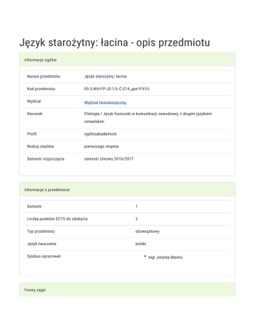 Język starożytny: łacina - opis przedmiotu Informacje ogólne Nazwa przedmiotu Język starożytny: łacina Kod przedmiotu 09.5-WH-FP-JS-1/Ł-Ć-S14_gen1F41U Wydział Wydział Humanistyczny Kierunek Filologia / Język francuski w komunikacji zawodowej, z drugim językiem romańskim Profil ogólnoakademicki Rodzaj studiów pierwszego stopnia Semestr rozpoczęcia semestr zimowy 2016/2017 Informacje o przedmiocie Semestr 1 Liczba punktów ECTS do zdobycia 2 Typ przedmiotu obowiązkowy Język nauczania polski Sylabus opracował Formy zajęć mgr Jolanta Macko Forma Liczba godzin w Liczba godzin w Liczba godzin w Liczba godzin w Forma zajęć semestrze tygodniu semestrze tygodniu zaliczenia (stacjonarne) (stacjonarne) (niestacjonarne) (niestacjonarne) 30 2 - - Ćwiczenia Zaliczenie na ocenę Cel przedmiotu 1. Poznanie języka łacińskiego na poziomie podstawowym, umożliwiającym rozumienie i tłumaczenie tekstów adaptowanych. 2. Opanowanie słownictwa, które ułatwia naukę języków obcych 3. Poznanie kultury antycznej stanowiącej trwałą wartość w rozwoju kultury polskiej i europejskiej 4. Cytowanie sentencji, zwrotów, powiedzeń łacińskich spotykanych w literaturze, sztuce, kulturze, a nawet w języku potocznym. Wymagania wstępne Brak. Zakres tematyczny 1. Podstawy gramatyki łacińskiej - czasy, deklinacje, zaimki, konstrukcje zdaniowe. 2. Słownictwo z tłumaczonych tekstów, ukazanie wpływu łaciny na język polski i języki obce oraz rozumienie słów pochodzenia łacińskiego. 3. Zwroty, sentencje, powiedzenia łacińskie cytowane w literaturze, nauce, kulturze oraz wyrażenia funkcjonujące w językach nowożytnych 4. Wiadomości z życia starożytnych Greków i Rzymian, z historii, filozofii i literatury oraz elementy mitologii. 5. Dobór tekstów zgodny z poziomem grupy i materiałem gramatycznym. Metody kształcenia Ćwiczenia gramatyczne i tłumaczeniowe z nauczycielem, praca samodzielna studenta oraz zespołowa. Przygotowanie słówek i tłumaczenie tekstu. Wystąpienia i prezentacje (na temat kultury antycznej). Efekty kształcenia i metody weryfikacji osiągania efektów kształcenia Opis efektu Symbole efektów Metody weryfikacji Student powinien poprawnie czytać po łacinie, KN1_W06 aktywność opanować język łaciński w stopniu umożliwiającym KN1_W08 w trakcie tłumaczenie tekstów z użyciem słownika i zajęć podręcznika gramatyki, znać podstawowe kolokwium zagadnienia z historii, literatury i kultury starożytnej referat Forma zajęć Ćwiczenia Grecji i Rzymu. Student powinien poprawnie stosować i rozumieć popularne zwroty i sentencje łacińskie. Student powinien mieć świadomość roli i znaczenia języka łacińskiego w nauce i kulturze europejskiej, wykorzystując znajomość języka łacińskiego do rozumienia zjawisk językowych w języku polskim i innych językach nowożytnych. Warunki zaliczenia Zaliczenie z oceną na podstawie bieżącej kontroli ustnej i pisemnej (kilka razy w semestrze). Obecność i aktywność studenta na zajęciach. Uzyskanie minimum 60% z testów sprawdzających. Obciążenie pracą Obciążenie pracą Studia Studia niestacjonarne stacjonarne (w godz.) (w godz.) Godziny kontaktowe (udział w zajęciach; konsultacjach; egzaminie, itp.) 30 - Samodzielna praca studenta (przygotowanie do: zajęć, kolokwium, 20 - egzaminu; studiowanie literatury przygotowanie: pracy pisemnej, projektu, prezentacji, raportu, wystąpienia; itp.) Łącznie 50 - Punkty ECTS Studia Studia niestacjonarne stacjonarne Zajęcia z udziałem nauczyciela akademickiego 1 - Zajęcia bez udziału nauczyciela akademickiego 1 - Łącznie 2 - Literatura podstawowa 1. O.Krajczyk, D.Kubica „Prima via”- podręcznik, gramatyka, słownik Wrocław 2012 2. S.Wilczyński, E.Pobiedzińska, A.Jaworska - „Porta Latina” –podręcznik do języka łacińskiego Warszawa 2005 3. S.Wilczyński, T.Zarych „Rudimenta Latinitatis” cz.1,Wrocław 1998 Literatura uzupełniająca 1. S.Kalinkowski „Aurea dicta”- łacińskie sentencje, przysłowia i powiedzenia.t.1-2 Warszawa 1993 2. Z.Landowski, K.Woś, Słownik cytatów łacińskich Kraków 2002 3. J.Parandowski, Mitologia ,Wierzenia i podania Greków i Rzymian Poznań 1987 4. Thesaurus albo skarbiec łacińskich sentencji , przysłów i powiedzeń w literaturze polskiej, red.M.Korolko Warszawa 2004 Uwagi Zmodyfikowane przez dr Witold Kowalski (ostatnia modyfikacja: 11-09-2016 18:23)