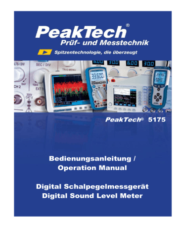 PeakTech® 5175 Bedienungsanleitung / Operation Manual Digital Schalpegelmessgerät Digital Sound Level Meter 1. Sicherheitshinweise zum Betrieb des Gerätes Dieses Gerät erfüllt die EU-Bestimmungen (elektromagnetische Kompatibilität. 2004/108/EG Vor Inbetriebnahme des Gerätes Bedienungsanleitung sorgfältig lesen. Nachfolgend aufgeführte Sicherheitshinweise zum Betrieb des Gerätes sind unbedingt zu beachten. Schäden, die durch Nichtbeachtung dieser Hinweise entstehen, sind von Ansprüchen jeglicher Art ausgeschlossen: * * * * * * * * * * * * * Warnhinweise am Gerät unbedingt beachten. Gerät keinen extremen Temperaturen, direkter Sonneneinstrahlung, extremer Luftfeuchtigkeit oder Nässe aussetzen. Starke Erschütterungen vermeiden Gerät nicht in der Nähe starker magnetischer Felder (Motoren, Transformatoren usw.) betreiben Heiße Lötpistolen aus der unmittelbaren Nähe des Gerätes fernhalten Vor Aufnahme des Messbetriebes sollte das Gerät auf die Umgebungstemperatur stabilisiert sein (wichtig beim Transport von kalten in warme Räume und umgekehrt) Ersetzen Sie die Batterie, sobald das Batteriesymbol "BAT" leuchtet. Mangelnde Batteriespannung kann unpräzise Messergebnisse hervorrufen. Sollten Sie das Gerät für einen längeren Zeitraum nicht benutzen, entnehmen Sie die Batterie aus dem Batteriefach. Säubern Sie das Gehäuse regelmäßig mit einem feuchten Stofftuch und einem milden Reinigungsmittel. Benutzen Sie keine ätzenden Scheuermittel. Nehmen Sie das Gerät nie in Betrieb, wenn es nicht völlig geschlossen ist. Vermeiden Sie jegliche Nähe zu explosiven und entflammbaren Stoffen. keine technischen Veränderungen am Gerät vornehmen Öffnen des Gerätes und Wartungs- und Reparaturarbeiten dürfen nur von qualifizierten Service-Technikern durchgeführt werden Messgeräte gehören nicht in Kinderhände ! -1- Reinigung des Gerätes Gerät nur mit einem feuchten, fusselfreien Tuch reinigen. Nur handelsübliche Spülmittel verwenden. Beim Reinigen unbedingt darauf achten, dass keine Flüssigkeit in das Innere des Gerätes gelangt. Dies könnte zu einem Kurzschluss und zur Zerstörung des Gerätes führen. Einführung Dieser kompakte Schallpegelmesser ist für die Messung von Schallquellen in Dezibel nach A-Bewertung (dBA) ausgelegt, welche dem menschlichen Gehör nachempfunden ist. 2. Technische Merkmale ► ► ► ► ► ► ► ► 3 1/2-stellige 10mm LCD-Anzeige (max. 1999) Automatische Hintergrundbeleuchtung Schnelle (fast) und langsame (slow) Messfolge Schallpegelbewertung nach dBA Maximalwertanzeige Minimalweranzeige Robustes und handliches Gehäusedesign IEC651 Type 2 & ANSI S1.4 Type 2 geeignet -2- 3. Technische Daten Anzeige LCD-Anzeige mit automatischer Hintergrundbeleuchtung Messbereich 30 dB bis 130 dB Bewertung dBA Frequenzbereich 31.5 Hz … 8.5 kHz Linearität 50 dB Messfolge Fast (125 ms) Slow (1 s) Genauigkeit +/- 1.5 dB Mikrofon ½ Zoll – Elektret Kondensator-Mikrofon Selbstkalibrierung 10 Sek. (jedes Einschalten) Batteriezustandsanzeige Batteriesymbol “ “ wird bei ungenügender Batteriespannung im Display angezeigt Abschaltautomatik Aus / Nach 10 Minuten Spannungsversorgung 9V Batterie, 6F22 oder equivalent Betriebstemperatur 0°C ~ 40°C; 10 … 80% RH Lagertemperatur -10°C ~ 60°C; 10 … 70% RH Abmessungen (BxHxT) 55 x 135 x 35mm Gewicht: 120g -3- 4. Bedienelemente und Anschlüsse am Gerät 1 2 4 3 7 8 6 5 1. 2. 3. 4. 5. 6. 7. 8. Windschutz / Mikrofon ON - Einschalter Fast/Slow Umschalter MAX/MIN Umschalter Helligkeitssensor Messwertanzeige Batteriefach (Rückseite) Gewinde für Stativ (Rückseite) -4- 4.1 Anzeigesymbole FAST SLOW OVER MAX MIN dBA Das Symbol zeigt den Batterieladezustand an. Eine leere Batterie muss baldmöglichst ausgetauscht werden und beeinflusst das Messergebnis Schnelle Messfolge Langsame Messfolge Überbereichsanzeige Anzeige erneuert sich nur bei neuem Maximalwert Anzeige erneuert sich nur bei neuem Minimalwert Automatische Abschaltung deaktiviert Messeinheit – Dezibel in A-Bewertung 5. Bedienung 1. Drücken Sie die einzuschalten. Taste “ON” einmal, um das Gerät 2. Wählen Sie die Messoptionen über die Wahltasten an der Geräteseite. Die vier möglichen Funktion sind: Funktion Fast Slow Max Min Bechreibung Schnelle Zeitbewertung mit 125 ms, welche auch kurzzeitige Schallspitzen anzeigt Langsame Zeitbewertung mit 1 Sekunde, welche einen Mittelwert des Schallpegels über die Sekunde anzeigt. Geeignet für schwankende Messwerte Maximalwertfunktion Minimalwertfunktion -5- 6. Messbetrieb Allgemein: 1. Schalten Sie das Gerät über die ON-Taste (2) ein. 2. Drücken Sie die „FAST/SLOW“-Taste (3), um die gewünschte Zeitbewertung umzuschalten. 3. Drücken Sie die „MAX/MIN“-Taste (4), um in den MaximalwertModus umzuschalten. Die Messanzeige erneuert sich nun nur noch, wenn der aktuelle Messwert den höchsten vorausgehenden Messwert übersteigt. 4. Drücken Sie die „MAX/MIN“-Taste (4) erneut, um in den Minimalwert-Modus umzuschalten. Die Messanzeige erneuert sich nun nur noch, wenn der aktuelle Messwert kleiner ist, als der geringste vorausgehende Messwert 5. Drücken Sie die Taste (4) erneut, um wieder in den normalen Messmodus umzuschalten. Abschaltautomatik Wenn das Gerät nicht mehr verwendet wird, schaltet es sich automatisch nach 10 Minuten aus. Für Dauermessungen kann die automatische Abschaltung deaktiviert werden: 1. Schalten Sie das Gerät ggf. über die ON-Taste (2) aus. 2. Schalten Sie das Gerät über die ON-Taste (2) wieder ein, halten Sie die Taste dabei ca. 5 Sekunden gedrückt. 3. Für eine Sekunde erscheint in der Anzeige das Symbol. 4. Lassen Sie die ON-Taste (2) los und schalten das Gerät erneut aus. 5. Beim nächsten Einschalten, ist die automatische Abschaltung deaktiviert und das Symbol wird in der Anzeige dargestellt. Hintergrundbeleuchtung Dieses Gerät verfügt über eine automatische Hintergrundbeleuchtung, welche sich aktiviert, wenn der Helligkeitssensor auf der Frontplatte s