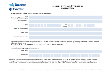WNIOSEK O WYPŁATĘ ŚWIADCZENIA POLISA OPTIMA DANE OSOBY NA RZECZ, KTÓREJ WYKONANO ŚWIADCZENIA: nazwa Pracodawcy/Ubezpieczającego UBEZPIECZONY PESEL data urodzenia - - adres do korespondencji adres e-mail nr telefonu komórkowego Zgodnie z Ogólnymi warunkami Ubezpieczenia POLISA OPTIMA „wniosek o wypłatę świadczenia” powinien być przysłany do Polmed SA w ciągu 30 dni od wykonania usługi na adres: Polmed S.A., Os. Kopernika 21, 8383-200 Starogard Gdański z dopiskiem „POLISA OPTIMA” NaleŜne świadczenie proszę przesłać na rachunek: nazwa Banku nr rachunku Niniejszym wyraŜam pisemną zgodę na uzyskiwanie przez Towarzystwo Ubezpieczeń ZDROWIE S.A. w pełnym zakresie informacji o okolicznościach związanych z ustaleniem prawa do świadczenia z zawartej umowy ubezpieczenia i wysokością tego świadczenia, zgodnie z art. 38.1. Ustawy z dnia 10 listopada 2015 r. o działalności ubezpieczeniowej i reasekuracyjnej (Dz.U. 2015 poz. 1844), w tym wszelkich informacji i dokumentacji dotyczących stanu Towarzystwo Ubezpieczeń ZDROWIE Spółka Akcyjna Kapitał zakładowy w wysokości 21 950 000 zł. opłacony w całości, Sąd Rejonowy Gdańsk-Północ w Gdańsku, VIII Wydział Gospodarczy, KRS 0000362027, NIP 5862257567, REGON 221064894; Siedziba: Siedziba 81-319 Gdynia, ul. Śląska 21, tel. 58 728 9 555, fax 58 585 80 50; Biura Handlowe: Handlowe 02-071 Warszawa, ul. Langiewicza 31, tel. 58 728 9 555; 40-859 Katowice, ul. Bocheńskiego 38A lok. 225, tel. 58 728 9 509; www.tuzdrowie.pl • www.polisalekowa.pl str. 1 WNIOSEK O WYPŁATĘ ŚWIADCZENIA POLISA OPTIMA mojego zdrowia oraz świadczeniach zdrowotnych z których korzystałem od kaŜdego lekarza, u którego leczyłem(am) się lub zasięgałem(am) porady medycznej, a takŜe we wszystkich placówkach medycznych, które udzielały mi usług medycznych. OPIS WYKONANEJ USŁUGI: lp. nazwa wykonanej usługi medycznej data wykonania usługi nazwa i adres placówki medycznej nr faktury /rachunku zapłacona kwota Do wniosku dołączam oryginały faktury/rachunku o numerze/ach: .................................................................................................................................................................... oraz kserokopie skierowania na badania (w przypadku wykonania badań diagnostycznych). Oświadczam, Ŝe wszystkie podane dobrowolnie dane zawarte w tym wniosku są prawdziwe i zgodne z moją najlepszą wiedzą. . podpis Ubezpieczonego lub opiekuna prawnego Towarzystwo Ubezpieczeń ZDROWIE Spółka Akcyjna Kapitał zakładowy w wysokości 21 950 000 zł. opłacony w całości, Sąd Rejonowy Gdańsk-Północ w Gdańsku, VIII Wydział Gospodarczy, KRS 0000362027, NIP 5862257567, REGON 221064894; Siedziba: Siedziba 81-319 Gdynia, ul. Śląska 21, tel. 58 728 9 555, fax 58 585 80 50; Biura Handlowe: Handlowe 02-071 Warszawa, ul. Langiewicza 31, tel. 58 728 9 555; 40-859 Katowice, ul. Bocheńskiego 38A lok. 225, tel. 58 728 9 509; www.tuzdrowie.pl • www.polisalekowa.pl str. 2