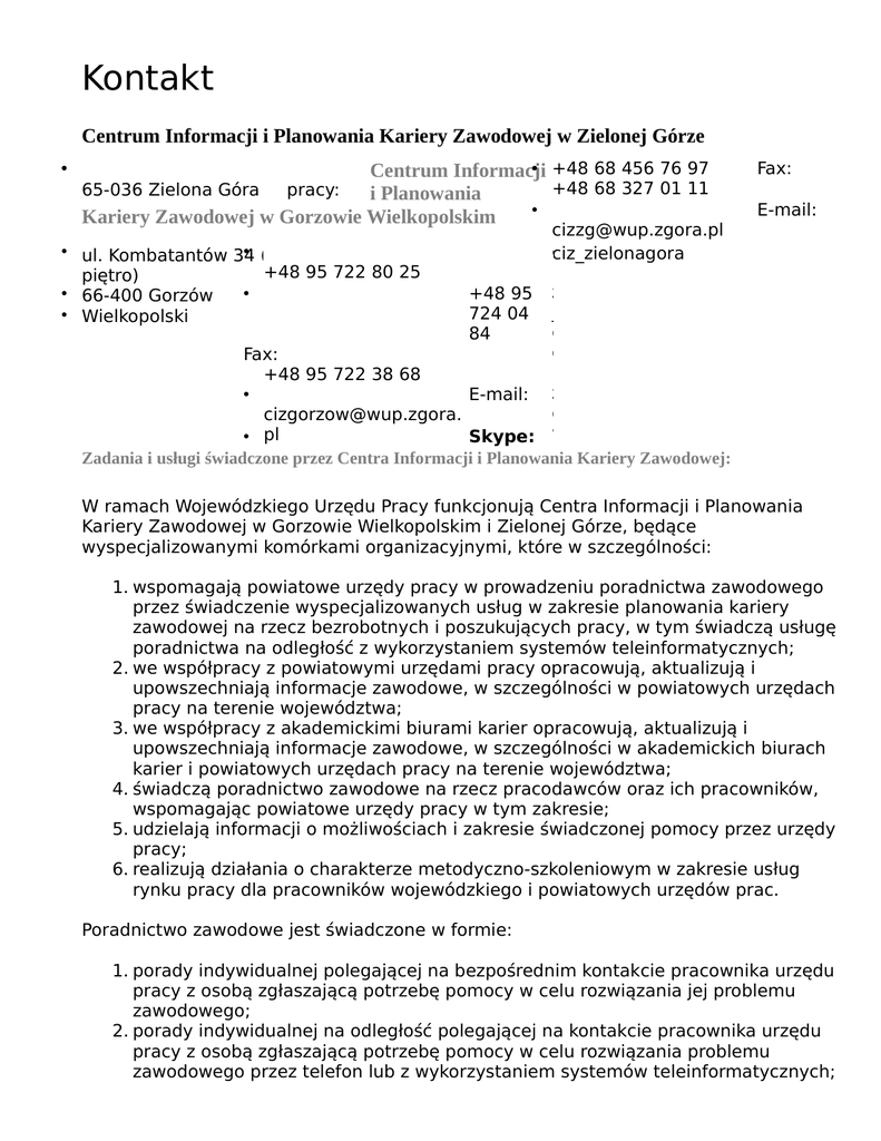 Kontakt - Wojewódzki Urząd Pracy w Zielonej Górze
