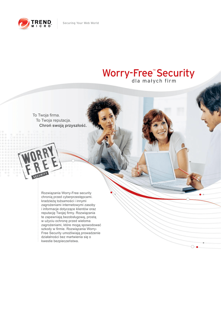 Securing Your Web World Worry-Free Security TM dla małych firm To Twoja firma. To Twoja reputacja. Chroń swoją przyszłość. Rozwiązania Worry-Free security chronią przed cyberprzestępcami. kradzieżą tożsamości i innymi zagrożeniami internetowymi zasoby i informacje dotyczące klientów oraz reputację Twojej firmy. Rozwiązania te zapewniają bezobsługową, prostą w użyciu ochronę przed wieloma zagrożeniami, które mogą spowodować szkody w firmie. Rozwiązania WorryFree Security umożliwiają prowadzenie działalności bez martwienia się o kwestie bezpieczeństwa. Trend Micro Securing your Web Zabezpiecz otwarte drzwi Tak jak wiele innych przedsiębiorstw, Twoja firma wykorzystuje Internet do tego, by zachować konkurencyjność i generować przychody, a także jako narzędzie do obsługi klientów. Internet otwiera drzwi do Twojej firmy. Zwiększa zdolność komunikowania się i umożliwia wzrost produktywności. Strony WWW i poczta e-mail, które są tak istotne dla działania firmy, stanowią dla niej również czynnik ryzyka. Brak barier sprawiający, że Internet jest wspaniałym miejscem do prowadzenia działalności gospodarczej powoduje, że sieć jest również idealną areną działań 1564% cyberprzestępców. Szkody finansowe, kradzież tożsamości, utrata poufnych informacji, spadki produktywności, kradzież zasobów sieciowych, obniżenie 1092% 645% reputacji firm i stopniowe niszczenie zaufania klientów wobec handlu elektro nicznego to tylko niektóre ze skutków zagrożeń internetowych. Właśnie dlatego zabezpieczenie danych handlu elektronicznego i prywatności klientów ma 247% 431% 161% kluczowe znaczenie dla zachowania reputacji firmy i jej prawidłowego działania. 2005 2006 Stosuj najnowocześniejsze rozwiązania Co oczywiste, oprogramowanie Worry-Free Security chroni dane klientów, produktywność firm i witryny transakcji internetowych przed konwencjonalnymi zagrożeniami, takimi jak wirusy, spam i phishing. Teraz pomaga również w obronie firmy przed najnowszymi zagrożeniami, takimi jak kradzież tożsamości, niebezpieczne witryny internetowe i ataki hakerów. Dodatkowo pozwala zwiększyć stopień ochrony i zmniejszyć obciążenie komputerów powodowane przez konwencjonalne rozwiązania z dziedziny zabezpieczeń. Na przykład, konwencjonalne rozwiązanie zabezpieczające oparte na pliku sygnatur spowalnia komputery PC, co wpływa na produktywność pracowników. Ta metoda nie nadąża za gwałtownie rosnącą liczbą zagrożeń internetowych. Teraz możesz wybrać bardziej inteligentną formę obrony w postaci oprogramowania Worry-Free Security obejmującego ochronę przed zagrożeniami internetowymi — ta forma ochrony jest oferowana tylko przez firmę Trend Micro. 2007 Zagrożenia internetowe: Wzrost liczby zagrożeń internetowych spowodowany jest wysokimi zyskami, jakie można osiągnąć z kradzieży tożsamości i zasobów firmowych. W 2008 roku spodziewany jest dalszy wzrost liczby zagrożeń internetowych. Zwiększ poziom ochrony dzięki globalnej „straży sąsiedzkiej” Ochrona przed zagrożeniami internetowymi stanowi wirtualną straż sąsiedzką — wykorzystuje ona wiele punktów obserwacyjnych i informuje innych o zagrożeniach, zapobiegając przedostaniu się ich do systemu. Ochrona przed zagrożeniami internetowymi wykorzystuje unikalną bazę danych reputacji witryn firmy Trend Micro do wychwytywania przypadków styczności z zagrożeniem wszystkich klientów na całym świecie — od użytkowników indywidualnych do największych korporacji. Każdy atak na pojedynczy komputer PC powoduje dodanie odpowiednich informacji do naszej bazy i pozwala na lepsze zrozumienie reputacji witryn, zachowania szkodliwego oprogramowania i źródeł spamu. Dzięki temu nasi specjaliści i rozwiązania technologiczne mogą chronić każdego kolejnego użytkownika przed tymi zagrożeniami i ich źródłami. • Każdego dnia firma Trend Micro skanuje pod kątem zagrożeń trzy do czterech miliardów witryn. • Każdego dnia chronimy klientów przed odwiedzeniem ośmiu do dziesięciu milionów zainfekowanych witryn. Cenione przez informatyków w małych firmach Worry-Free firmy Trend ” Rozwiązania Micro są łatwe w instalacji i obsłudze. Wszystko może być konfigurowane automatycznie. Korzystamy z ustawień, które pozwalają oprogramowaniu automatycznie monitorować i kontrolować zagrożenia. Steve Dunn ” Wiceprezes ds. Rozwiązań Technicznych i Dyrektor Generalny Arizpe Group, Inc. Trend Micro Securing your Web Worry-Free Business Security Rozwiązania Worry-Free Business Security chronią przed cyberprzestępcami, kradzieżą tożsamości i innymi zagrożeniami internetowymi zasoby, informacje dotyczące klientów oraz reputację firmy. Te rozwiązania są bardziej inteligentne funkcjonalne, a ponadto zapewniają zupełnie nową linię obrony, dzięki czemu możesz skupić się na prowadzeniu działalności. Bezpieczne Inteligentne Funkcjonalne Tylko firma Trend Micro oferuje unikalną ochronę przed zagrożeniami internetowymi, która zabezpiecza zasoby cyfrowe firmy przed powstającymi zagrożeniami, a tym samym strzeże reputacji klientów. Nasza technologia zabezpieczeń jest stale aktualizowana, nie przekłada się to jednak na zmniejszenie mocy obliczeniowej. Skomplikowane obliczenia mające na celu wykrywanie i blokowanie zagrożeń są prowadzone w centrum danych firmy Trend Micro, a nie w sieci klienta. Zabezpieczenia nie powinny przeszkadzać w prowadzeniu firmy, a jednocześnie być skuteczne. Oprogramowanie Worry-Free Business Security jest łatwe w obsłudze i może efektywnie blokować zagrożenia już istniejące oraz te, które powstaną w przyszłości. • Zapobieganie kontaktom z niebezpiecznymi witrynami. Zatrzymuje zagrożenia, zapewniając ochronę przed atakami w czasie rzeczywistym bez konieczności oczekiwania na najnowsze aktualizacje pliku sygnatur. • Zatrzymywanie spamu bez konieczności