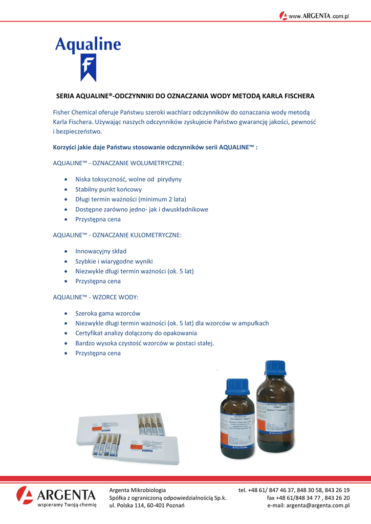 SERIA AQUALINE®-ODCZYNNIKI DO OZNACZANIA WODY METODĄ KARLA FISCHERA Fisher Chemical oferuje Państwu szeroki wachlarz odczynników do oznaczania wody metodą Karla Fischera. Używając naszych odczynników zyskujecie Państwo gwarancję jakości, pewność i bezpieczeństwo. Korzyści jakie daje Państwu stosowanie odczynników serii AQUALINE™ : AQUALINE™ - OZNACZANIE WOLUMETRYCZNE: Niska toksyczność, wolne od pirydyny Stabilny punkt końcowy Długi termin ważności (minimum 2 lata) Dostępne zarówno jedno- jak i dwuskładnikowe Przystępna cena AQUALINE™ - OZNACZANIE KULOMETRYCZNE: Innowacyjny skład Szybkie i wiarygodne wyniki Niezwykle długi termin ważności (ok. 5 lat) Przystępna cena AQUALINE™ - WZORCE WODY: Szeroka gama wzorców Niezwykle długi termin ważności (ok. 5 lat) dla wzorców w ampułkach Certyfikat analizy dołączony do opakowania Bardzo wysoka czystość wzorców w postaci stałej. Przystępna cena Argenta Mikrobiologia Spółka z ograniczoną odpowiedzialnością Sp.k. ul. Polska 114, 60-401 Poznań tel. +48 61/ 847 46 37, 848 30 58, 843 26 19 fax +48 61/848 34 77 , 843 26 20 e-mail: [email protected] ODCZYNNIKI DO WOLUMETRYCZNEJ ANALIZY Jednoskładnikowe K/1900/15 1l AQUALINE® COMPLETE 1-jednoskładnikowy odczynnik do miareczkowania metodą K.Fischera 1mg H₂O/ml bezpirydynowy 268,20 K/1950/15 1l 281,62 K/1950/17 2,5l AQUALINE® COMPLETE 2-jednoskładnikowy odczynnik do miareczkowania metodą K.Fischera 2mg H₂O/ml bezpirydynowy K/2000/15 1l 217,58 K/2000/17 2,5l AQUALINE® COMPLETE 5-jednoskładnikowy odczynnik do miareczkowania metodą K.Fischera 5mg H₂O/ml bezpirydynowy AQUALINE® COMPLETE 5K-jednoskładnikowy odczynnik do miareczkowania metodą K.Fischera aldehydów i ketonów 5mgH2O/ml bezpirydynowy 223,21 591,73 622,32 Do aldehydów i ketonów K/2250R/15 1l /używany z AQUALINE® MATRIX K/ 1l AQUALINE® MATRIX K-rozpuszczalnik do miareczkowania metodą K.Fischera aldehydów i ketonów /używany z AQUALINE® COMPLETE 5K/ K/2150/15 1l AQUALINE® TITRANT 2-dwuskładnikowy odczynnik do miareczkowania metodą K.Fischera 2mg H₂O/ml K/2150/17 2,5l K/2200/15 1l K/2200/17 2,5l K/2100/15 1l K/2100/17 2,5l K/2110/15 1l K/2110/15 2,5l K/2300R/15 86,45 Dwuskładnikowe 181,90 484,96 AQUALINE® TITRANT 5-dwuskładnikowy odczynnik do miareczkowania metodą K.Fischera 5mg H₂O/ml 121,83 272,10 AQUALINE® SOLVENT-rozpuszczalnik do miareczkowania metodą K.Fischera odczynnikiem dwuskładnikowym 166,08 AQUALINE® SOLVENT CM-rozpuszczalnik do miareczkowania metodą K.Fischera odczynnikiem dwuskładnikowym dla próbek o wysokiej zawartości węglowodorów 221,33 Argenta Mikrobiologia Spółka z ograniczoną odpowiedzialnością Sp.k. ul. Polska 114, 60-401 Poznań 401,81 407,97 tel. +48 61/ 847 46 37, 848 30 58, 843 26 19 fax +48 61/848 34 77 , 843 26 20 e-mail: [email protected] ODCZYNNIKI DO KULOMETRYCZNEJ ANALIZY Roztwory anolitu Zawierają metanol oraz chloroform jako rozpuszczalnik K/2500/08 500ml AQUALINE® ELECTROLYTE A -odczynnik K.Fischera do kulometrycznego oznaczania wody, do naczyń z diafragmą 176,87 K/2510/08 500ml AQUALINE® ELECTROLYTE AD-odczynnik K.Fischera do kulometrycznego oznaczania wody, do naczyń bez diafragmy 151,45 Zawierają tylko metanol jako rozpuszczalnik K/2515/08 500ml AQUALINE® ELECTROLYTE AD-G-odczynnik K.Fischera do kulometrycznego oznaczania wody, wolny od halogenków, do naczyń bez diafragmy 107,51 K/2520/08 500ml AQUALINE® ELECTROLYTE AG-odczynnik K.Fischera do kulometrycznego oznaczania wody, wolny od halogenków, do naczyń z diafragmą 319,33 K/2530/08 500ml AQUALINE® ELECTROLYTE AG-H-odczynnik K.Fischera do kulometrycznego oznaczania wody, wolny od halogenków, dla próbek o wysokiej zawartości węglowodorów, do naczyń z diafragmą 114,87 Roztwory katolitu K/2560/04 25ml Aqualine® Electrolyte CG - wolny od halogenków Argenta Mikrobiologia Spółka z ograniczoną odpowiedzialnością Sp.k. ul. Polska 114, 60-401 Poznań 153,30 tel. +48 61/ 847 46 37, 848 30 58, 843 26 19 fax +48 61/848 34 77 , 843 26 20 e-mail: [email protected] WZORCE DO ZASTOSOWAŃ WOLUMETRYCZNYCH ORAZ KULOMETRYCZNYCH AQUALINE® WATER STANDARD 0.2mg - wzorzec wody do miareczkowania metodą K.Fischera 0,2mg H₂O AQUALINE® WATER STANDARD 1.0mg -wzorzec wody do miareczkowania metodą K.Fischera 1mg H₂O 176,41 500ml AQUALINE® WATER STANDARD 5.0mg - wzorzec wody do miareczkowania metodą K.Fischera 5mg H₂O 177,32 K/2720/99 10x8ml AQUALINE® WATER STANDARD 10.0mg - wzorzec wody do miareczkowania metodą K.Fischera 10mg H₂O 171,85 K/2760/45 10g AQUALINE® TRI-POTASU CYTRYNIAN - wzorzec do miareczkowania metodą K.Fischera 83,83 K/2770/48 100g AQUALINE® DI-SODU WINIAN 2 H₂O - wzorzec do miareczkowania metodą K.Fischera 188,05 J/9000/PB08 500ml Woda wzorzec, (1ml=5,0 mg/H₂O) 140,22 K/2740/99 10x4ml K/2710/99 10x4ml K/2730/08 Argenta Mikrobiologia Spółka z ograniczoną odpowiedzialnością Sp.k. ul. Polska 114, 60-401 Poznań 239,18 tel. +48 61/ 847 46 37, 848 30 58, 843 26 19 fax +48 61/848 34 77 , 843 26 20 e-mail: [email protected]