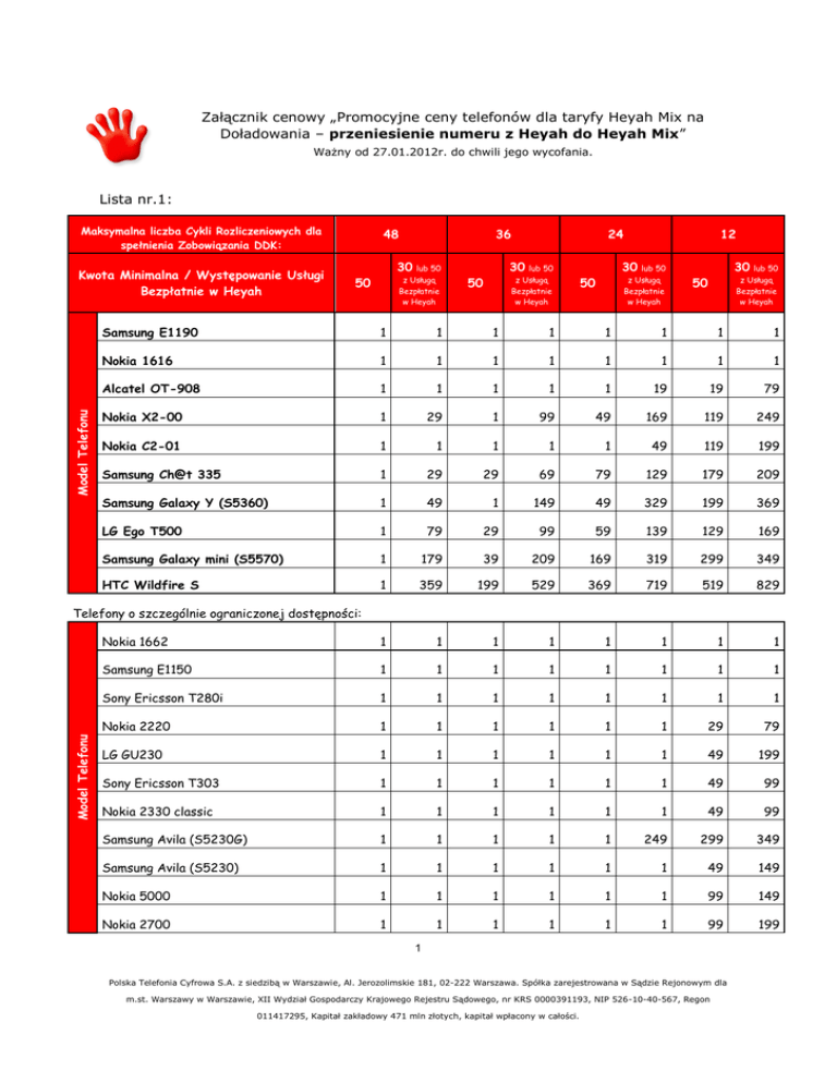 Załącznik cenowy „Promocyjne ceny telefonów dla taryfy Heyah Mix na Doładowania – przeniesienie numeru z Heyah do Heyah Mix” Ważny od 27.01.2012r. do chwili jego wycofania. Lista nr.1: Maksymalna liczba Cykli Rozliczeniowych dla spełnienia Zobowiązania DDK: Model Telefonu Kwota Minimalna / Występowanie Usługi Bezpłatnie w Heyah 48 36 30 lub 50 z Usługą Bezpłatnie w Heyah 50 24 30 lub 50 z Usługą Bezpłatnie w Heyah 50 12 30 30 lub 50 lub 50 z Usługą Bezpłatnie w Heyah 50 z Usługą Bezpłatnie w Heyah 50 Samsung E1190 1 1 1 1 1 1 1 1 Nokia 1616 1 1 1 1 1 1 1 1 Alcatel OT-908 1 1 1 1 1 19 19 79 Nokia X2-00 1 29 1 99 49 169 119 249 Nokia C2-01 1 1 1 1 1 49 119 199 Samsung Ch@t 335 1 29 29 69 79 129 179 209 Samsung Galaxy Y (S5360) 1 49 1 149 49 329 199 369 LG Ego T500 1 79 29 99 59 139 129 169 Samsung Galaxy mini (S5570) 1 179 39 209 169 319 299 349 HTC Wildfire S 1 359 199 529 369 719 519 829 Nokia 1662 1 1 1 1 1 1 1 1 Samsung E1150 1 1 1 1 1 1 1 1 Sony Ericsson T280i 1 1 1 1 1 1 1 1 Nokia 2220 1 1 1 1 1 1 29 79 LG GU230 1 1 1 1 1 1 49 199 Sony Ericsson T303 1 1 1 1 1 1 49 99 Nokia 2330 classic 1 1 1 1 1 1 49 99 Samsung Avila (S5230G) 1 1 1 1 1 249 299 349 Samsung Avila (S5230) 1 1 1 1 1 1 49 149 Nokia 5000 1 1 1 1 1 1 99 149 Nokia 2700 1 1 1 1 1 1 99 199 Model Telefonu Telefony o szczególnie ograniczonej dostępności: 1 Polska Telefonia Cyfrowa S.A. z siedzibą w Warszawie, Al. Jerozolimskie 181, 02-222 Warszawa. Spółka zarejestrowana w Sądzie Rejonowym dla m.st. Warszawy w Warszawie, XII Wydział Gospodarczy Krajowego Rejestru Sądowego, nr KRS 0000391193, NIP 526-10-40-567, Regon 011417295, Kapitał zakładowy 471 mln złotych, kapitał wpłacony w całości. Nokia 5130 XpressMusic 1 1 1 1 1 49 99 199 Sonny Ericsson Naite 1 1 1 1 1 49 99 349 Samsung Corby (S3650) 1 1 1 1 1 49 349 399 LG Bali (GM360) 1 1 1 1 1 99 249 299 Sonny Ericsson Zylo 1 1 1 1 1 99 199 229 Sony Ericsson K770i 1 1 1 1 1 299 369 449 Nokia 6300 1 1 1 1 1 249 269 379 Sony Ericsson G502 1 1 1 49 1 99 199 299 Nokia C2-02 1 1 1 49 1 219 49 319 Nokia C3 1 1 1 49 1 199 319 369 Nokia 6303/6303i classic 1 1 1 49 1 249 349 399 Samsung Delphi (B3410) 1 1 1 49 1 299 359 439 Nokia 5230 1 1 1 99 49 249 399 449 Sony Ericsson W595 1 1 1 149 69 349 549 599 Nokia 5310 1 1 1 159 99 269 349 399 Nokia 7230 1 49 1 129 49 199 99 249 Sony Ericsson W595 flower 49 49 49 249 149 399 599 649 Sony Ericsson C702 69 69 69 299 269 469 539 599 Samsung Wave 533 1 1 1 99 49 209 389 429 Cena za telefony podana jest w złotych i zawiera podatek VAT. 2 Polska Telefonia Cyfrowa S.A. z siedzibą w Warszawie, Al. Jerozolimskie 181, 02-222 Warszawa. Spółka zarejestrowana w Sądzie Rejonowym dla m.st. Warszawy w Warszawie, XII Wydział Gospodarczy Krajowego Rejestru Sądowego, nr KRS 0000391193, NIP 526-10-40-567, Regon 011417295, Kapitał zakładowy 471 mln złotych, kapitał wpłacony w całości.